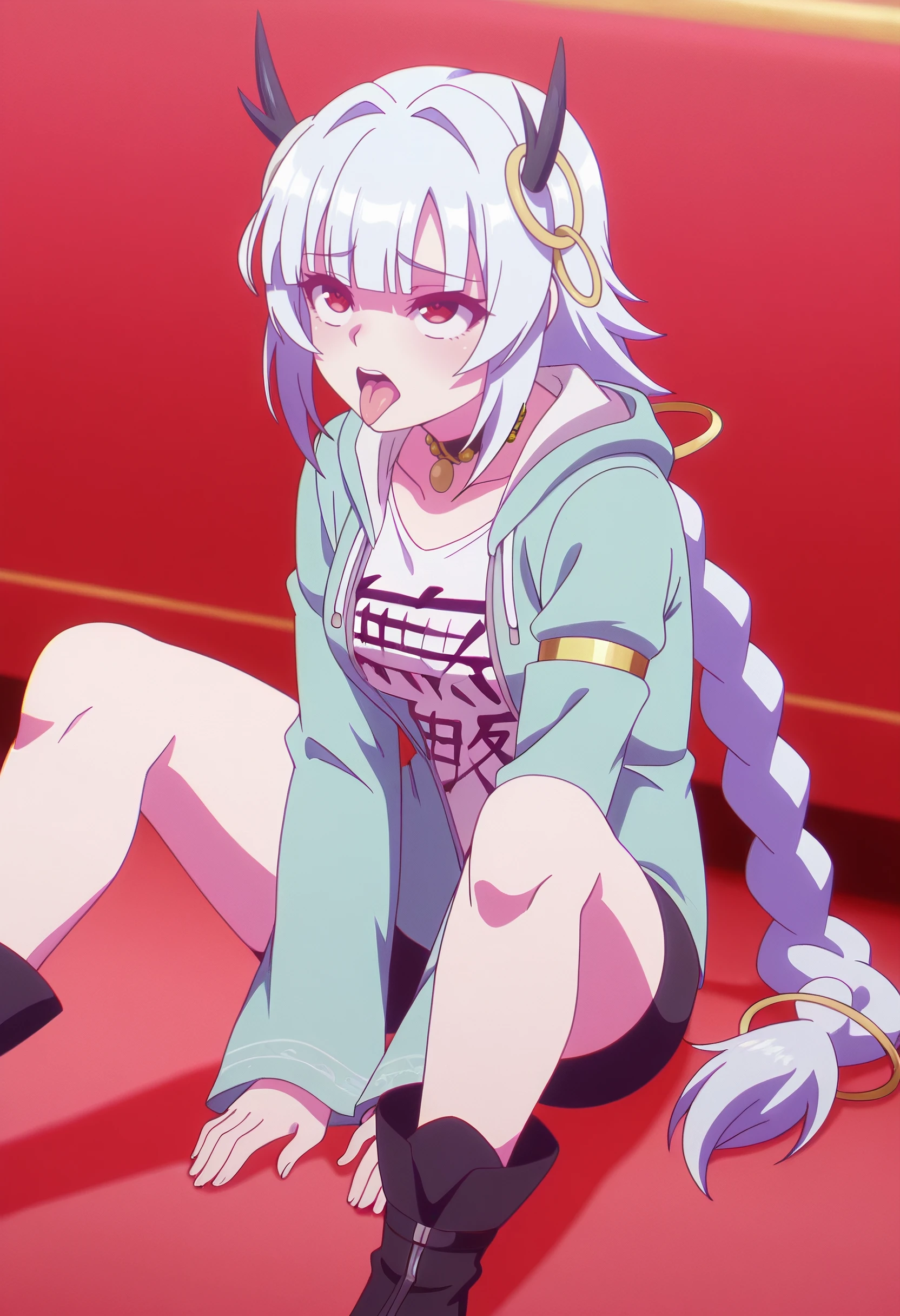 UroborosJacket, aqua jacket, long sleeves, white shirt, hooded jacket, hood down, open jacket, jewelry, black shorts, necklace, black footwear, boots, black choker, clothes writing, short shorts, zipper, partially unzipped,