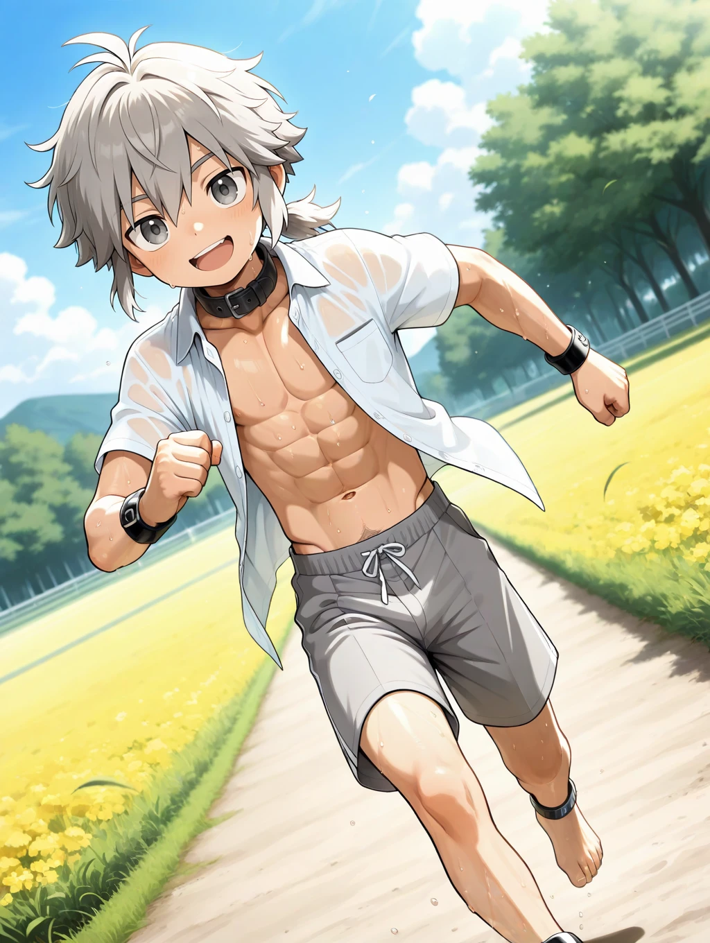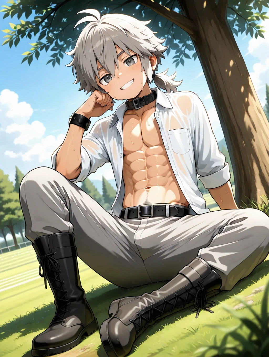 White shirt slightly open, giving off a relaxed, carefree vibe