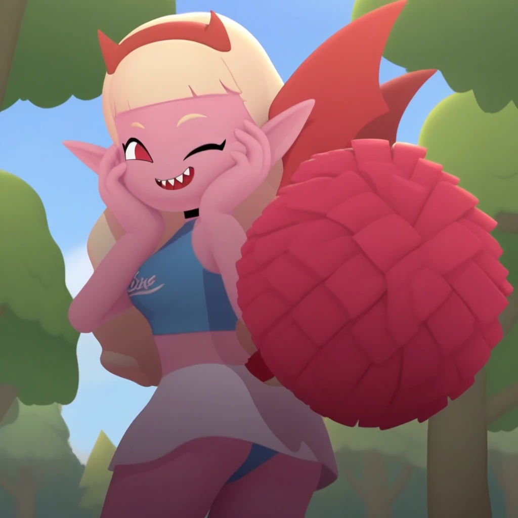 Desire Queen, red_eyes, white shirt, short skirt, choker, breasts, crop top shirt, red_horns, black_choker, pointy_ears, horns, long_hair, ponytail, blonde_hair, teeth