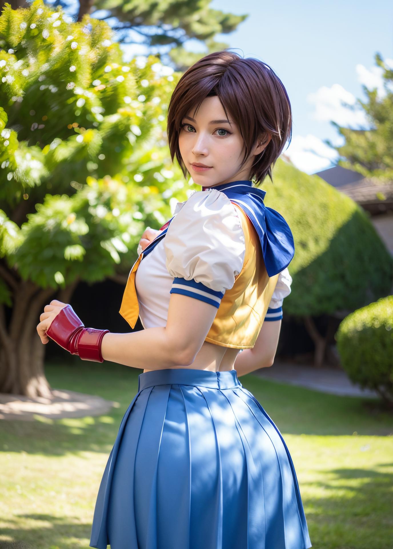 • Sakura [ enjinight, 1girl, kasugano sakura, school uniform, solo, skirt, brown hair, headband, gloves, serafuku, short hair, sailor collar, realistic, fingerless gloves, brown eyes, blue sailor collar, lips, tree, looking back, outdoors ]