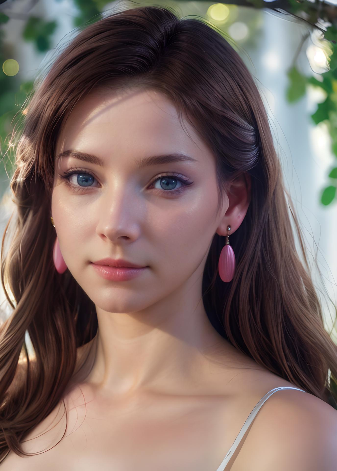 • Pink Dress: [ enjinight, 1girl, solo, jewelry, earrings, realistic, breasts, brown hair, lips, medium breasts, blue eyes, long hair, pink dress, upper body, blurry ]