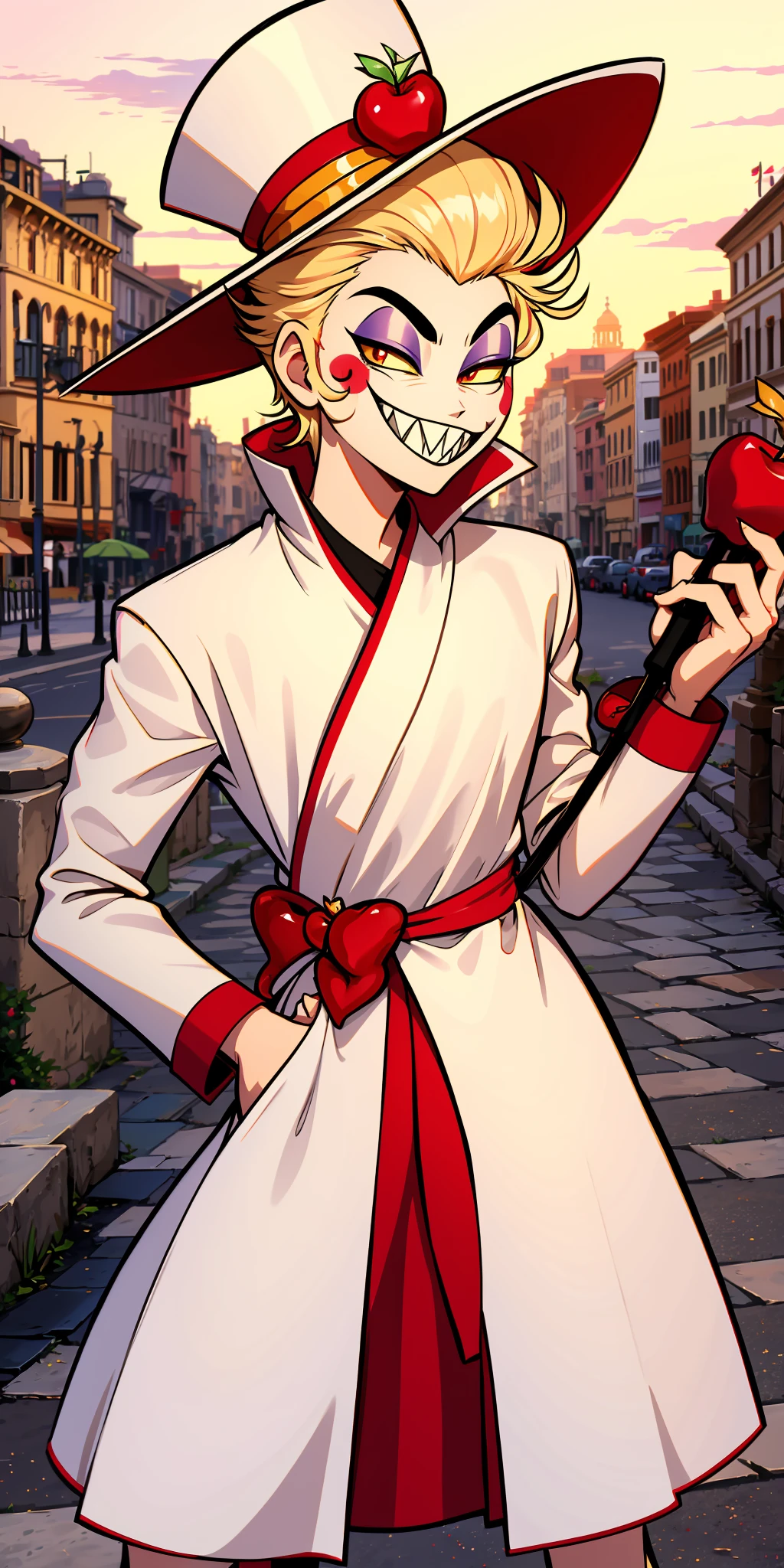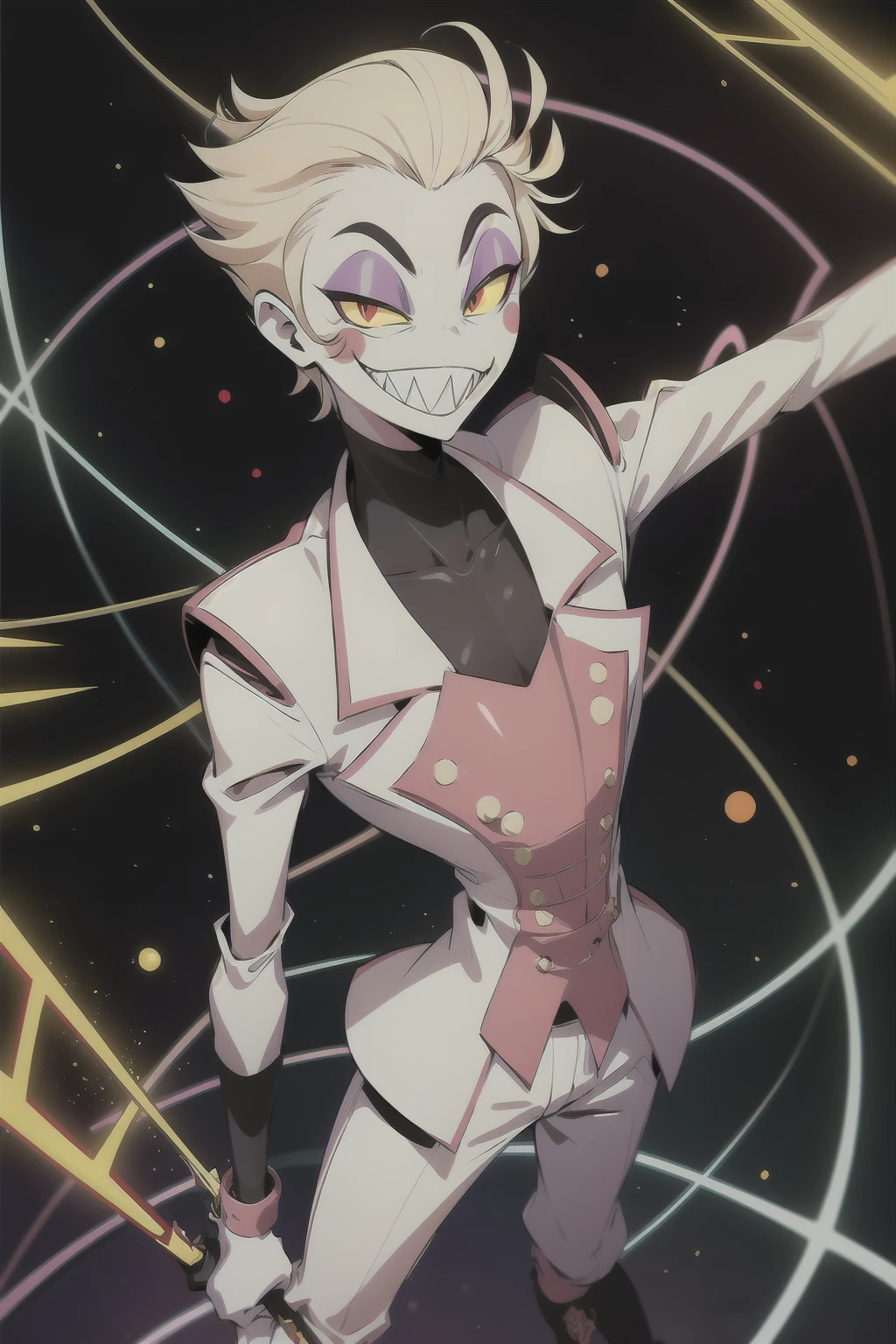 (masterpiece), best quality, 1boy, (perfect face, blush stickers, grin, sharp teeth, colored skin, makeup), 1boy, male focus, (blonde hair, short hair), (red eyes), <lora:Lucifer-003:0.8>