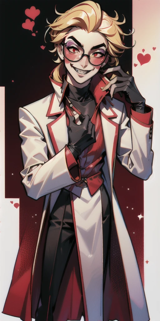 Appearance: (perfect face, blush stickers, grin, sharp teeth, colored skin, makeup), (1boy, male focus, solo), (blonde hair, short hair), (red eyes)