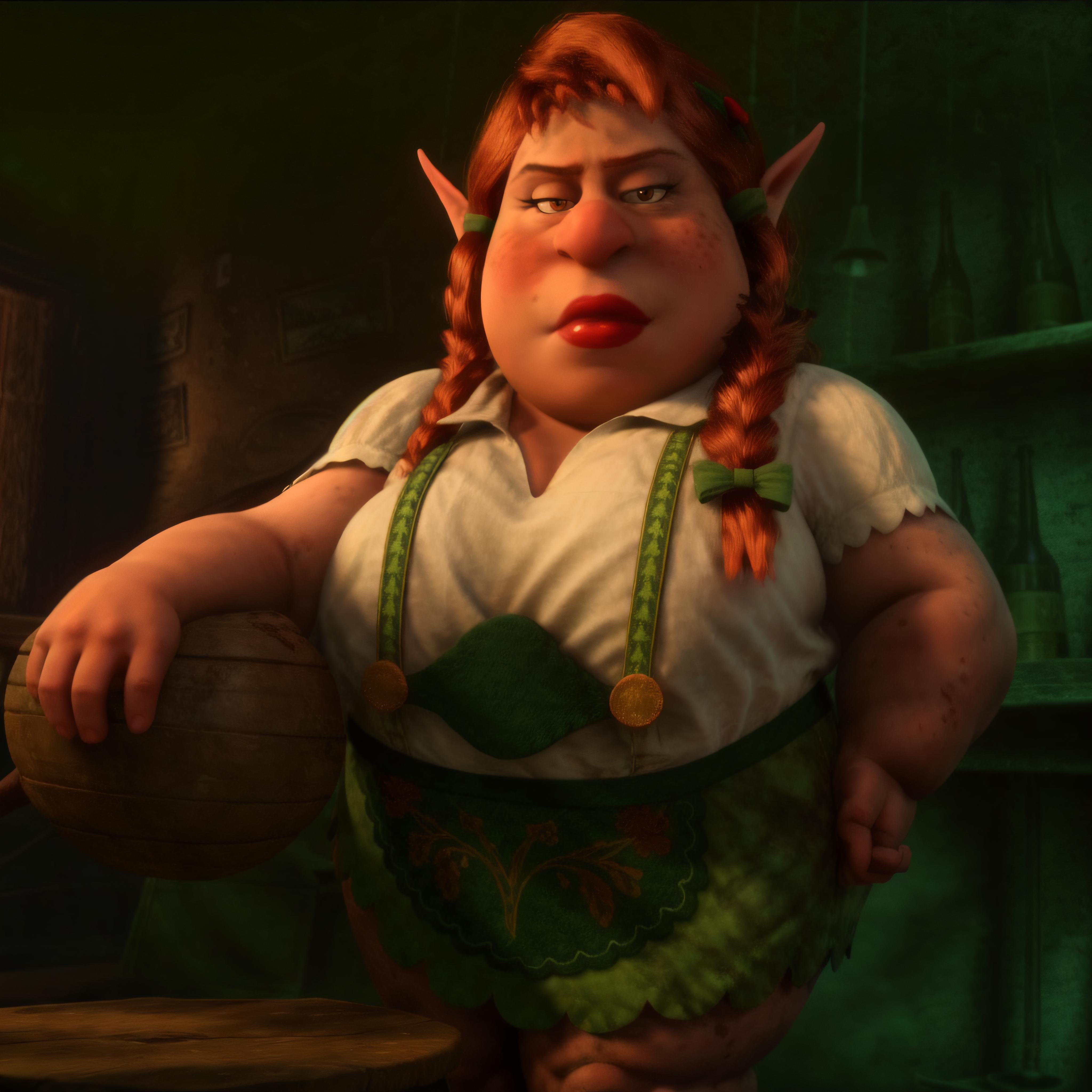 obese, female, elf, dirty white shirt, dirty green skirt, brown shoes, red hair in pigtails, red lipstick