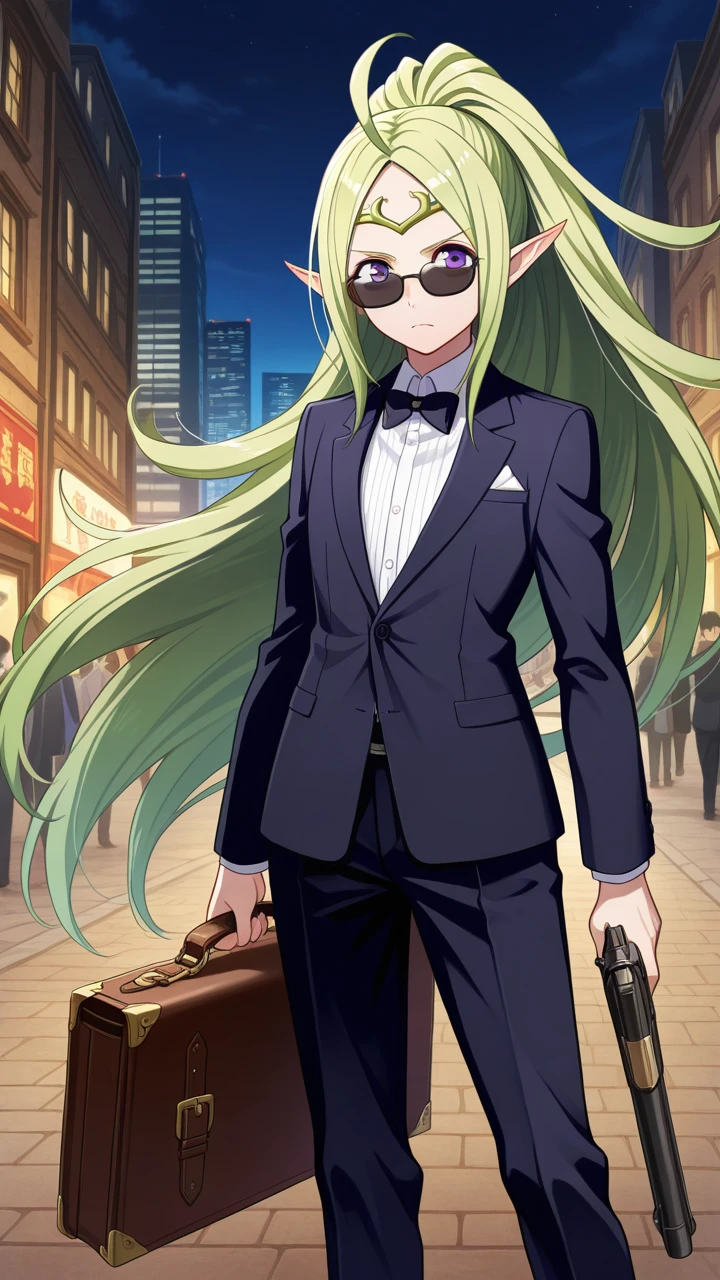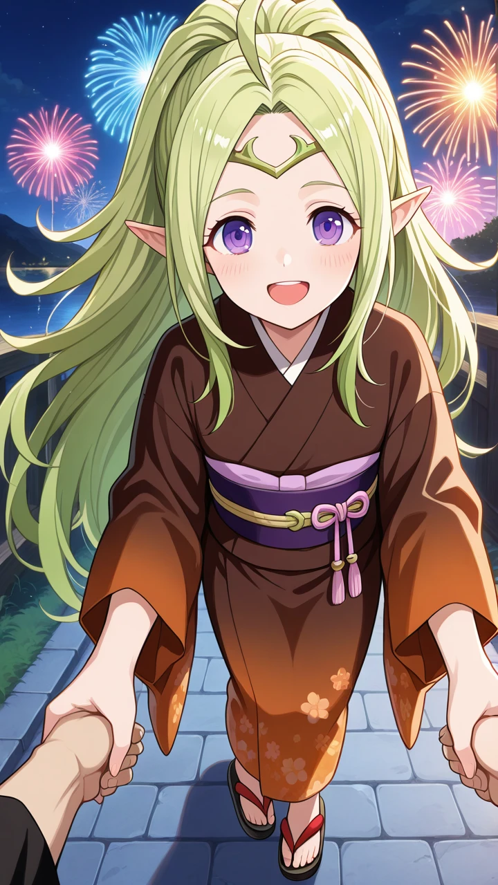 nowi (fire emblem), green hair, blonde hair, long hair, very long hair, parted bangs, purple eyes, ahoge, pointy ears, ponytail, high ponytail, tiara, circlet, sidelocks, gradient hair, Default outfit :