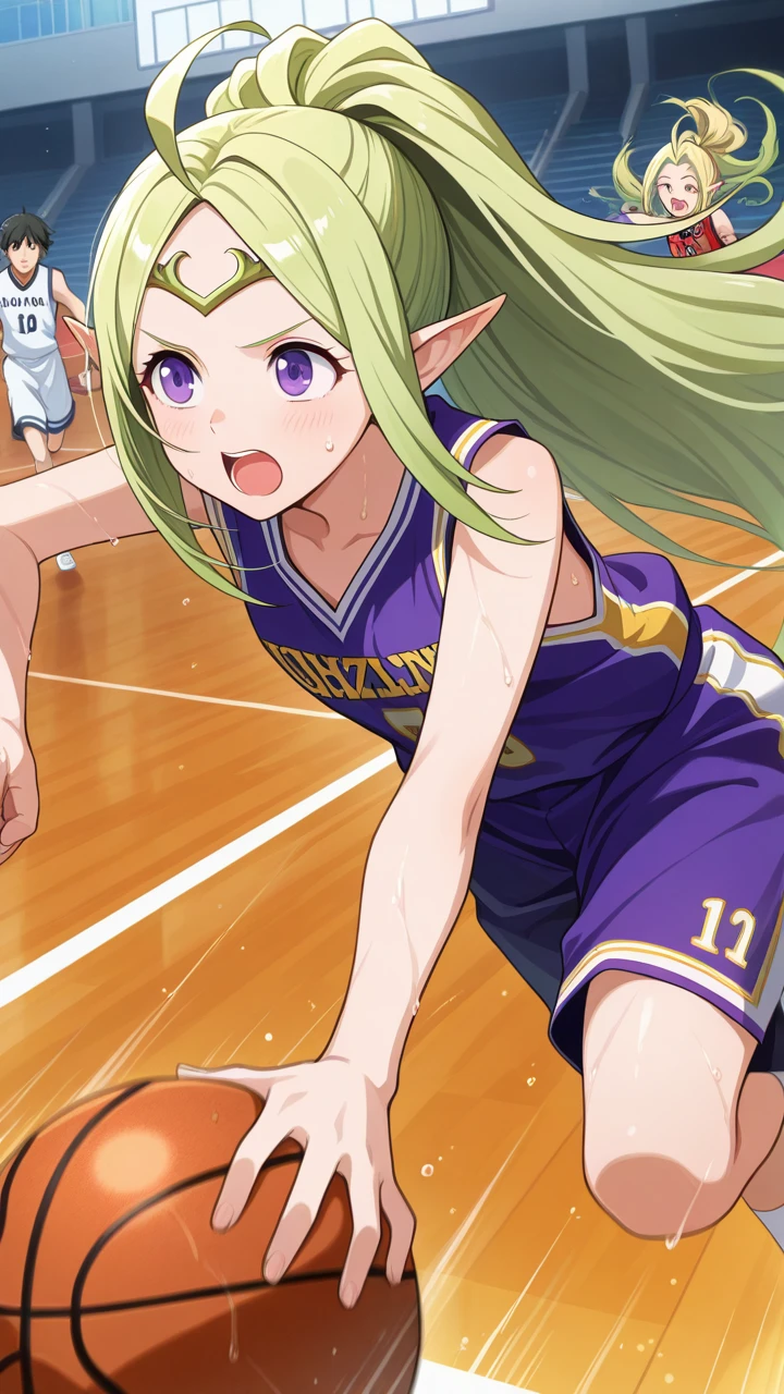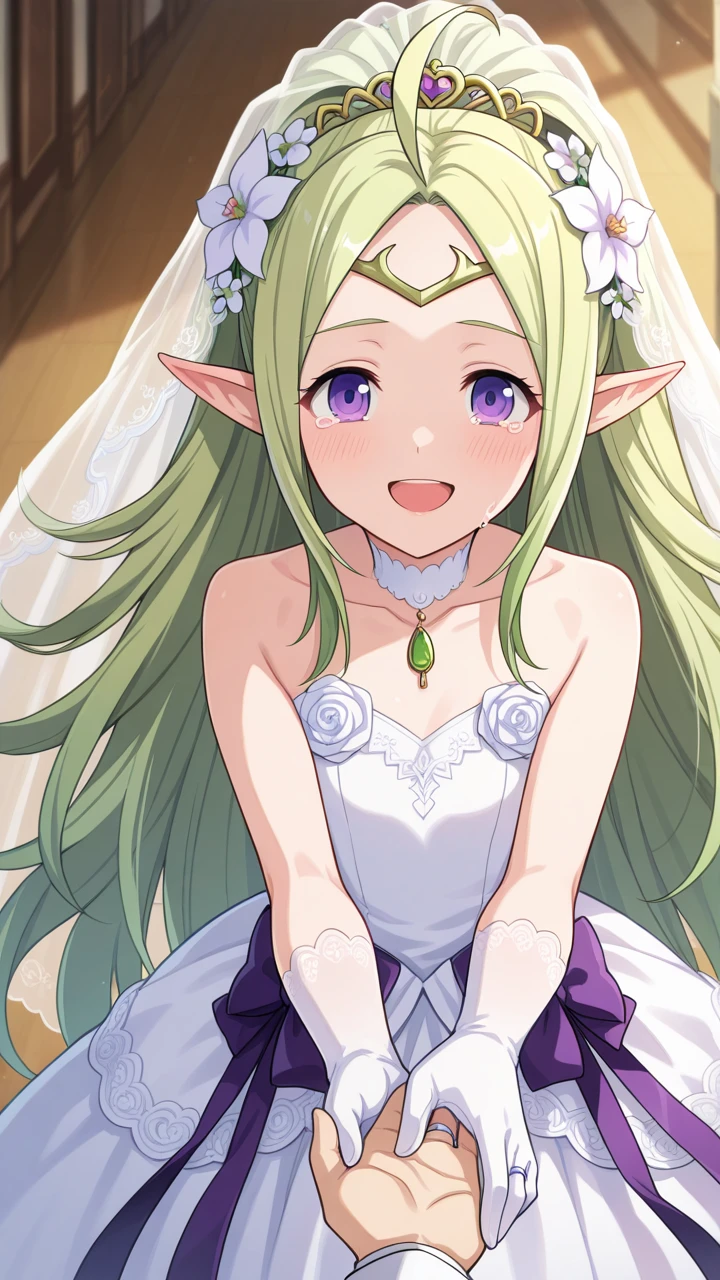 nowi (fire emblem), green hair, blonde hair, long hair, very long hair, parted bangs, purple eyes, ahoge, pointy ears, ponytail, high ponytail, tiara, circlet, sidelocks, gradient hair,