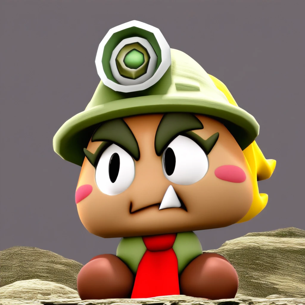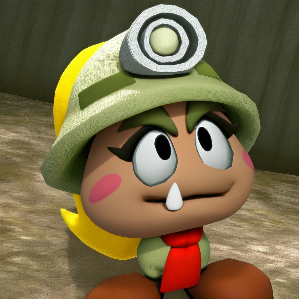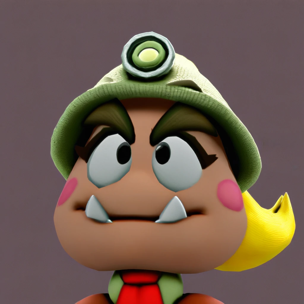 Goombella, anthro, pink Goomba, black eyes, big eyebrows, fang in mouth, blonde ponytail, green exporting hat, light on hat, red scarf, brown boots, armsless, legsless
