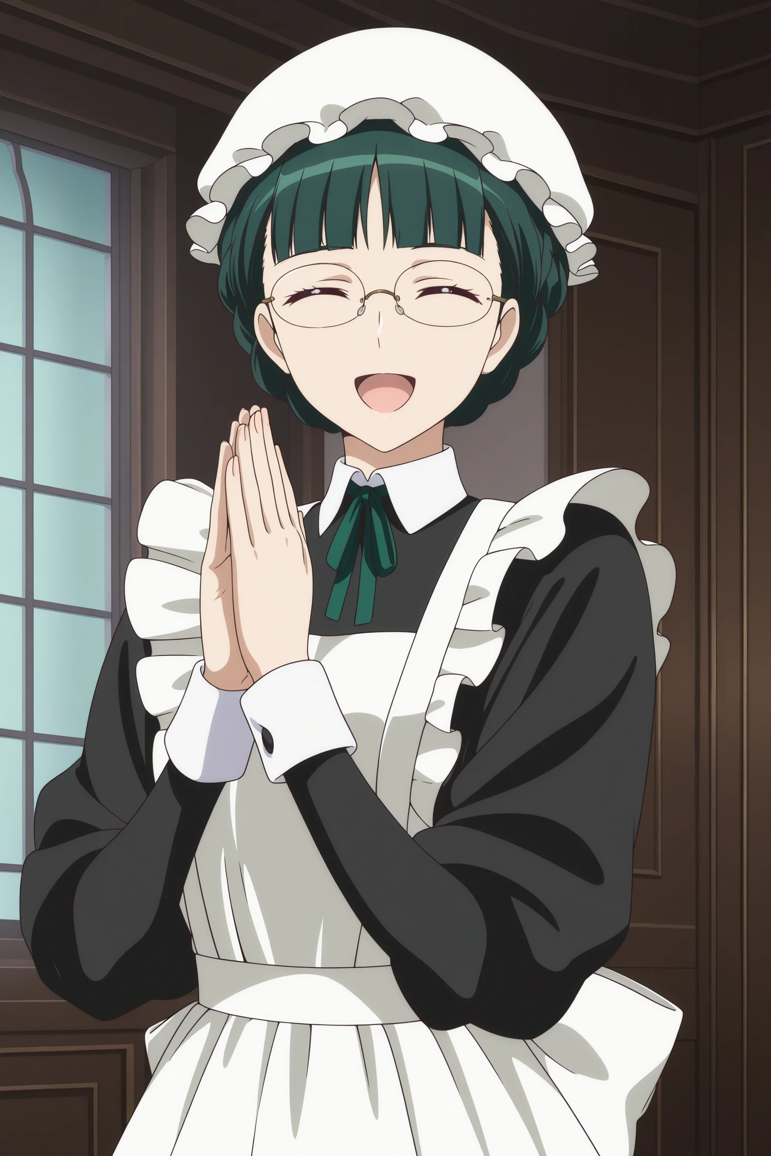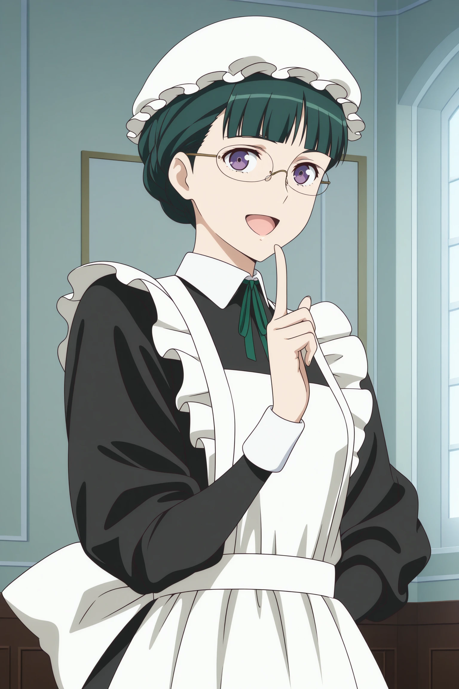 maid-chou, short hair, green hair, mob cap, bun with braided base, center-flap bangs, purple eyes, rimless eyewear, maid, long sleeves, black dress, long dress, maid apron, neck ribbon, green ribbon, back bow