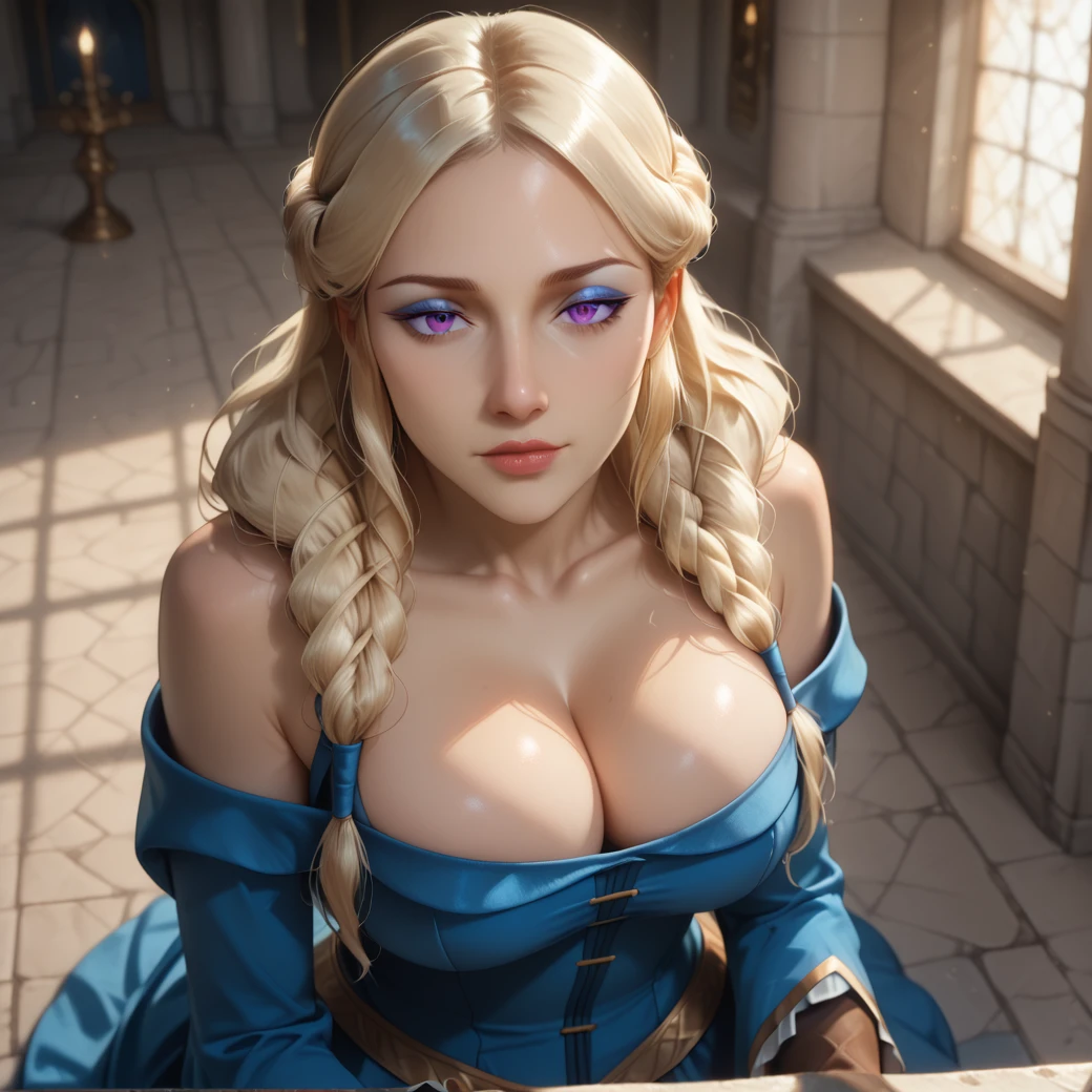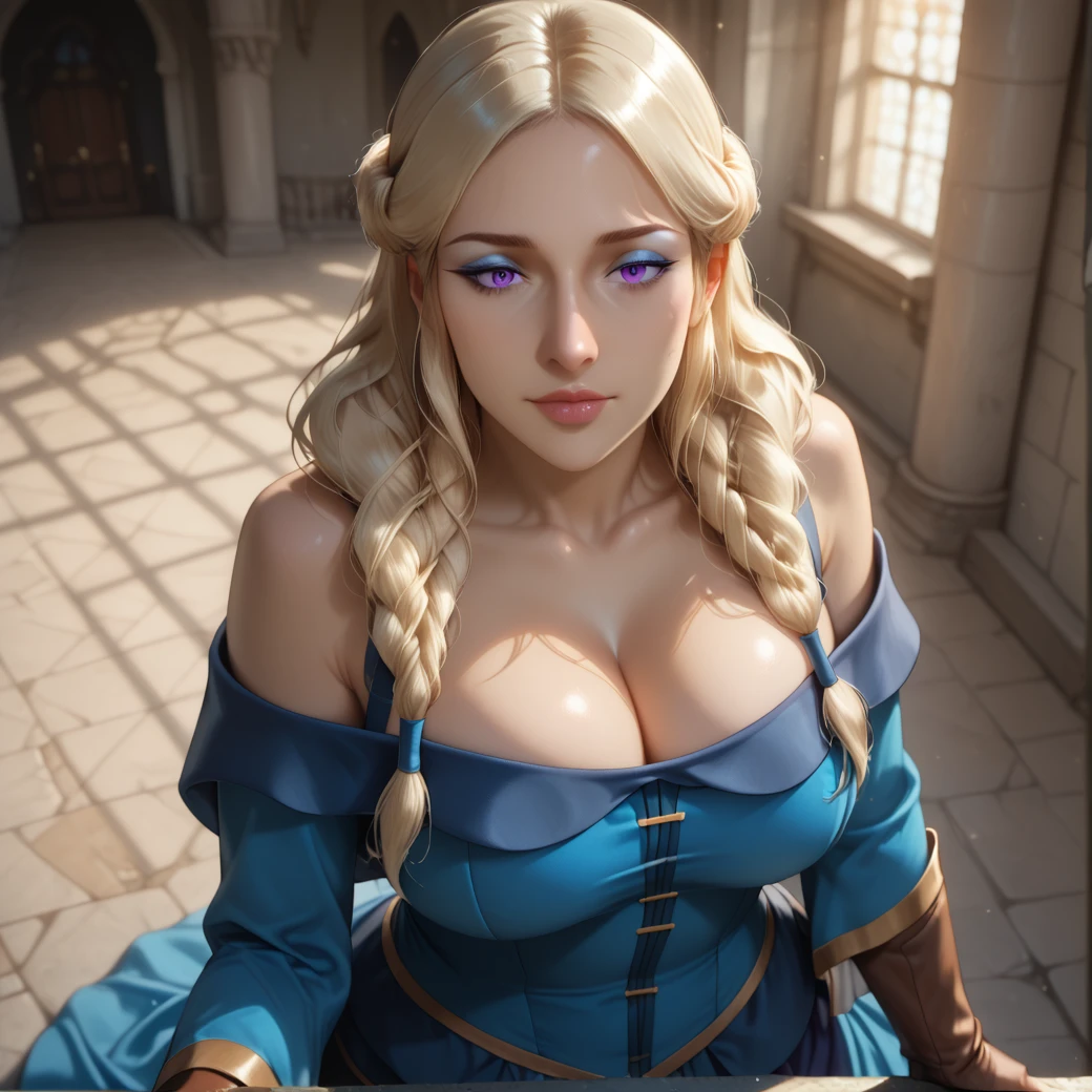 allura vysoren, long hair, blonde hair, twin braids, purple eyes, makeup, blue eye shadow, dress, brown high heel knee boots