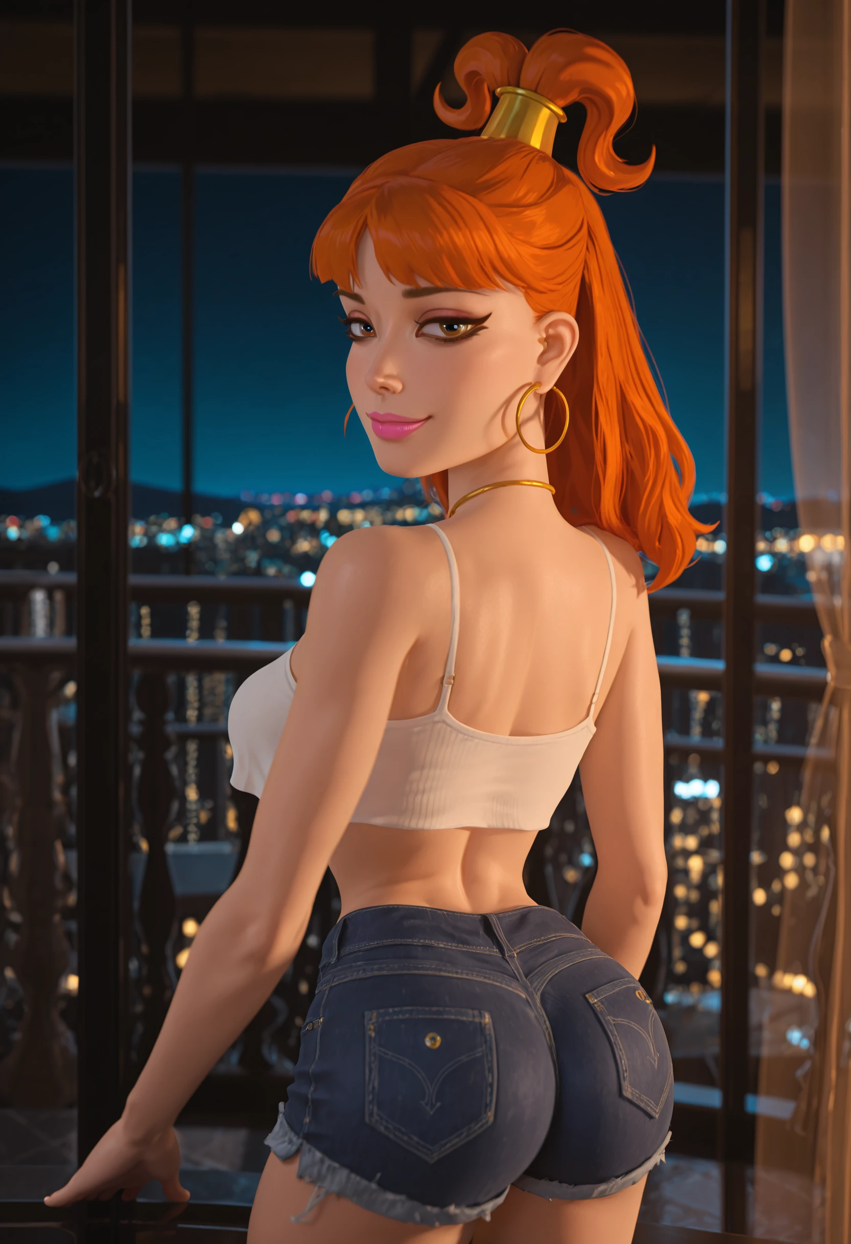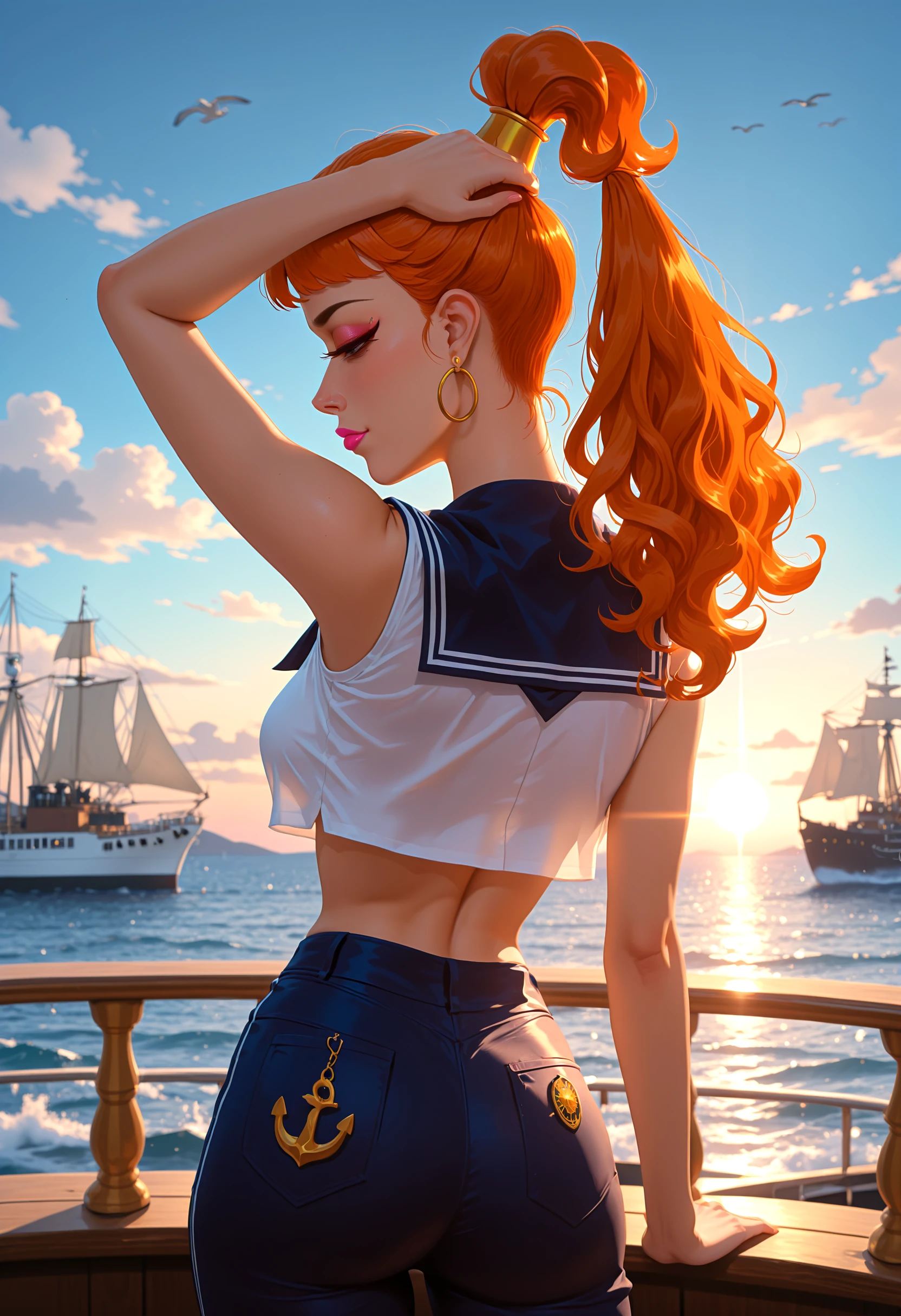 ποΈ Core features (always present):1girl, brown eyes, orange hair, long hair, ponytail, gold hair ornament, makeup, lipstick, pink lipstick