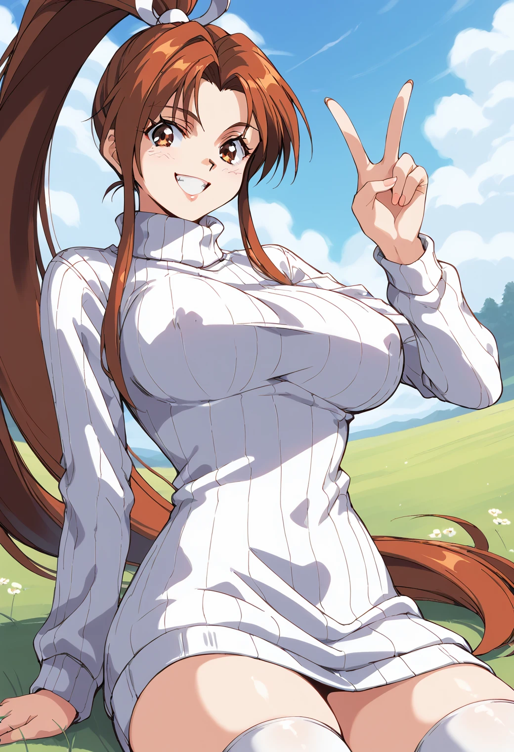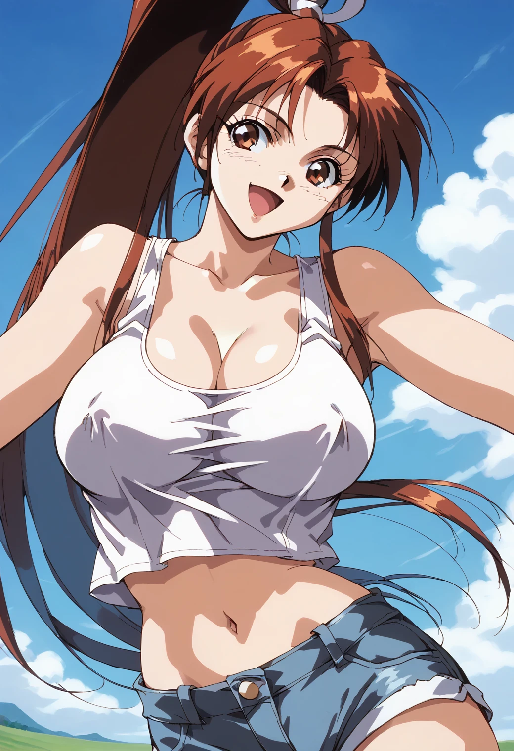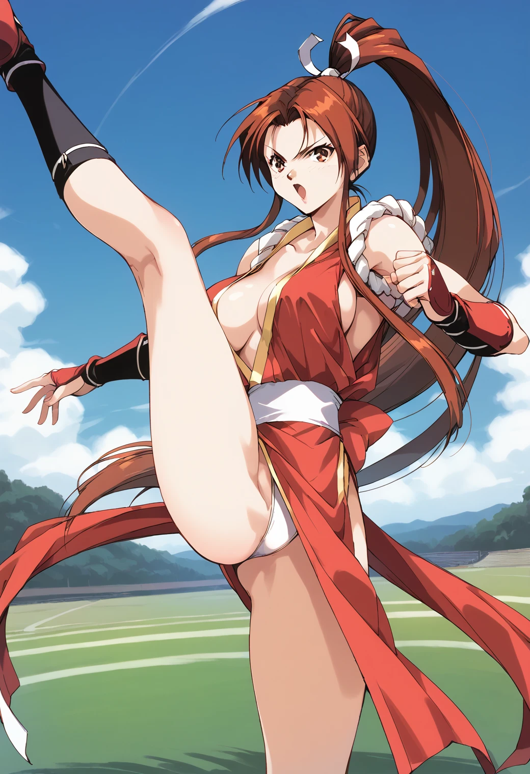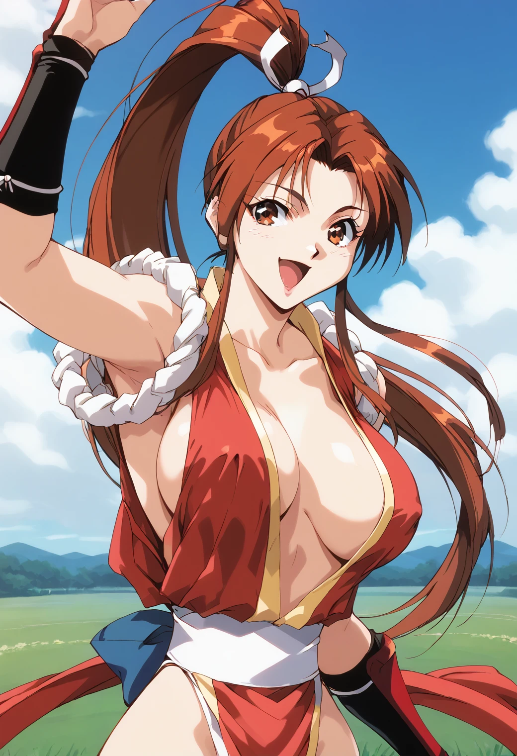 Trigger word: shiranui_mai, fatal_fury, retro artstyle, brown eyes, brown hair, high ponytail,