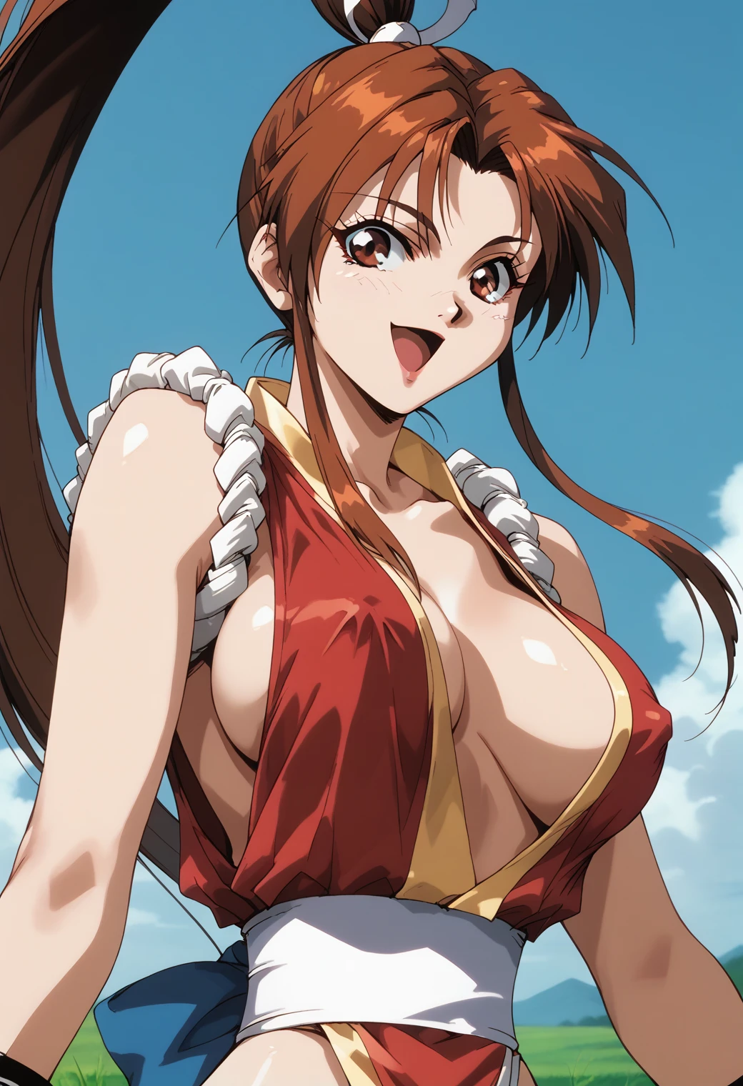 shiranui_mai, fatal_fury, retro artstyle, brown eyes, brown hair, high ponytail, long ponytail, japanese clothes, revealing clothes, cleavage,