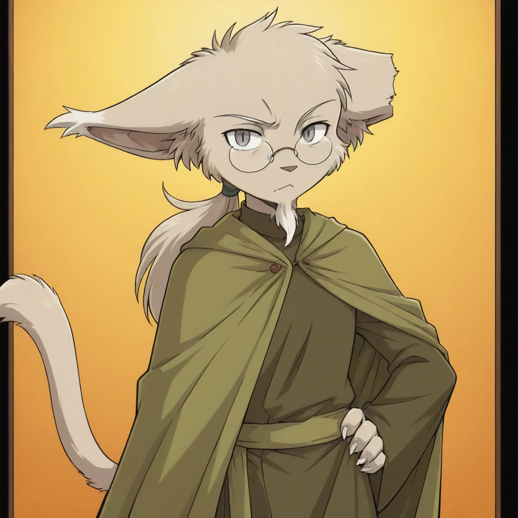 Tags to create: basitin, feline tail, anthro, goatee, ponytail, round glasses, green cloak , dark green robe , green belt, mana stone necklace, brown cane, torn ear, gray claws,
