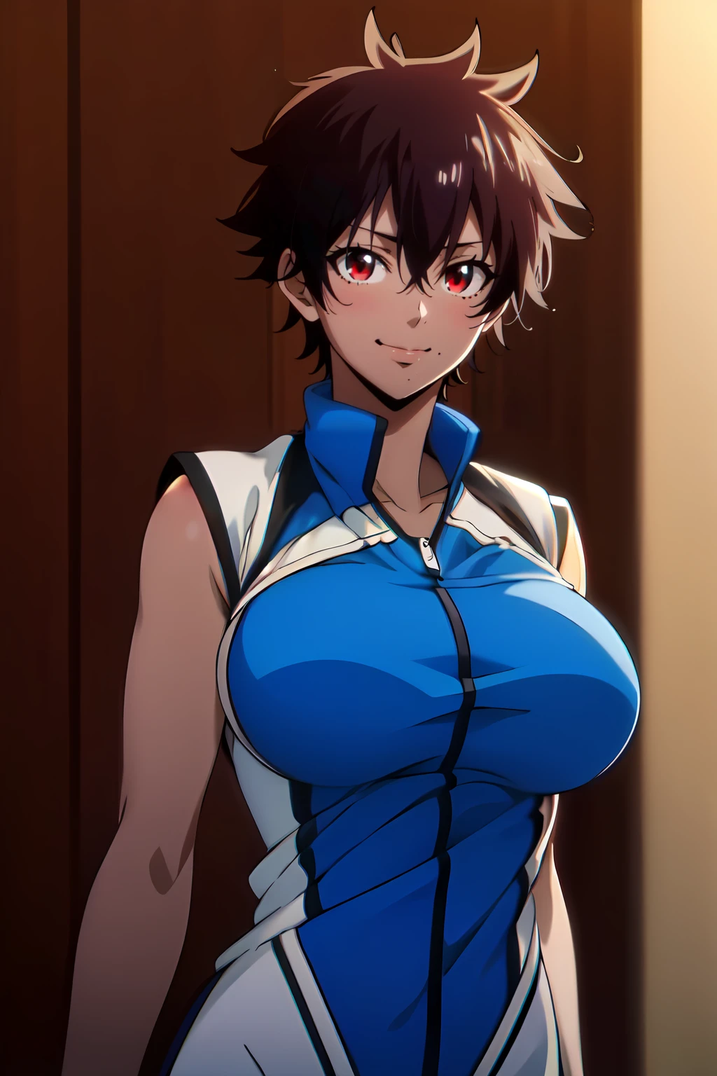 tomboy,large breasts,mole under mouth,red eyes,brown hair,short hair,spiky hair