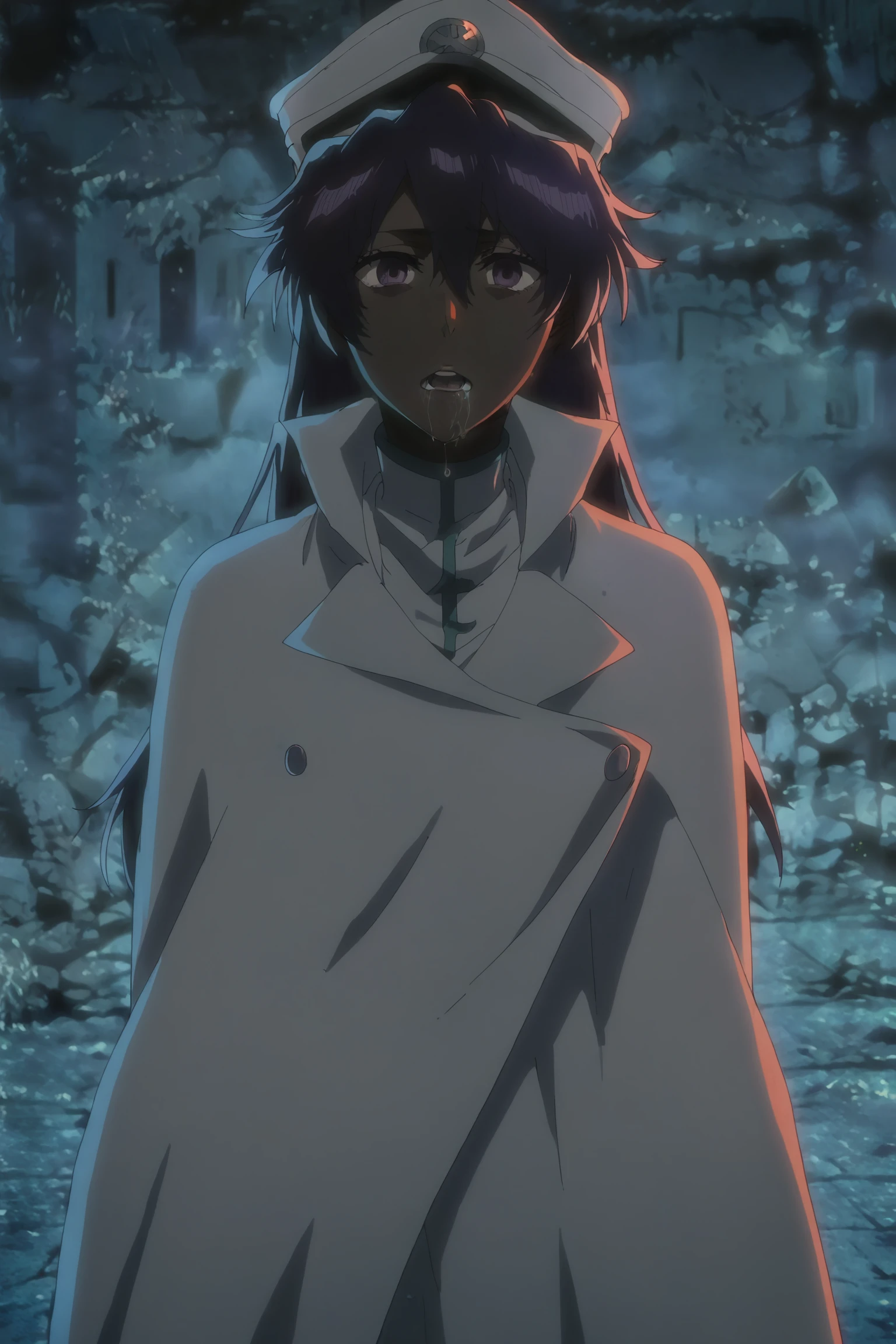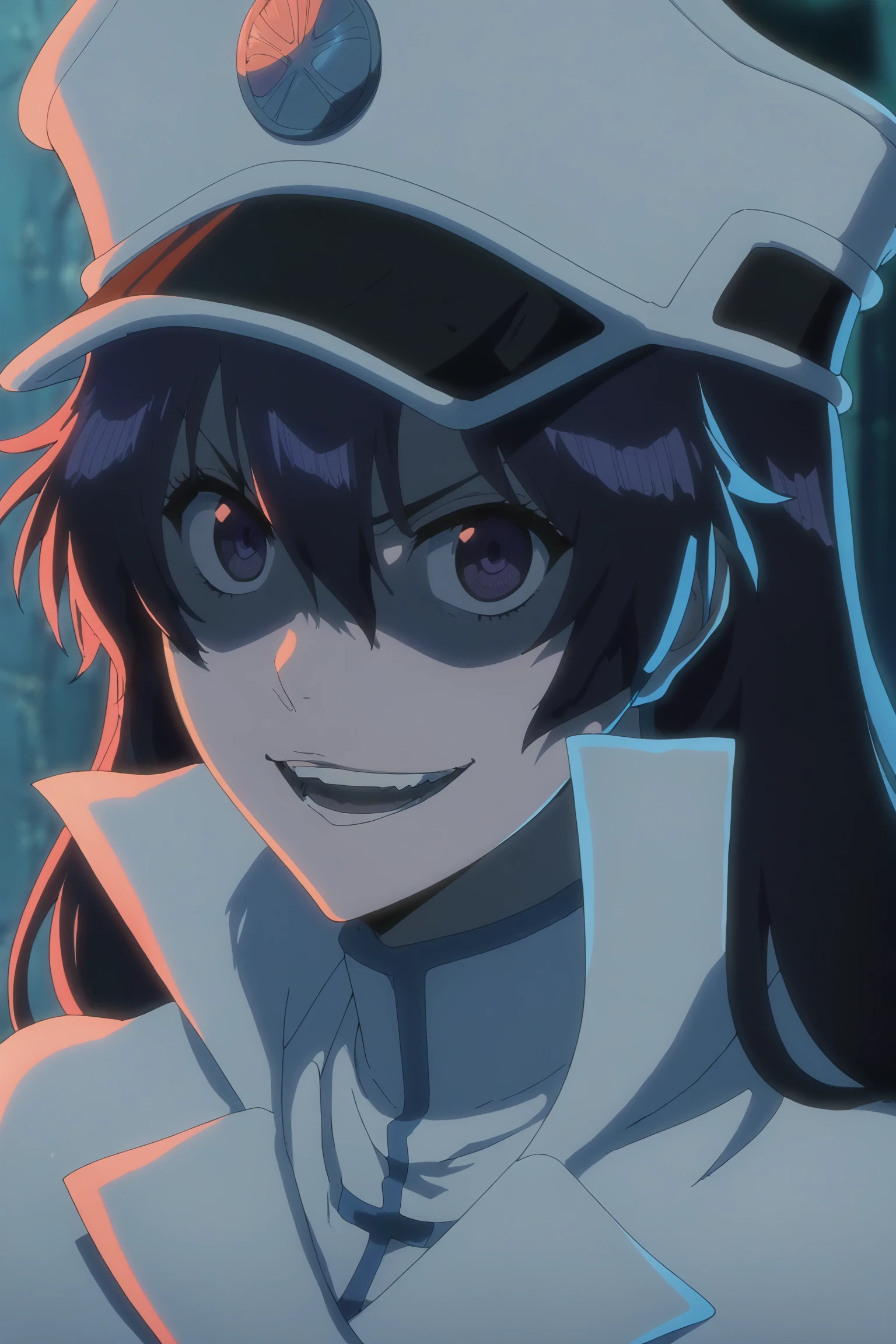 Bambietta normal outfit | hat, peaked cap, white headwear, white gloves, military uniform, pleated skirt, belt, knee boots, | white cape | cleavage | dirty, injury, hair over one eye