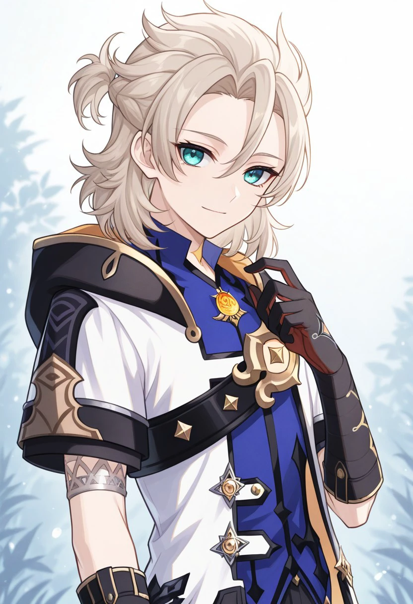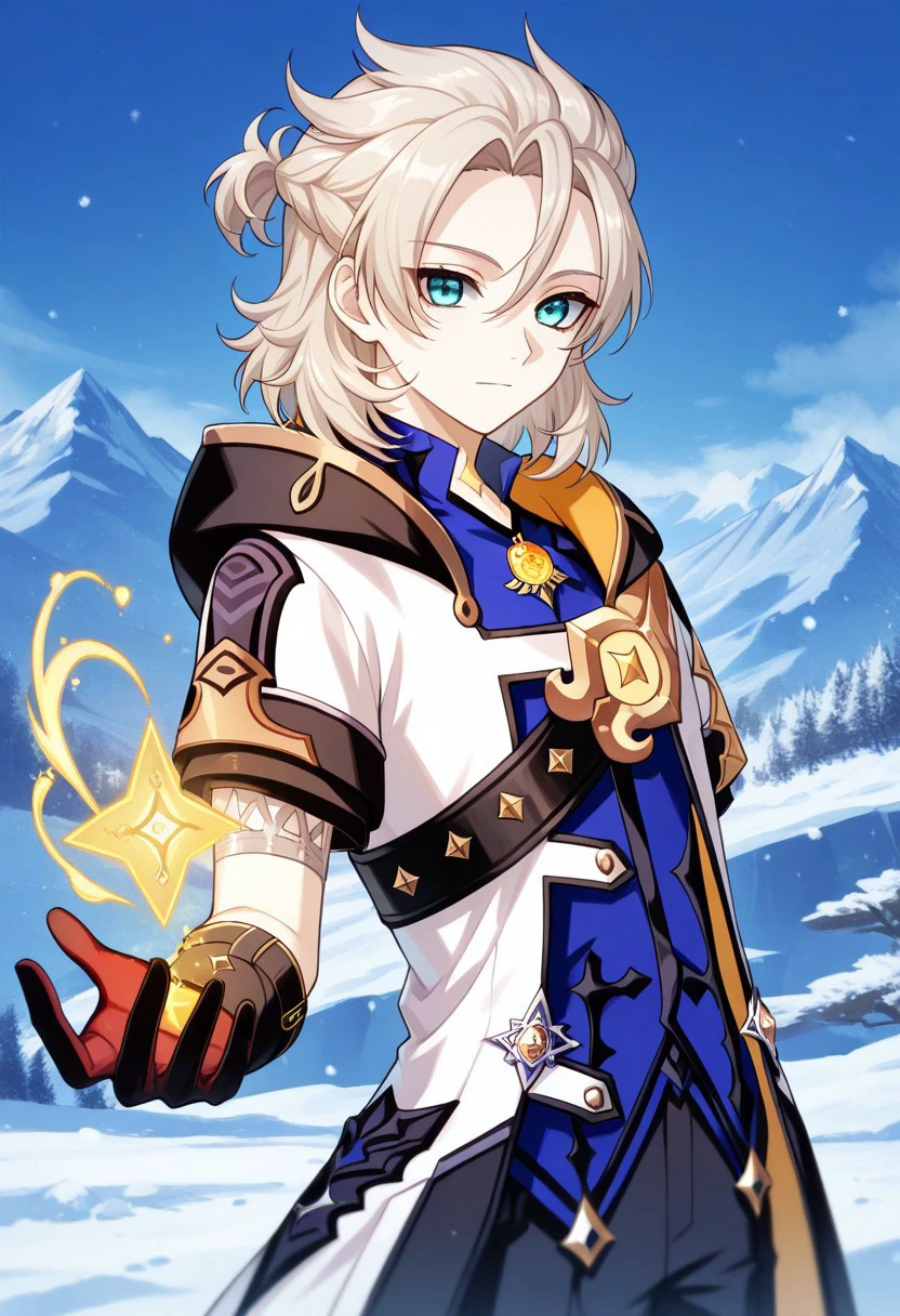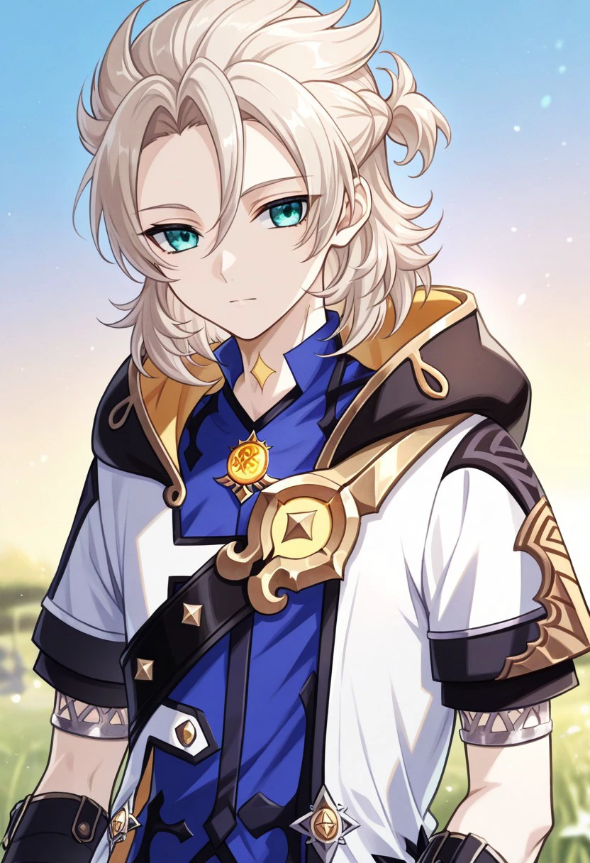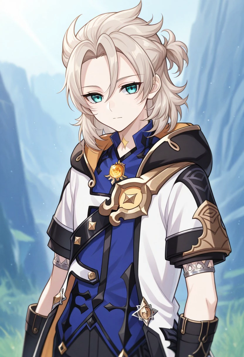 albedo, 1boy, male focus, solo, aqua eyes, blonde hair, medium hair, side braid, hair between eyes, parted bangs, short ponytail, star (symbol), tattoo, tattoo on neck, shirt, blue shirt, vision (genshin impact), short sleeves, coat, white coat, hooded coat, hood, hood down, open coat, open clothes, shoulder belt, gloves, black gloves, shorts, black shorts, black pantyhose, thigh boots, black footwear,