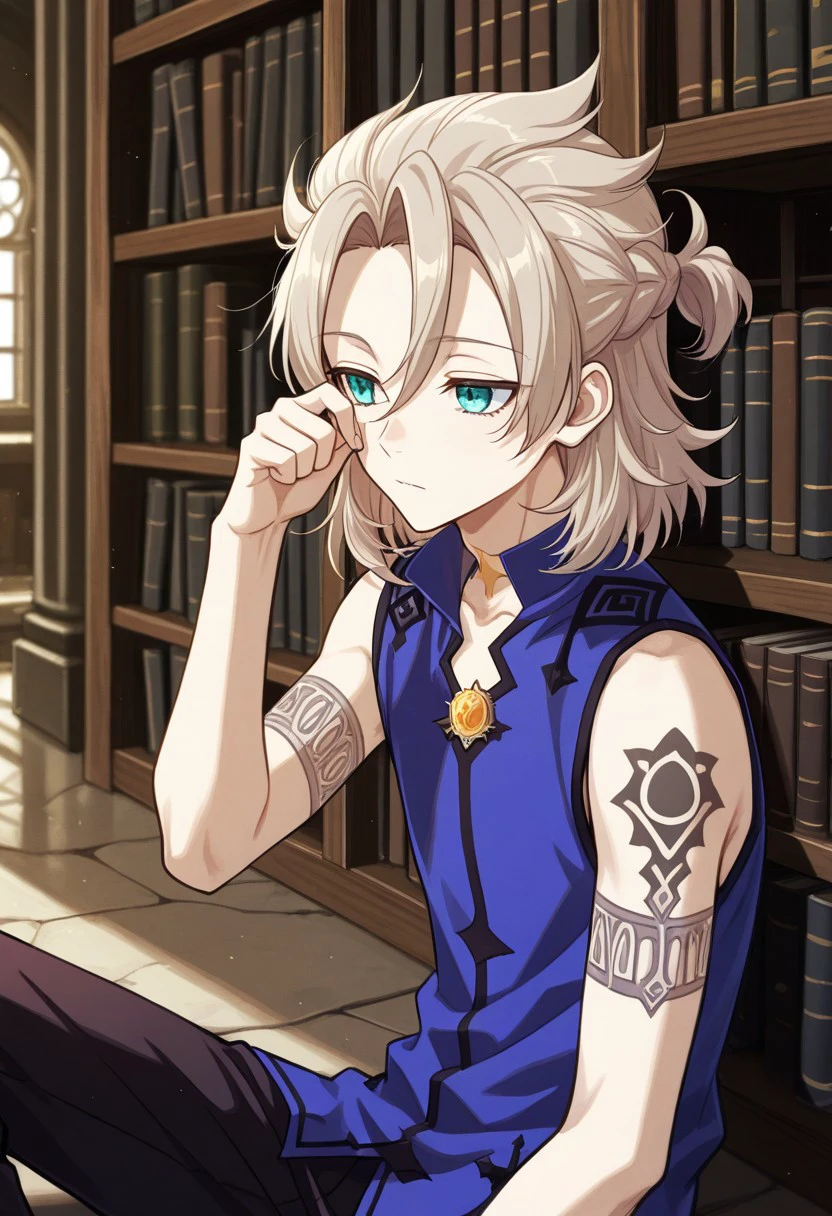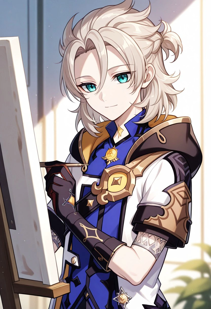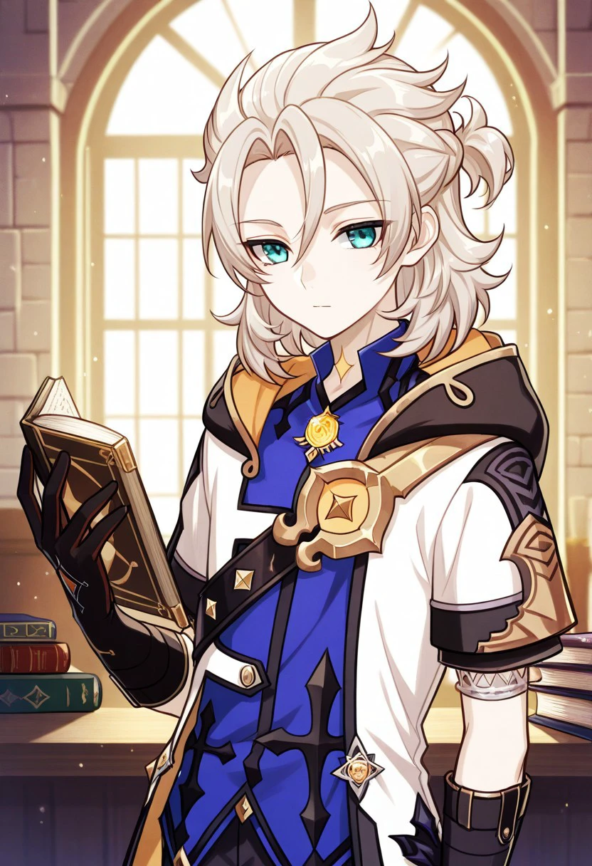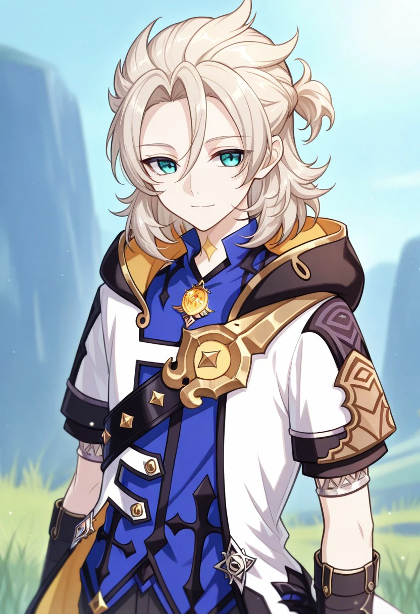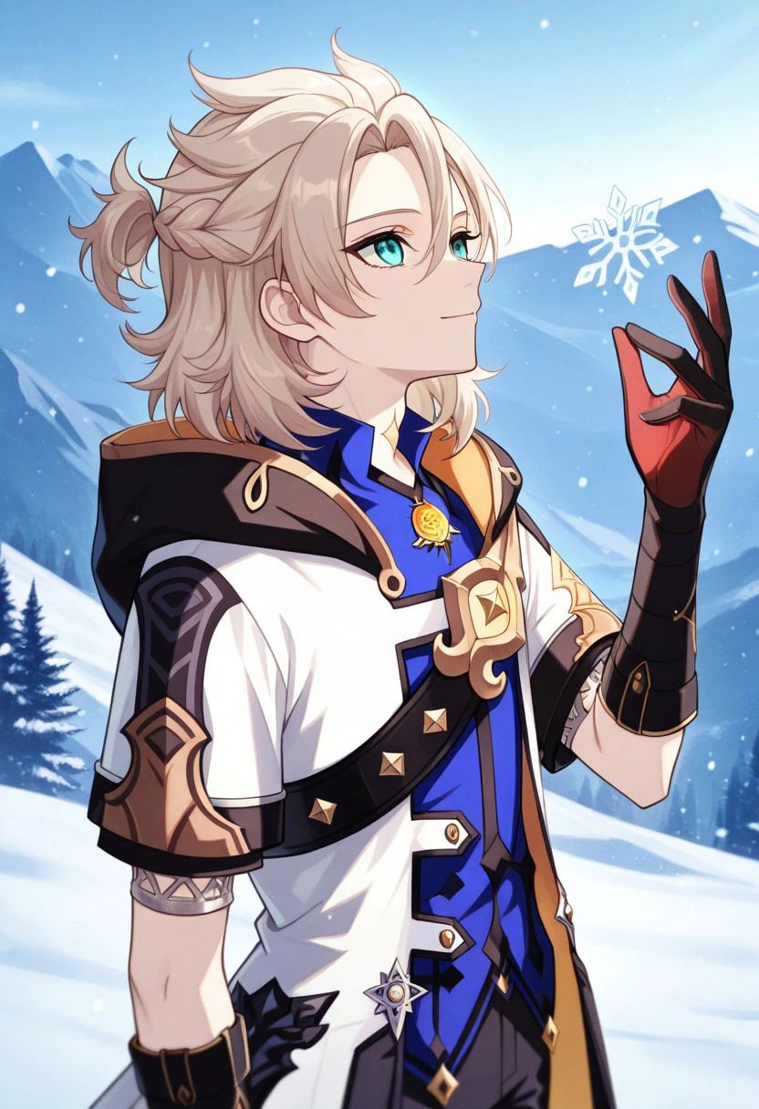 albedo, 1boy, male focus, solo, aqua eyes, blonde hair, medium hair, side braid, hair between eyes, parted bangs, short ponytail, star (symbol), tattoo, tattoo on neck, shirt, blue shirt, vision (genshin impact), short sleeves, coat, white coat, hooded coat, hood, hood down, open coat, open clothes, shoulder belt, gloves, black gloves, shorts, black shorts, black pantyhose, thigh boots, black footwear,