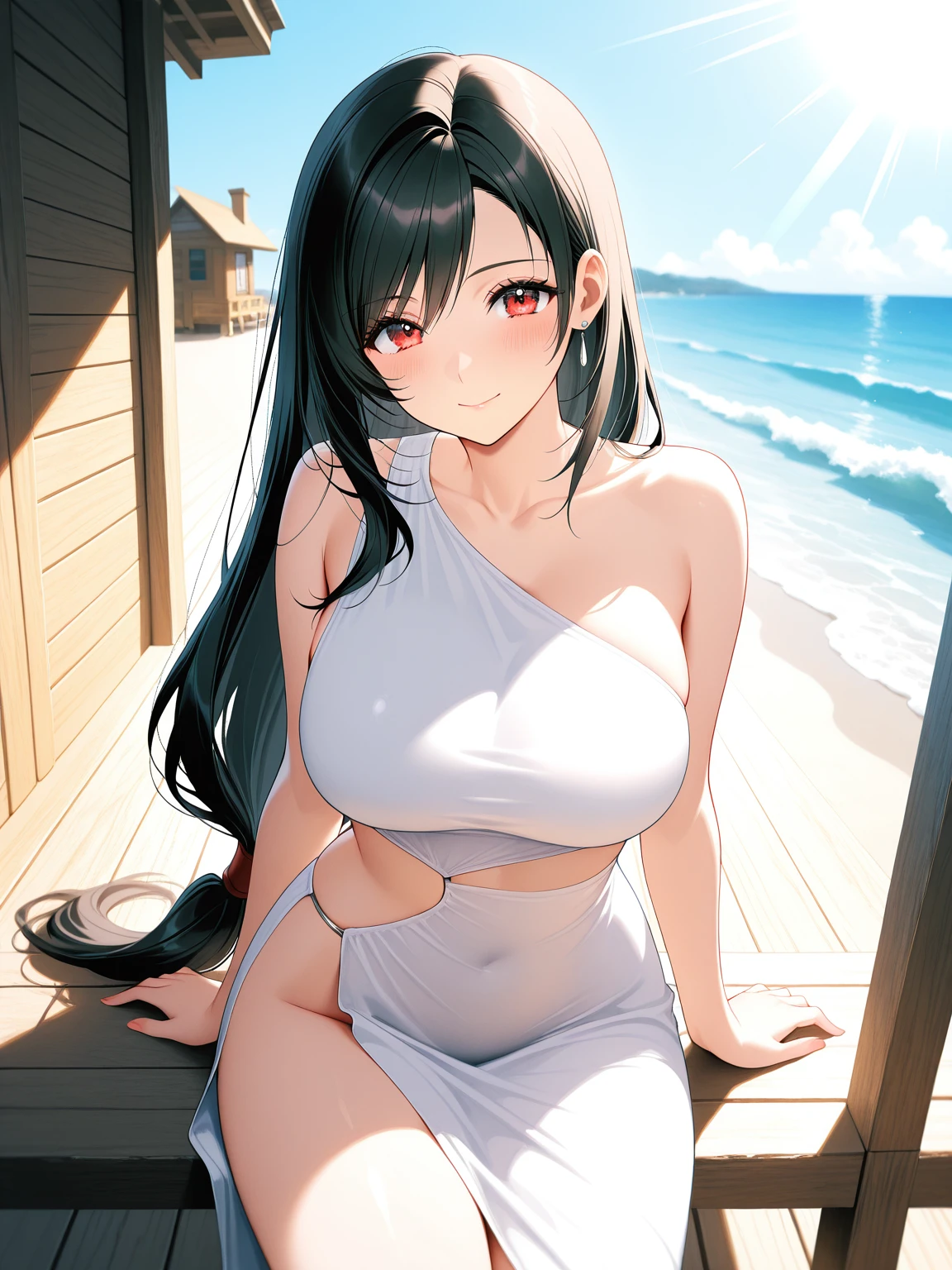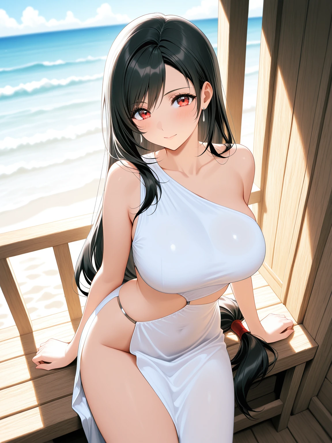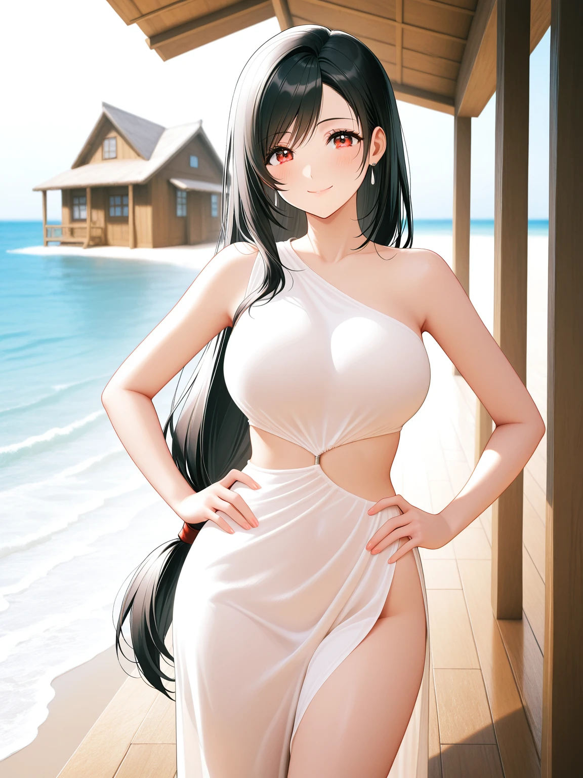 white dress,side slit,sleeveless dress,sideless,single strap,bare shoulders,asymmetrical clothes,