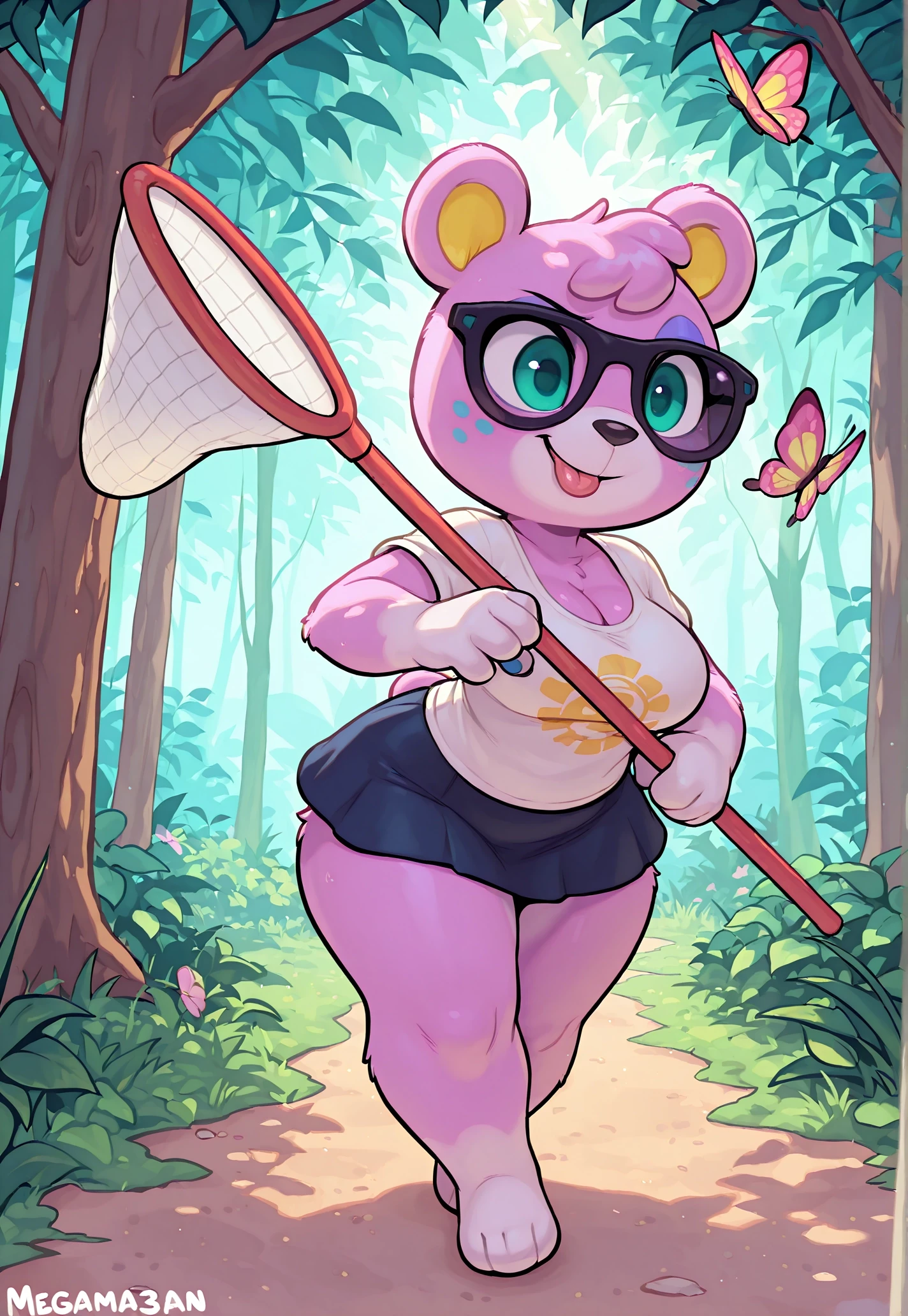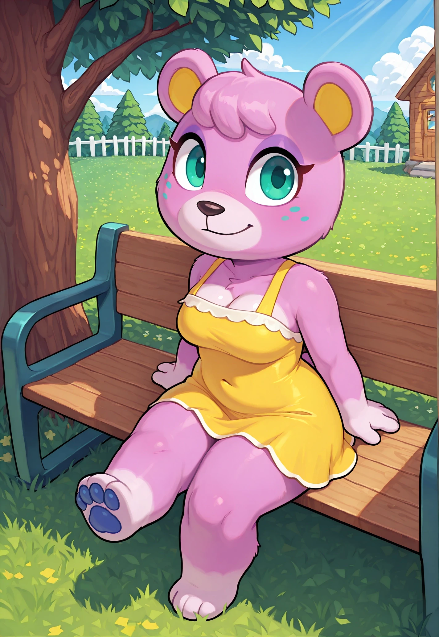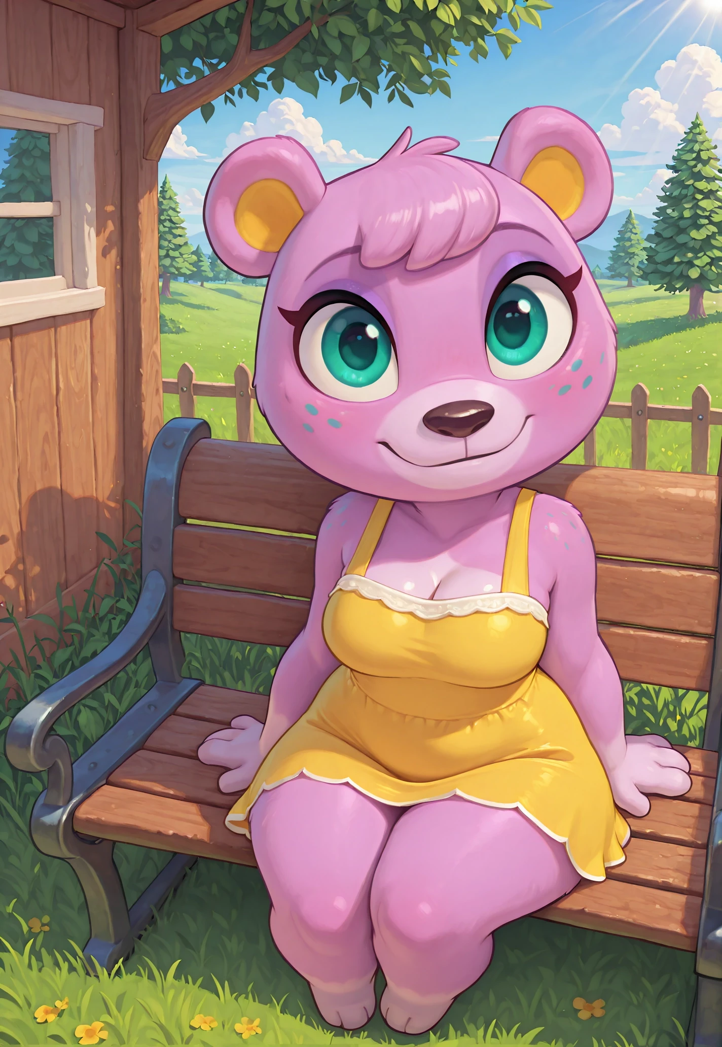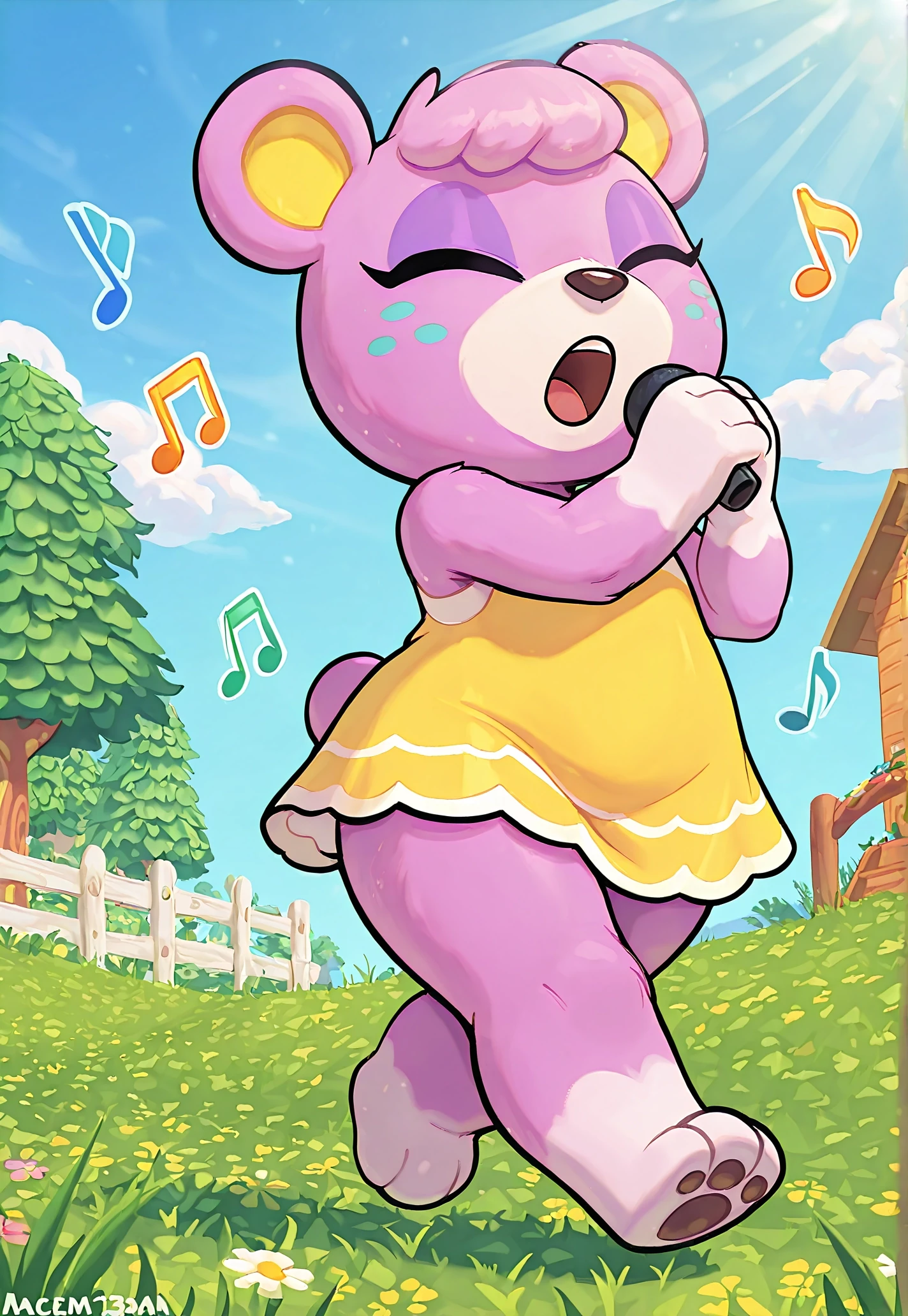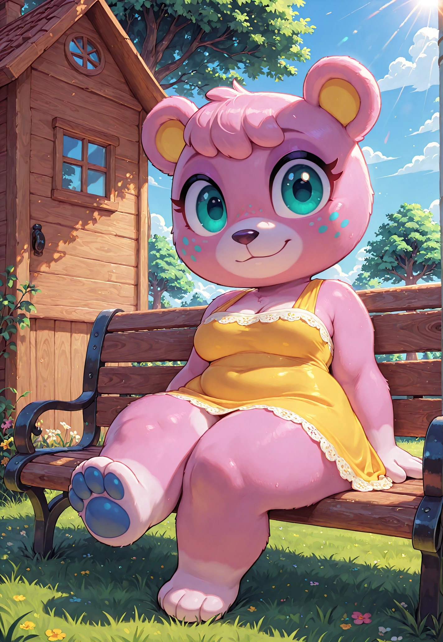 Megan \(animal crossing\), Animal crossing, anthro bear, furry female, Pink fur, blue paws, yellow inner ear, head tuft, blue freckles, teal eyes, pale pink muzzle, tall If more game-accurate proportions are desired, try using chibi in prompt.