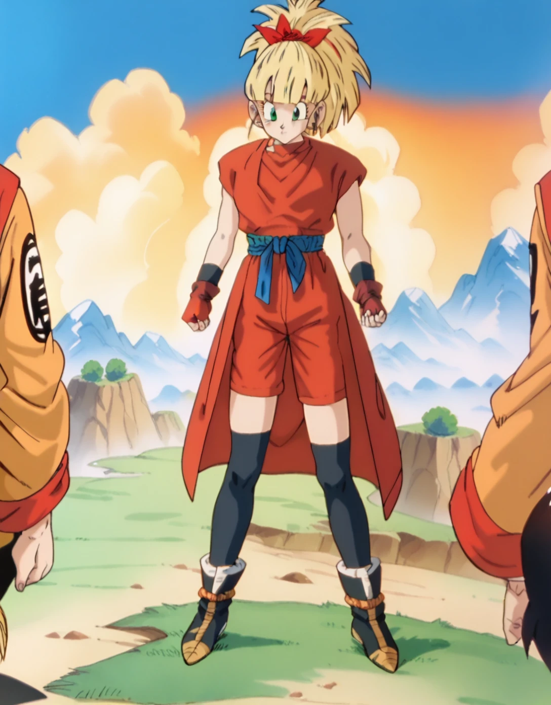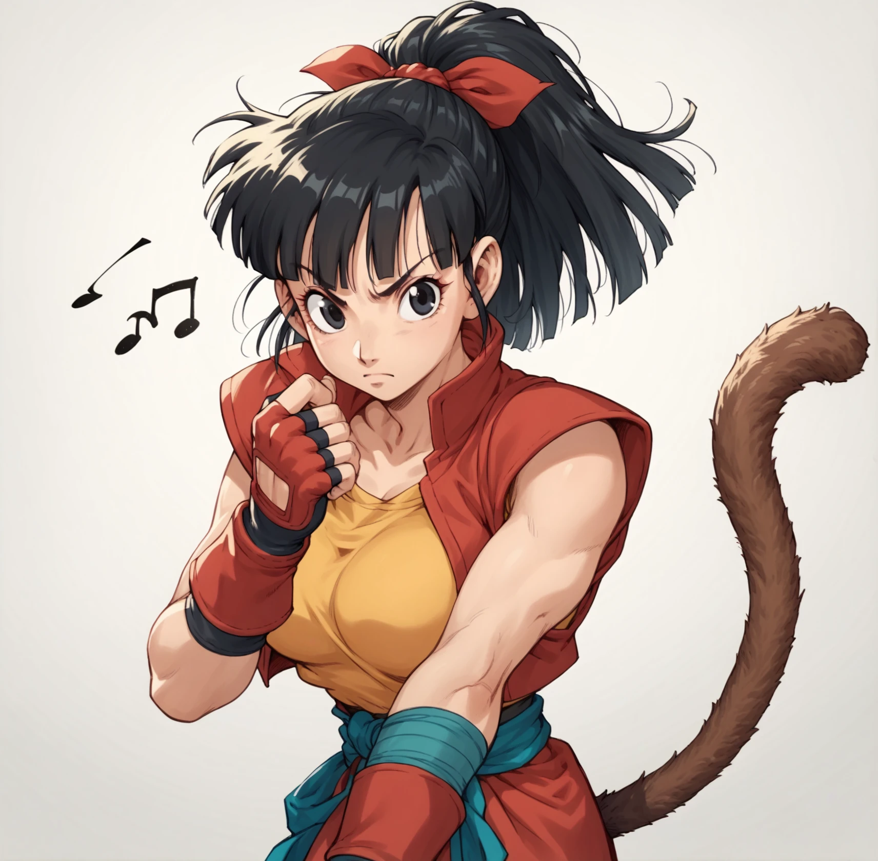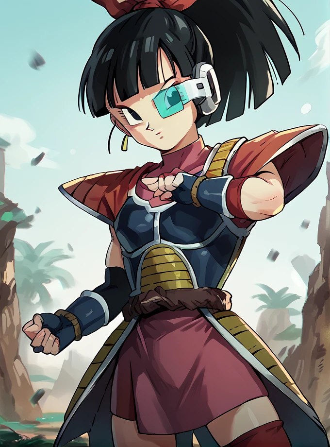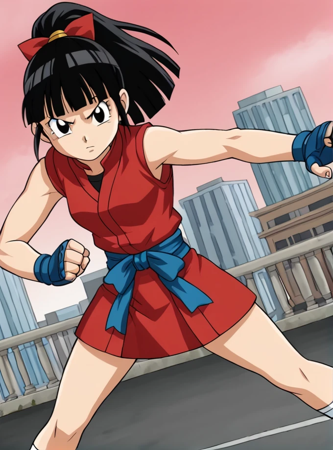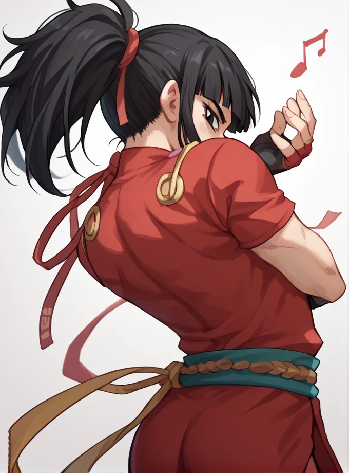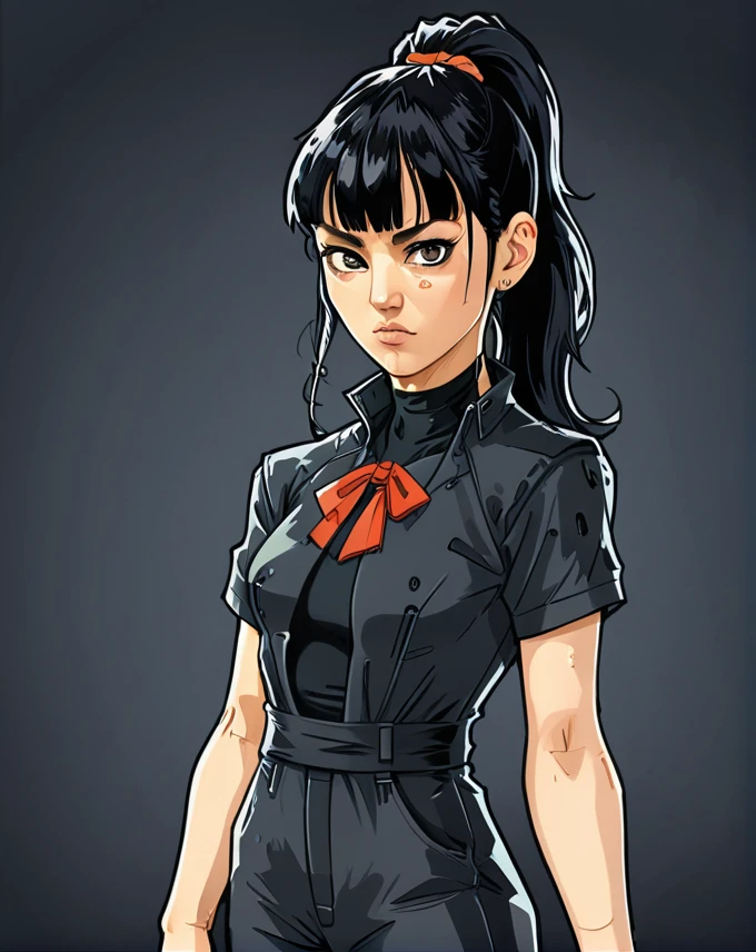 black hair, black eyes, ponytail, blunt bangs, red ribbon in hair, red fingerless gloves, black thighhighs,