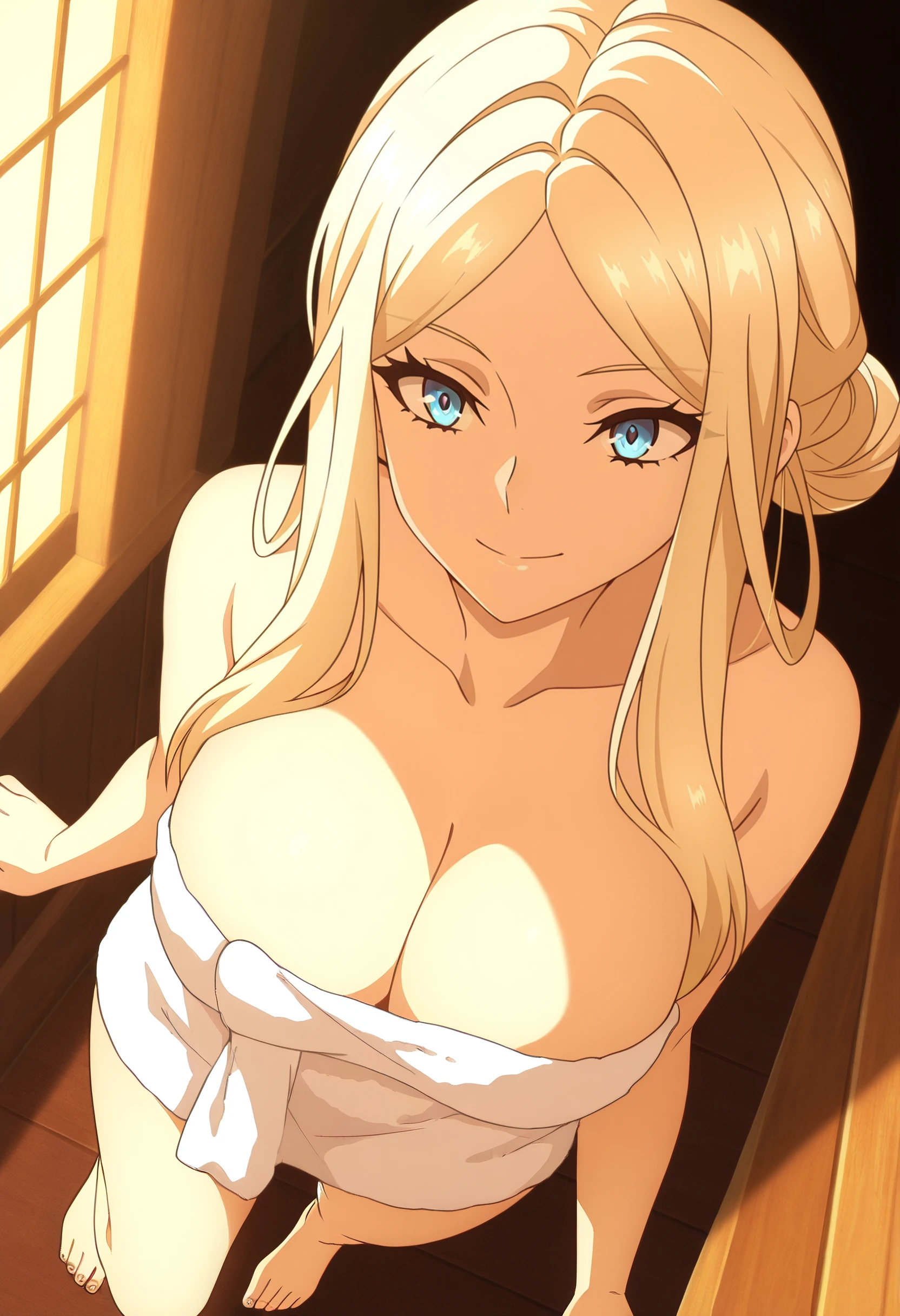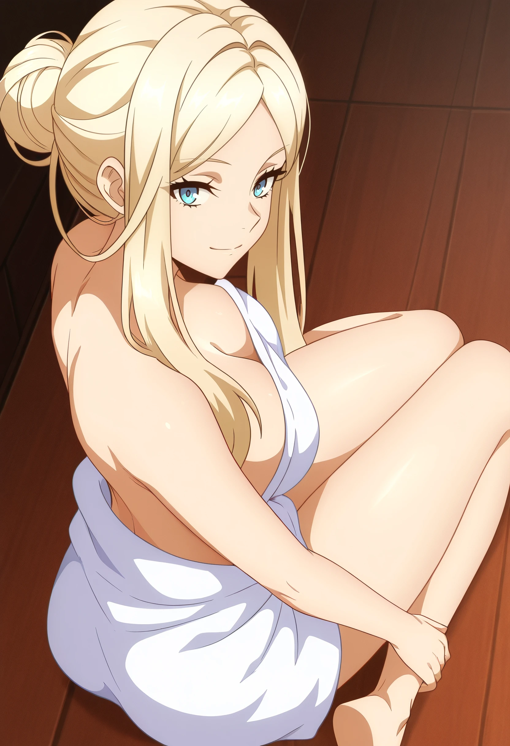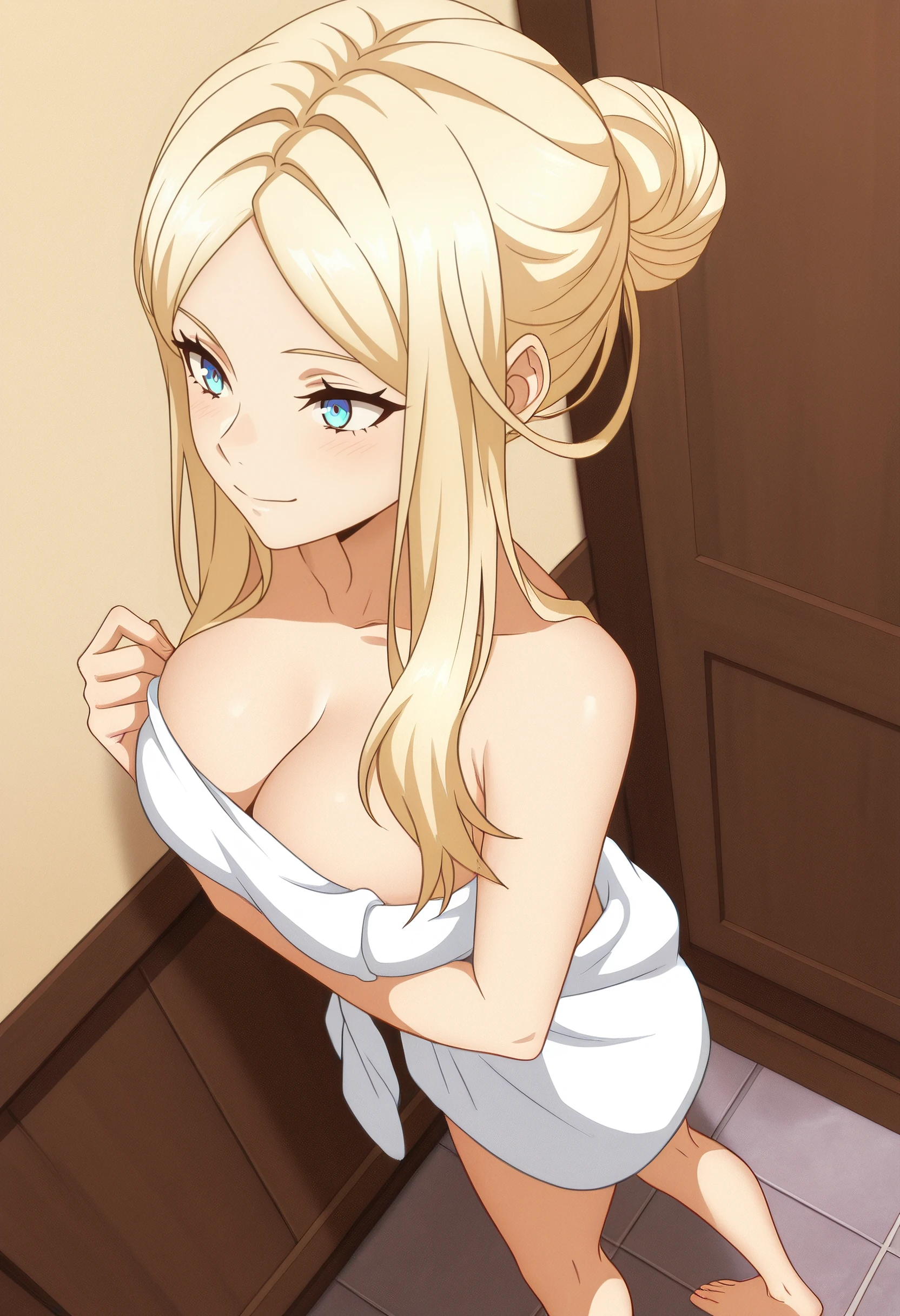KrishnaTowel, naked towel, towel, towel around waist, single hair bun, cleavage, hair up, short hair, barefoot, bare legs, parted bangs,