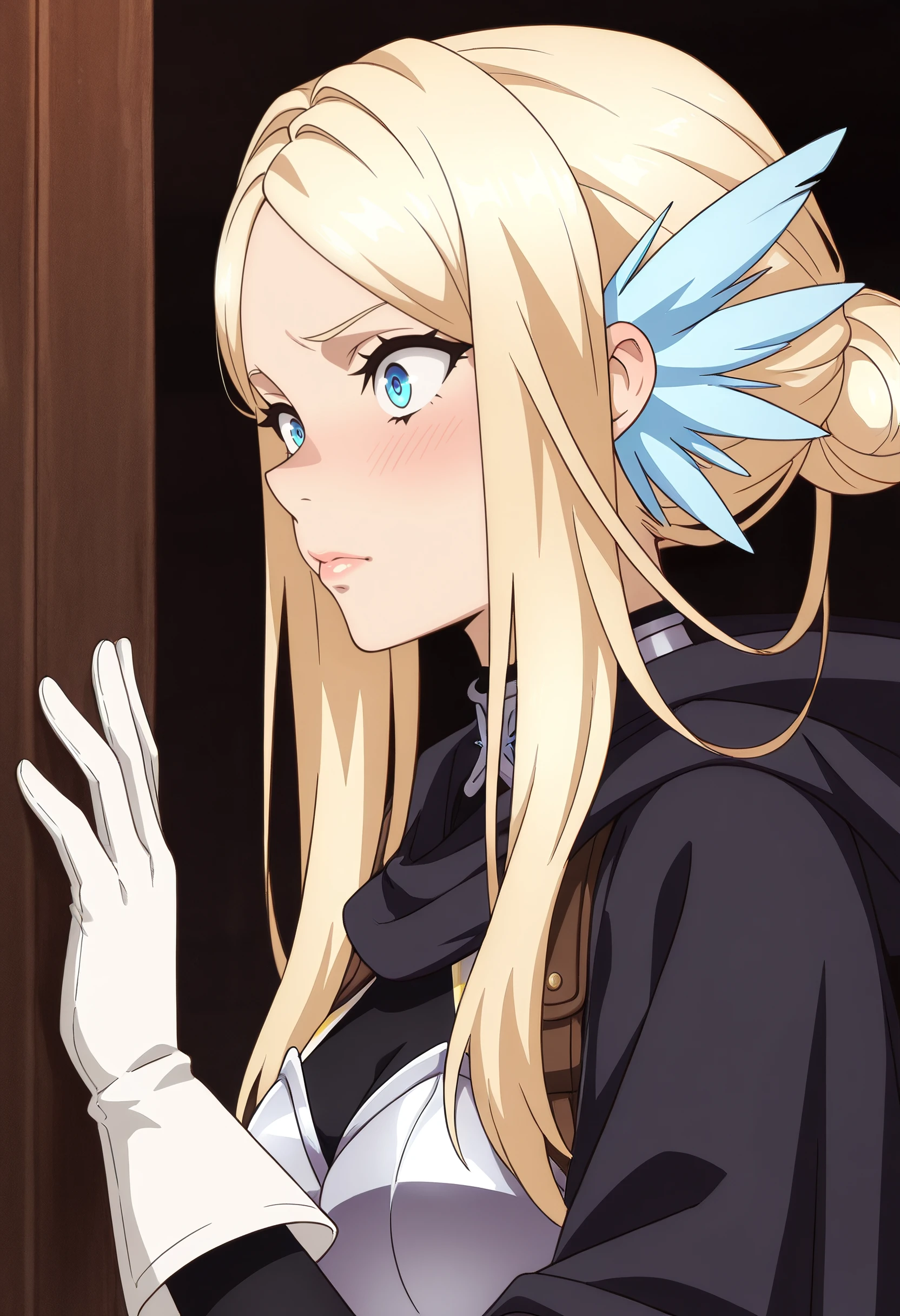 KrishnaCloak, cloak, hooded cloak, hood, black cloak, parted bangs, white gloves, gloves, feather hair ornament, armor, finger on trigger, hood down,