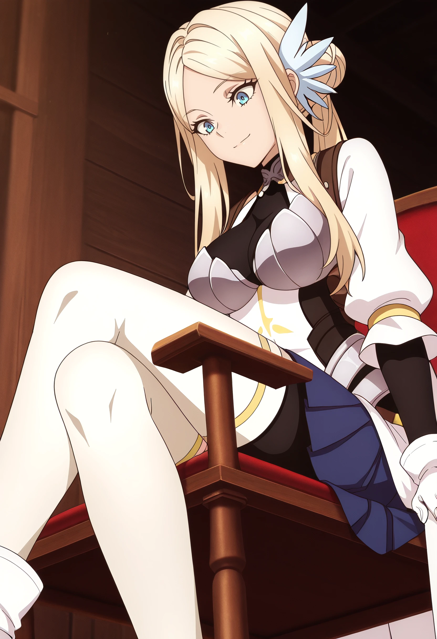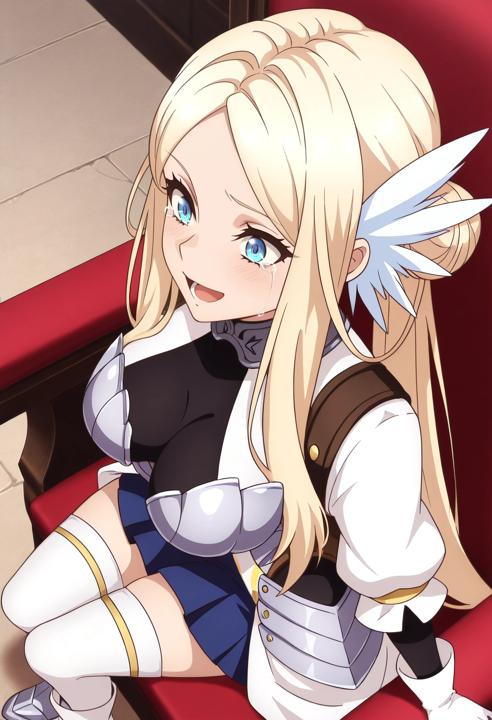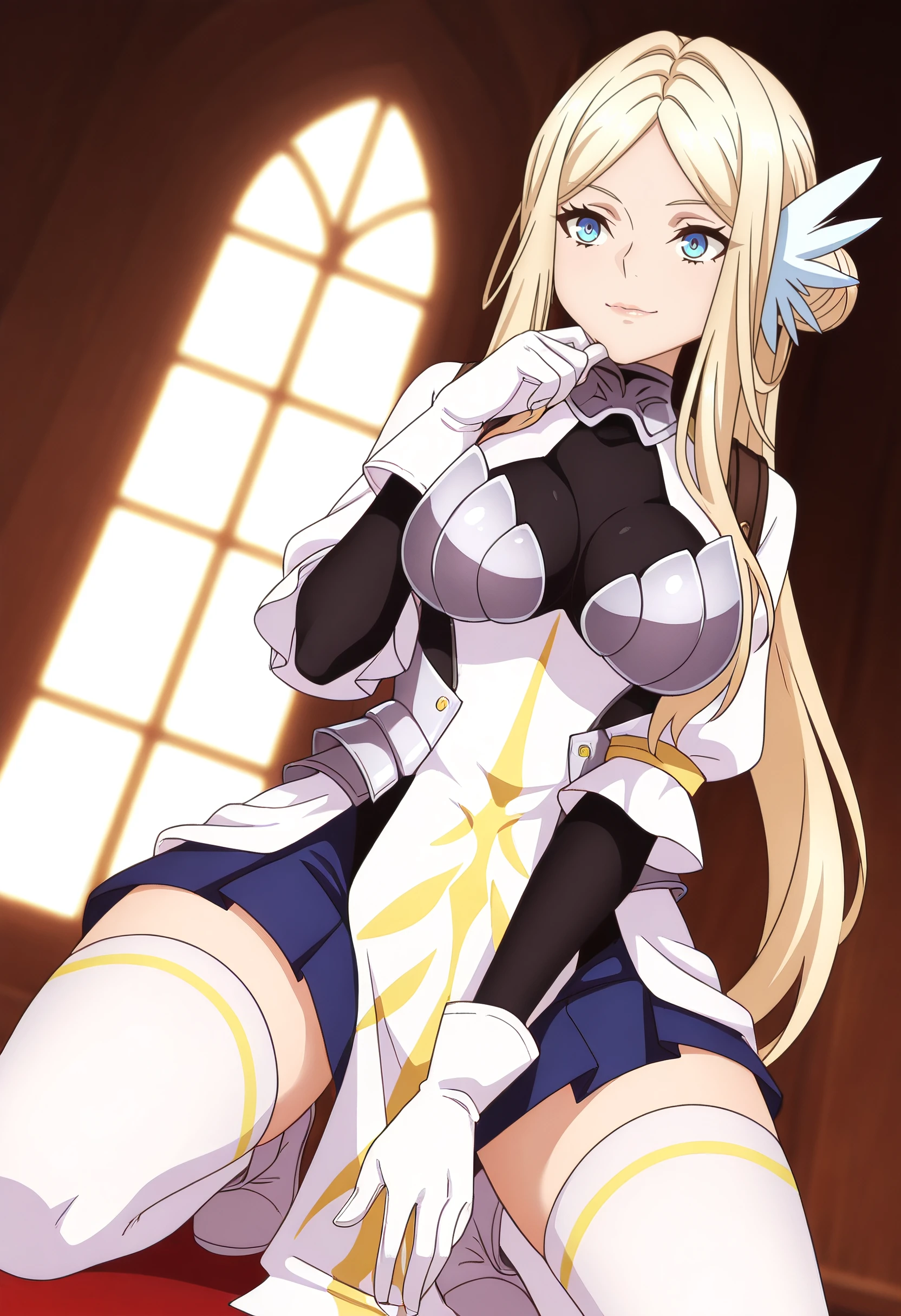 KrishnaOutfit, parted bangs, hair ornament, armor, gloves, white gloves, feather hair ornament, breastplate, ponytail, wing hair ornament, skirt, single hair bun, blue skirt, pleated skirt, dress, puffy sleeves, boobplate, bodysuit, short sleeves, white dress, bare shoulders, armored dress, metal collar, single side bun, thighhighs, white footwear, white thighhighs, zettai ryouiki,