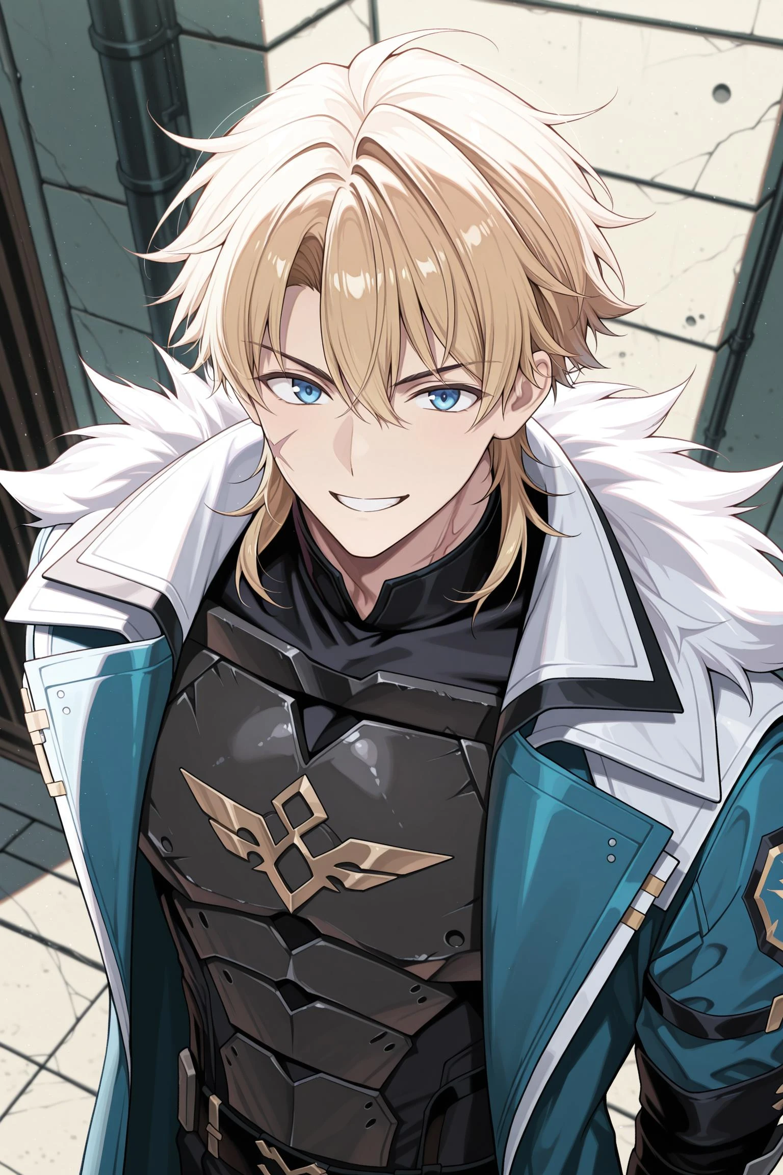 Varka, varka_gi, blonde hair, blue eyes, hair between eyes, scar on cheek, medium hair, scarClothes: