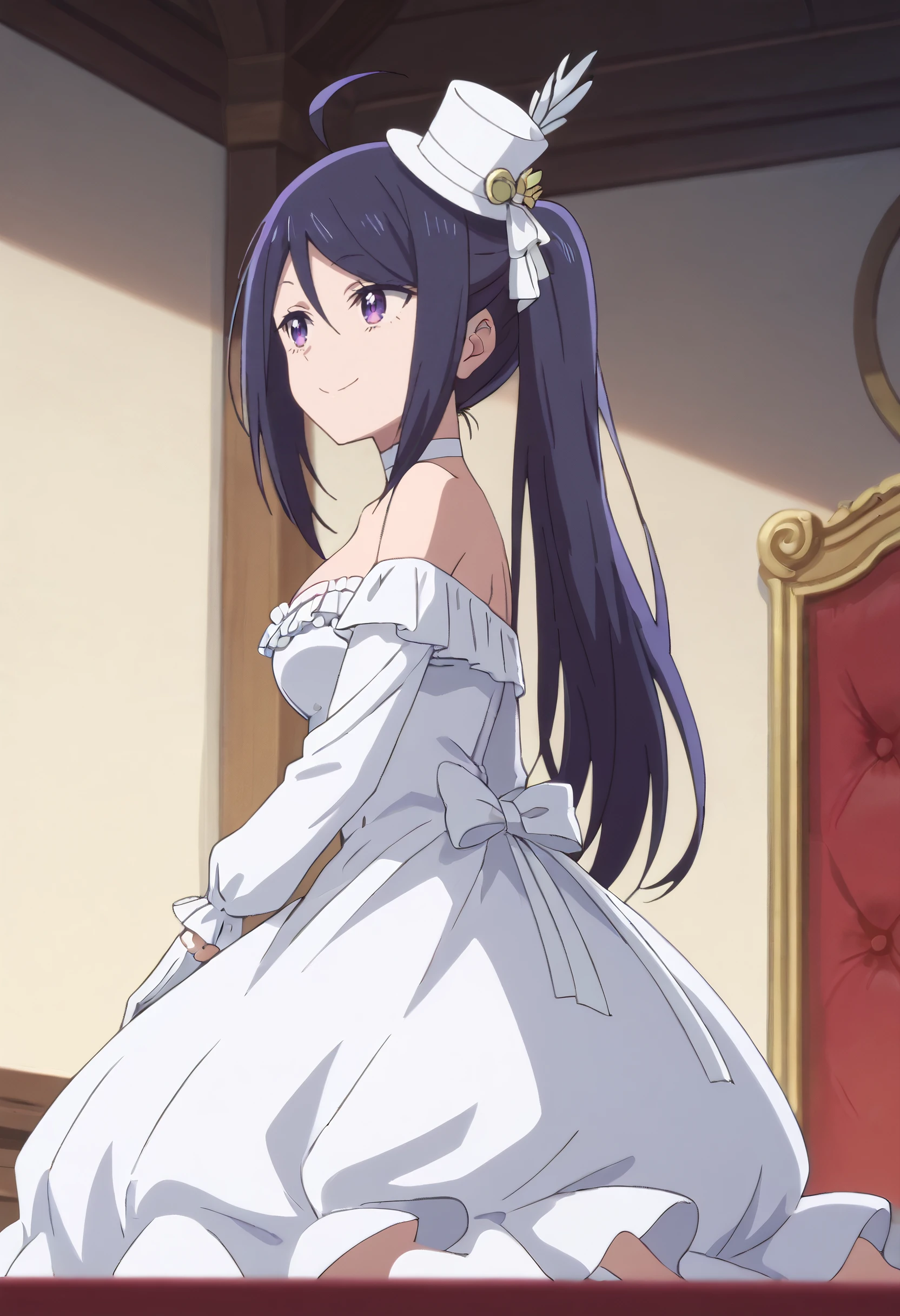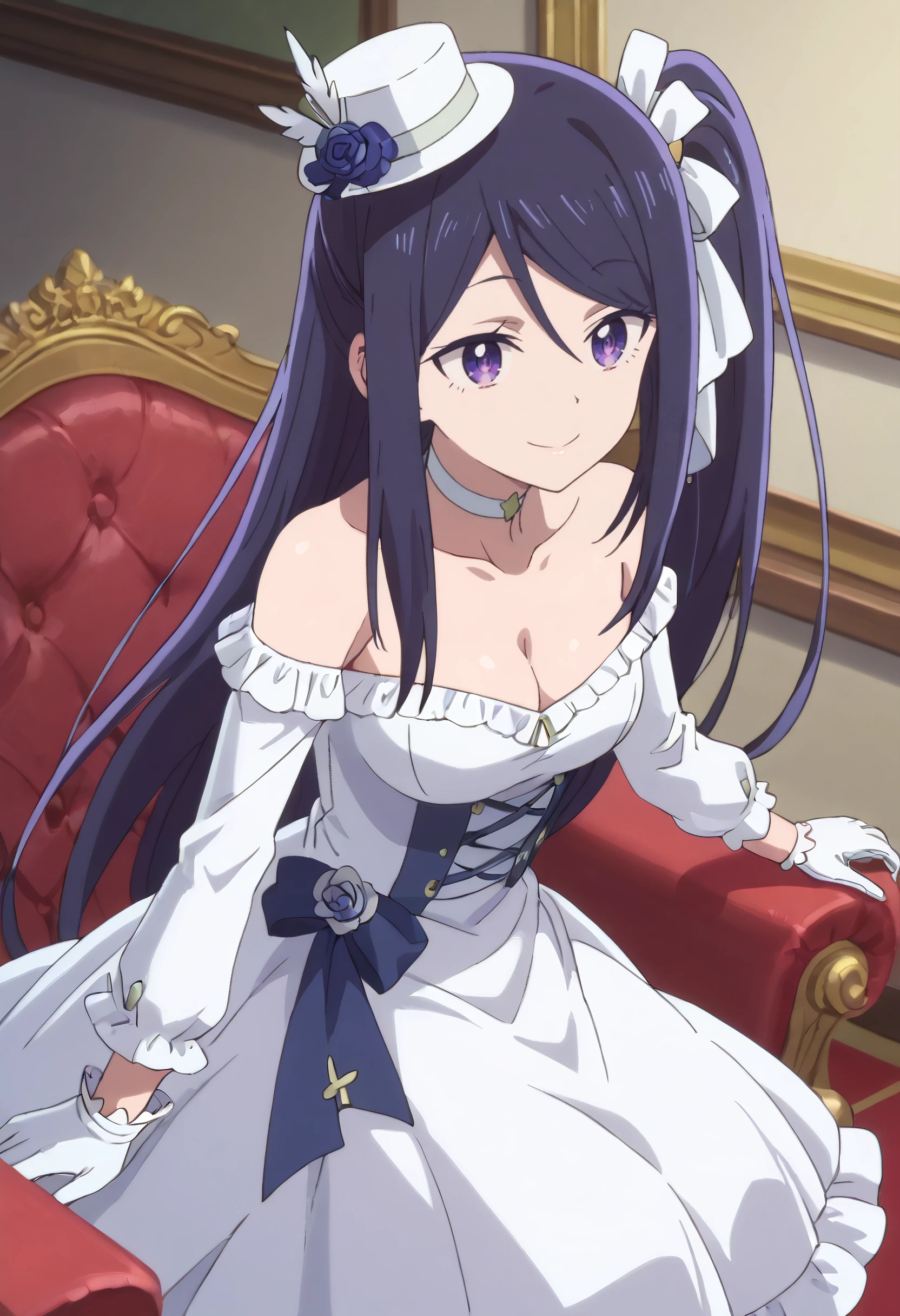 SeikaWhiteDress, dress, white dress, short hair, hat, choker, collarbone, bare shoulders, mini hat, off shoulder, gloves, white gloves, frills, mini top hat, ahoge, off-shoulder dress, ponytail, strapless, side ponytail, white headwear, ribbon, white-ribbon, long sleeves, cleavage, white footwear, formal,
