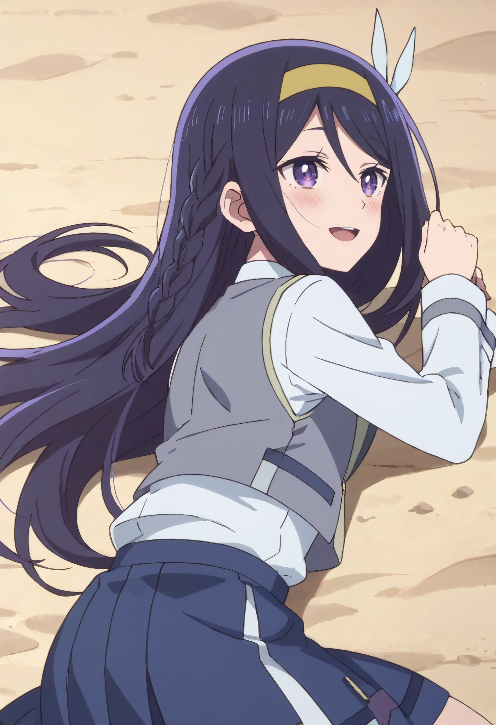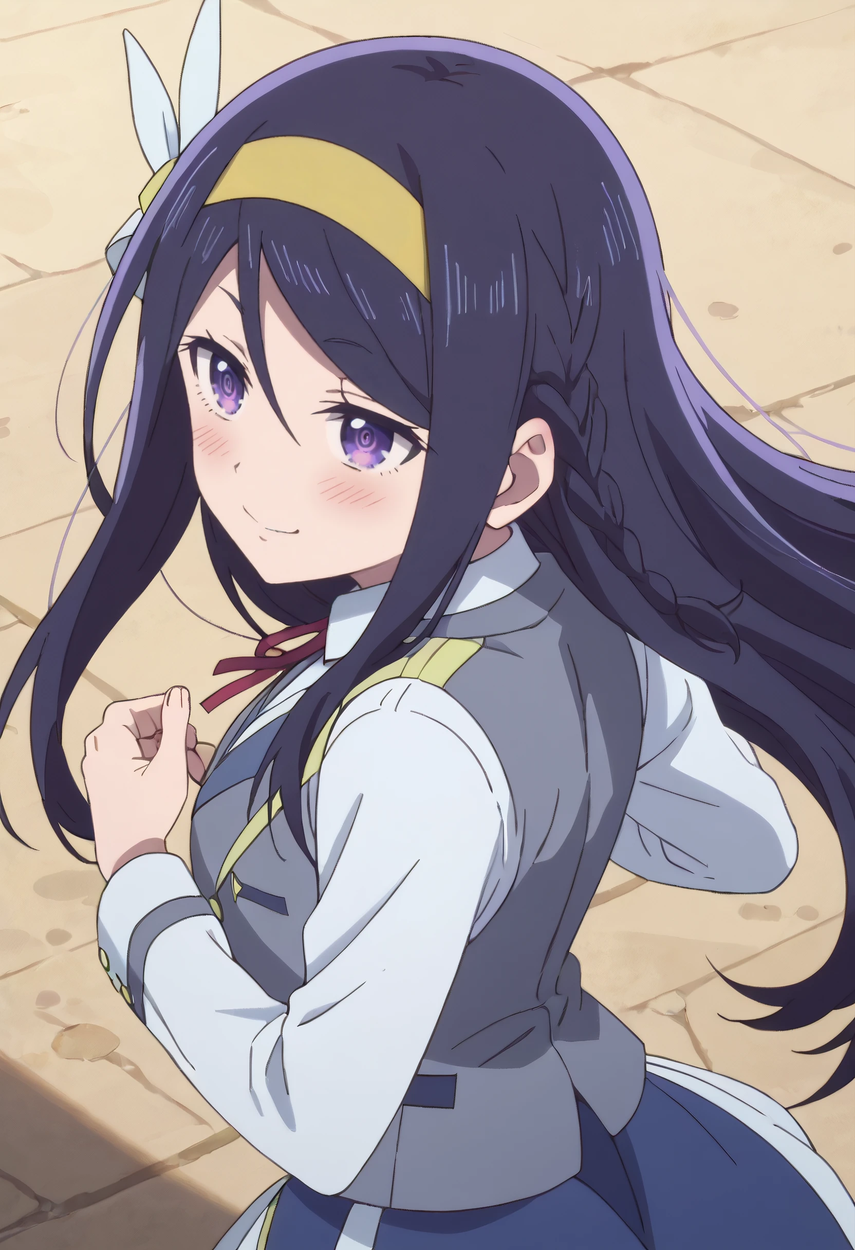 SeikaSchool, hairband, school uniform, long sleeves, shirt, white shirt, braid, vest, skirt, yellow hairband, ribbon, neck ribbon, grey vest, blue skirt, red ribbon,