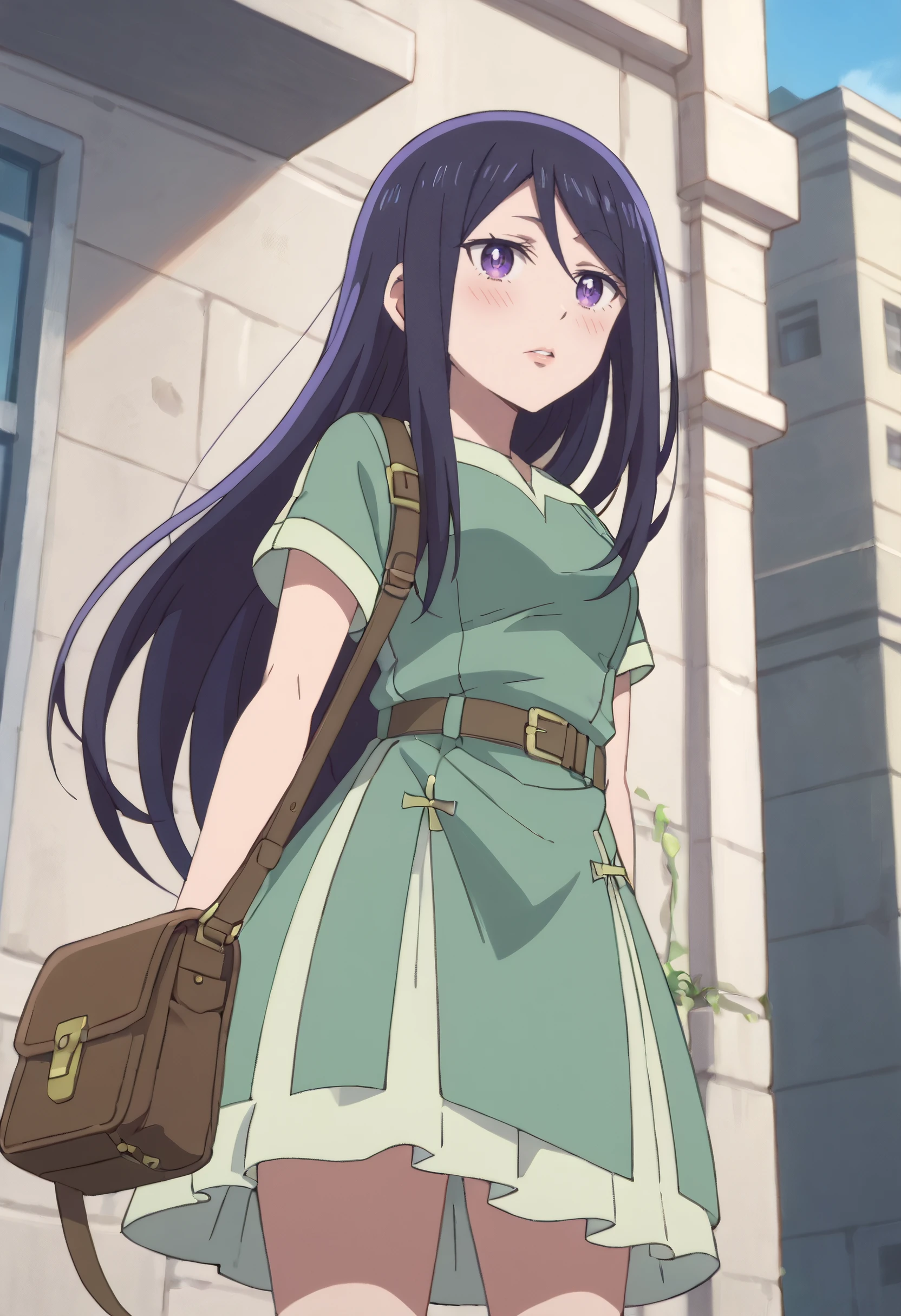 SeikaGreenSkirt, short sleeves, shirt, green shirt, belt, green dress, dress, bag, buckle, brown belt, belt buckle, green skirt, skirt, boots, brown footwear,
