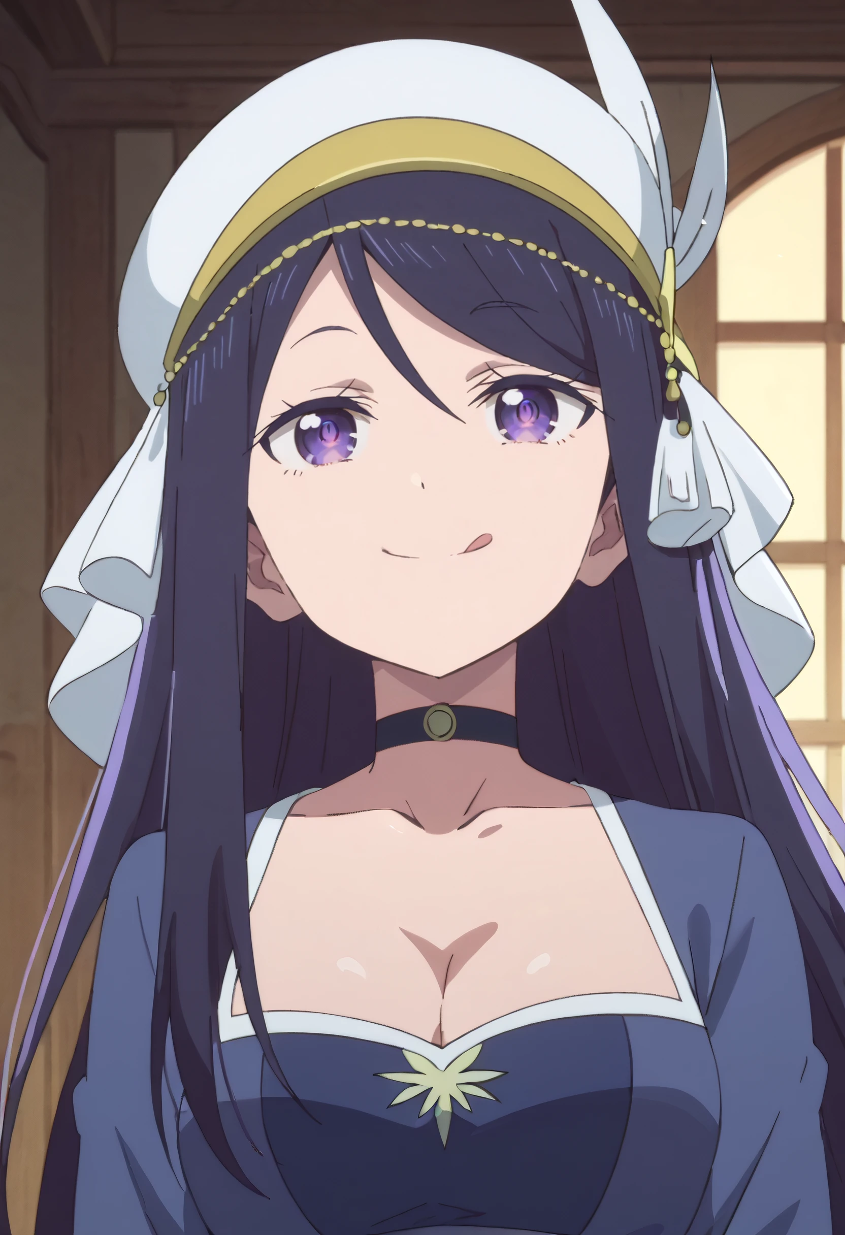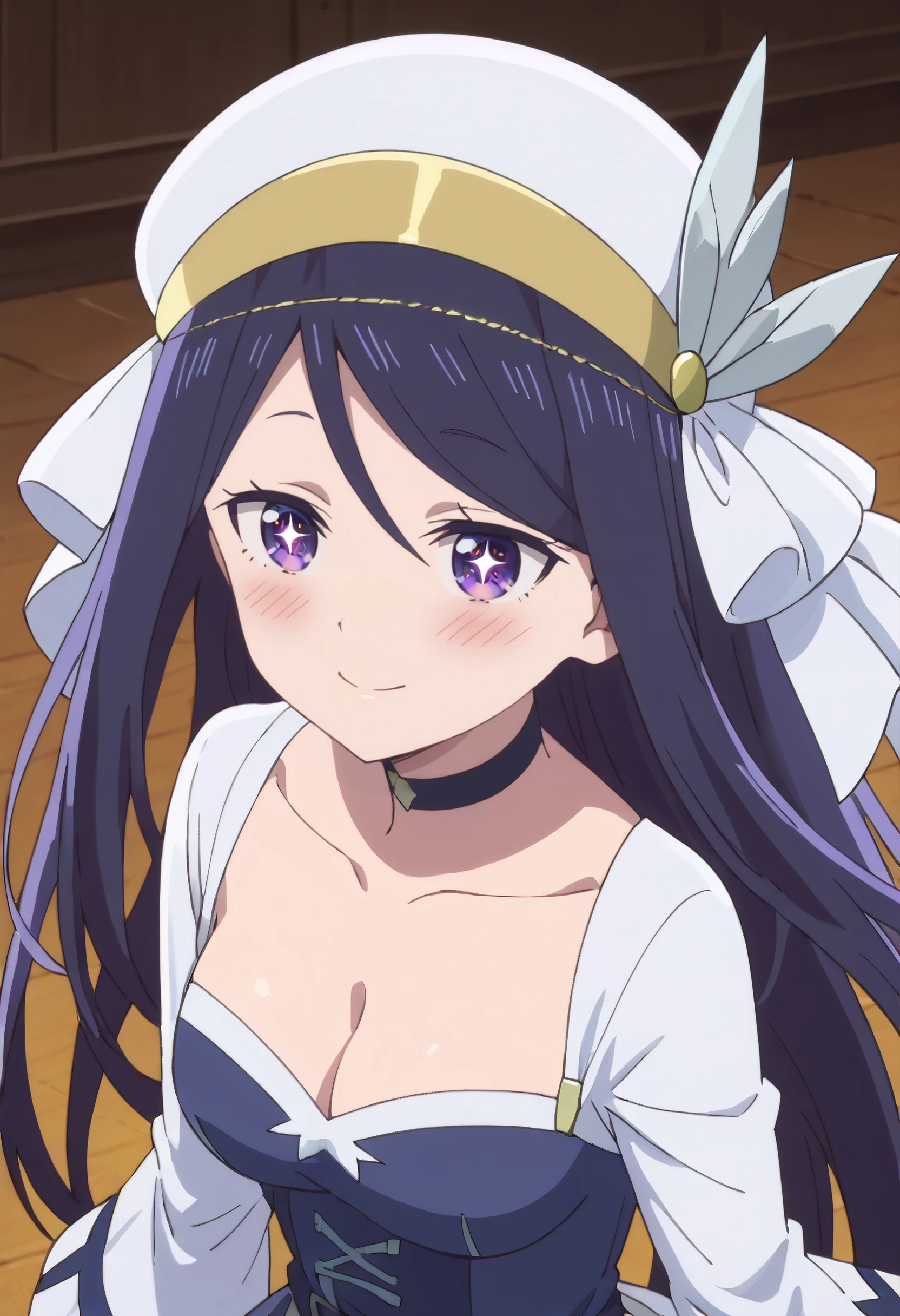 SeikaBlueDress, long sleeves, dress, hat, choker, collarbone, cleavage, ribbon, blue dress, hair ribbon, hair ornament, white ribbon, wide sleeves, black choker,