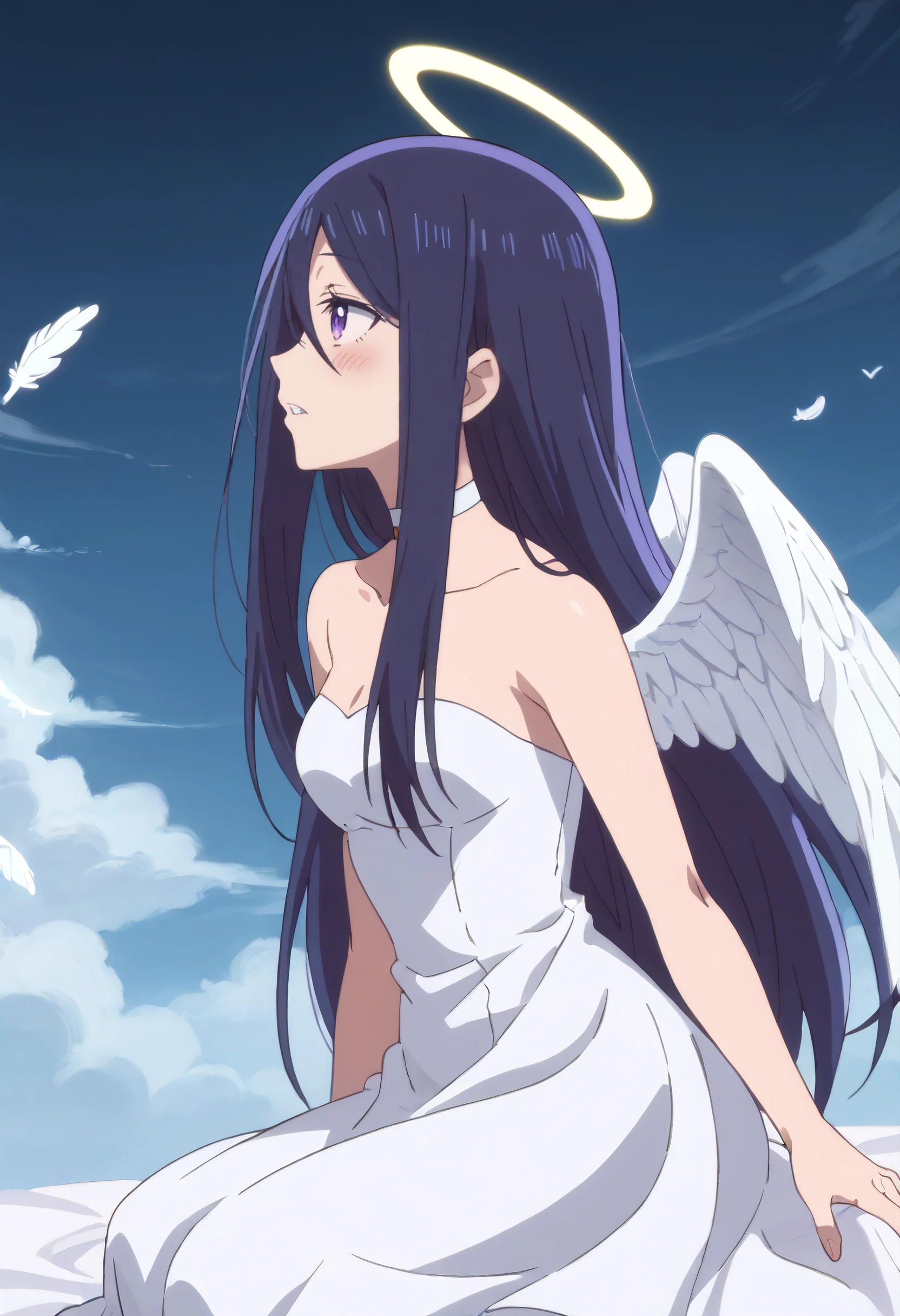 SeikaAngel, angel wings, feathered wings, white wings, wings, choker, angel, halo, dress, bare shoulders, collarbone, white dress, low wings, white feathers, glowing wings, blue hair, multicolored hair, glowing hair, strapless, strapless dress,