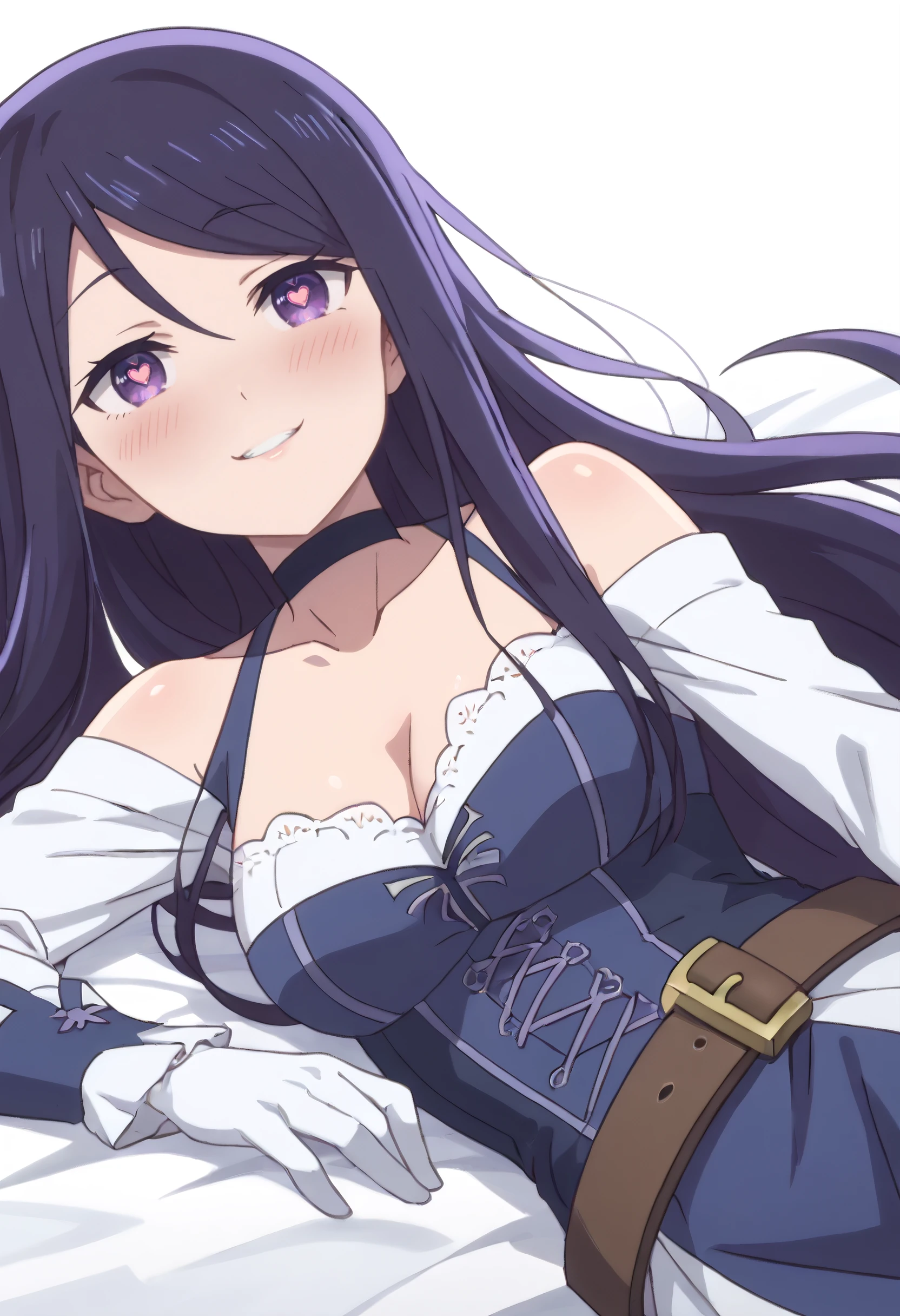 SeikaBlueDressLite, dress, choker, bare shoulders, collarbone, cleavage, long sleeves, white sleeves, blue dress, black choker, elbow gloves, gloves, belt, corset, detached sleeves,