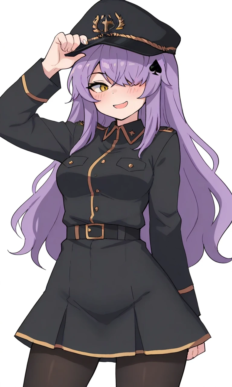 Prompt: Hilde-Girl, 1girl, solo, purple hair, long hair, bangs, yellow eyes, military uniform, black skirt, medium breasts, hair over one eye, black headwear, spade \(shape\), peaked cap, black pantyhose