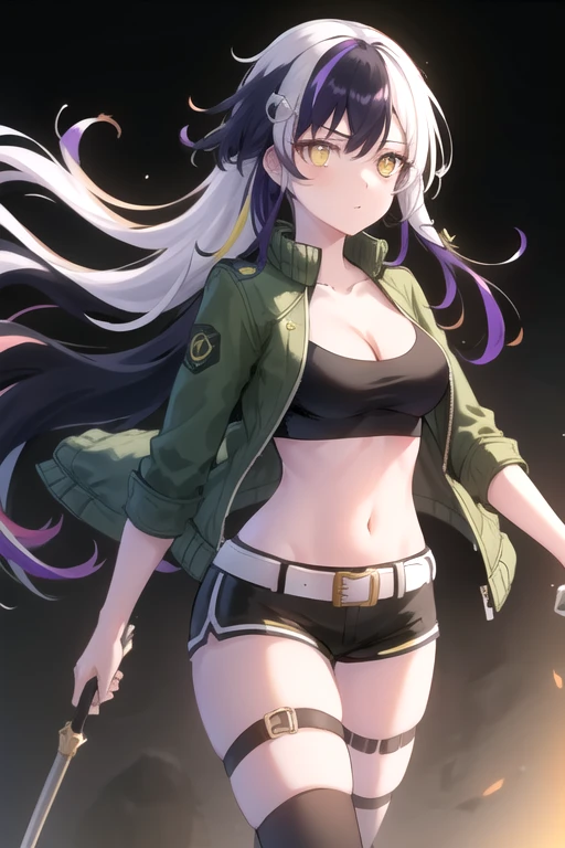 TieraLucent, 1girl, solo, very long hair, medium breasts, black hair, hair ornament, black thighhighs, navel, holding, cleavage, collarbone, green jacket, yellow eyes, purple hair, white hair, split-color hair, short shorts, midriff, belt, open jacket, crop top, thigh strap, black shorts