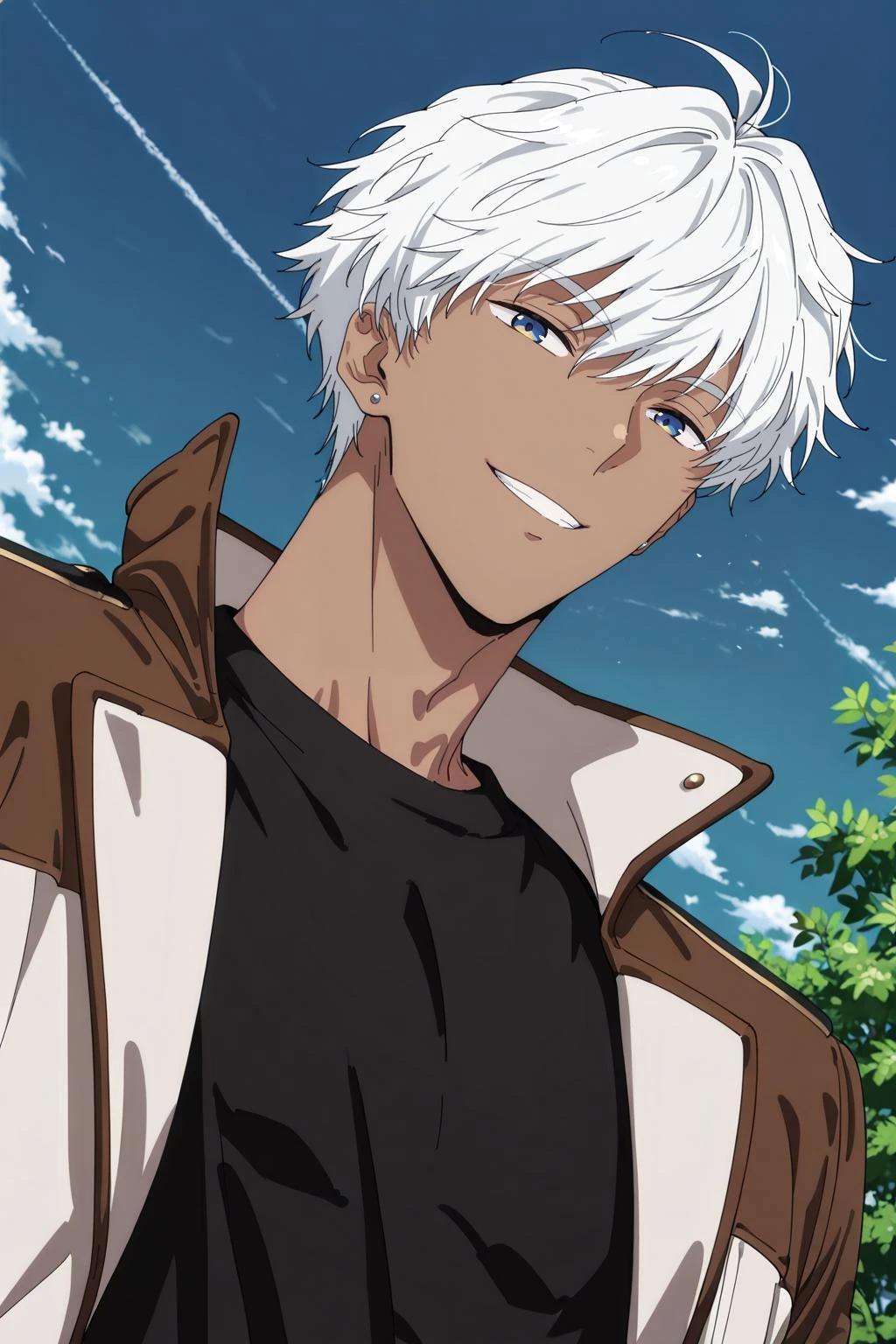 mammon, mammon_obeyme, white hair, dark skin, blue eyes, bangs, stud earringsClothes: