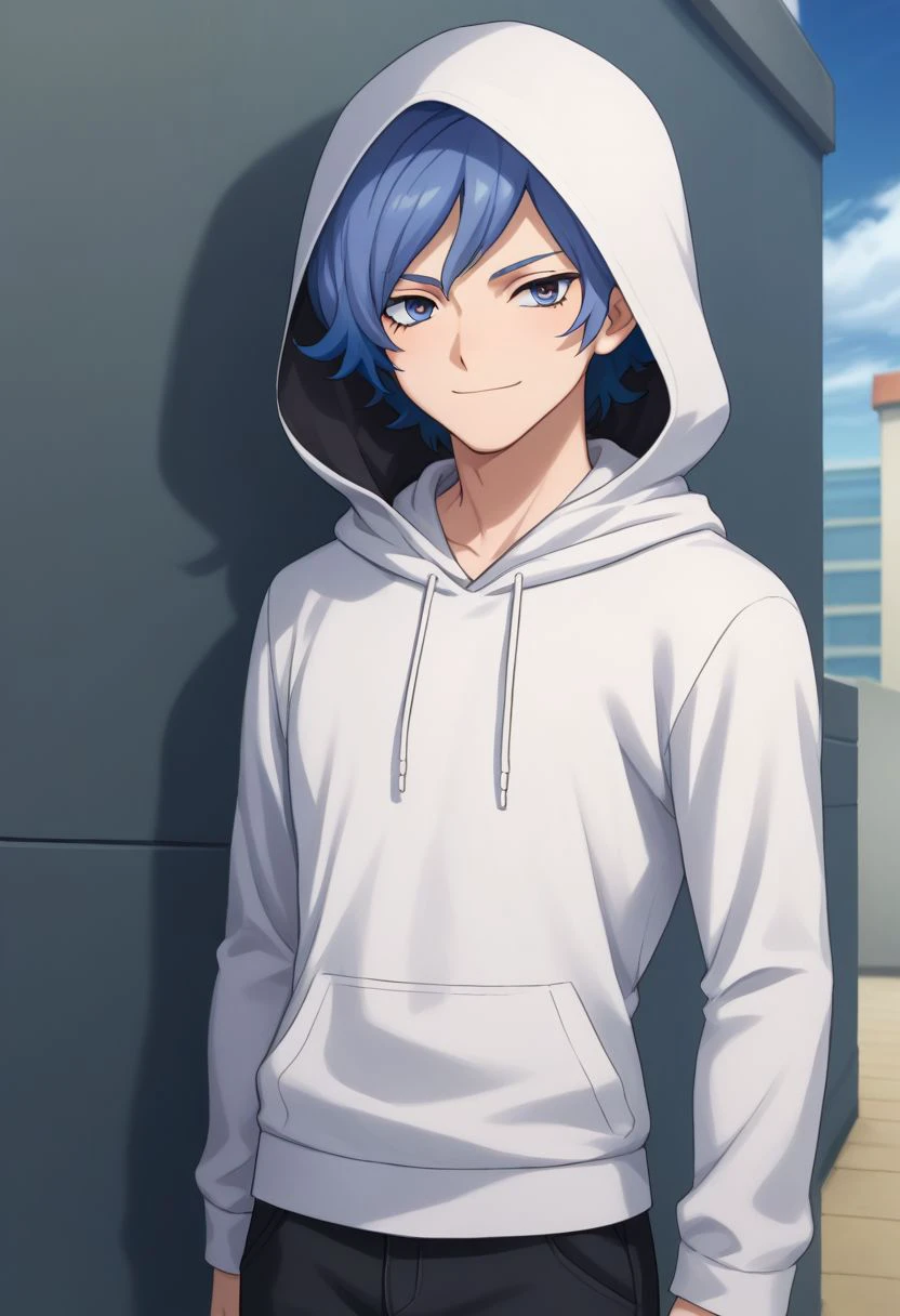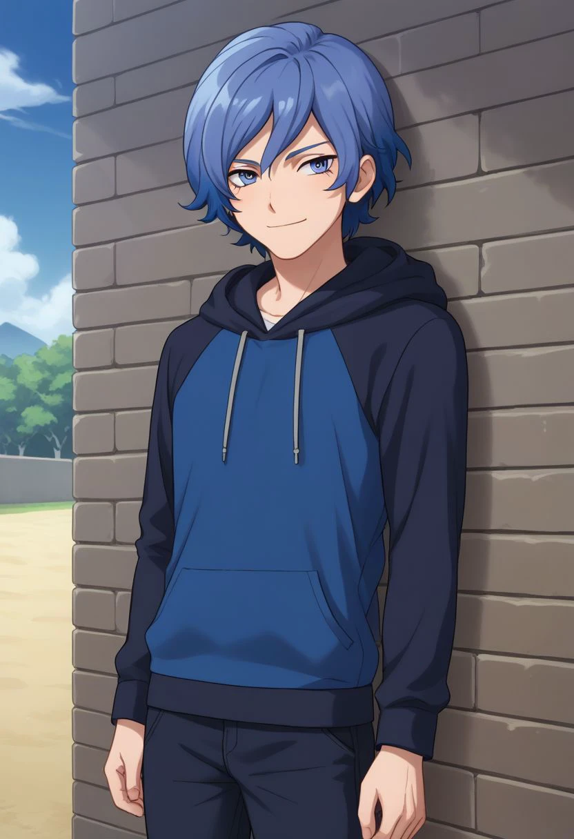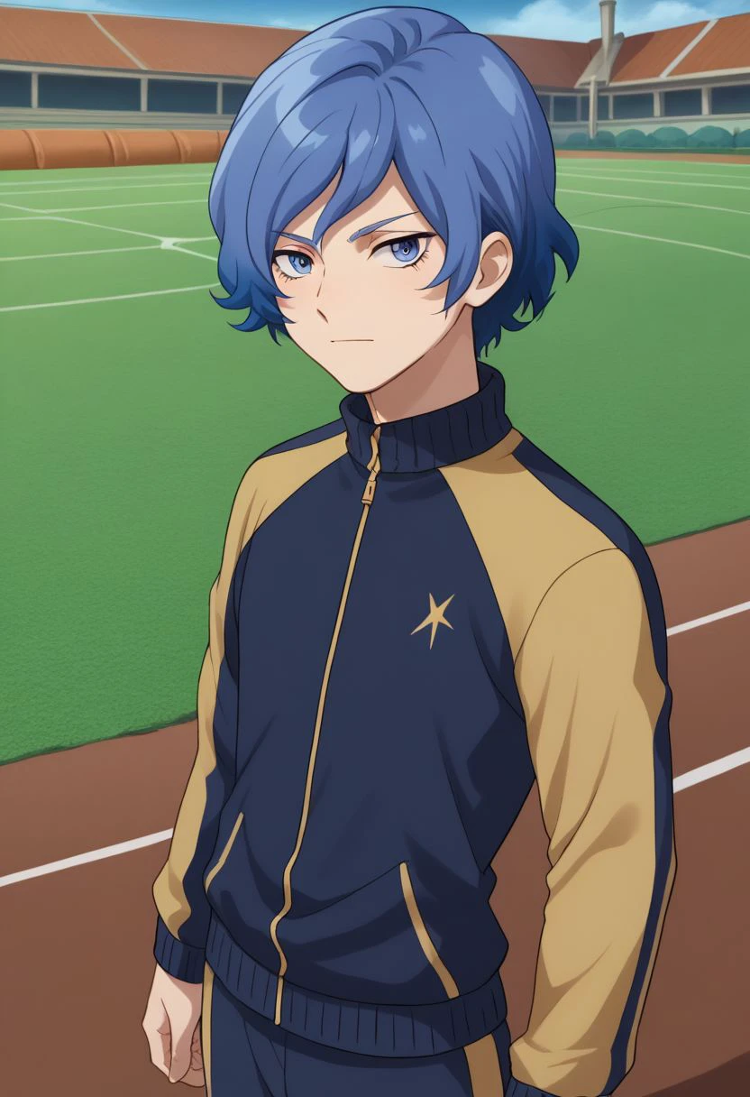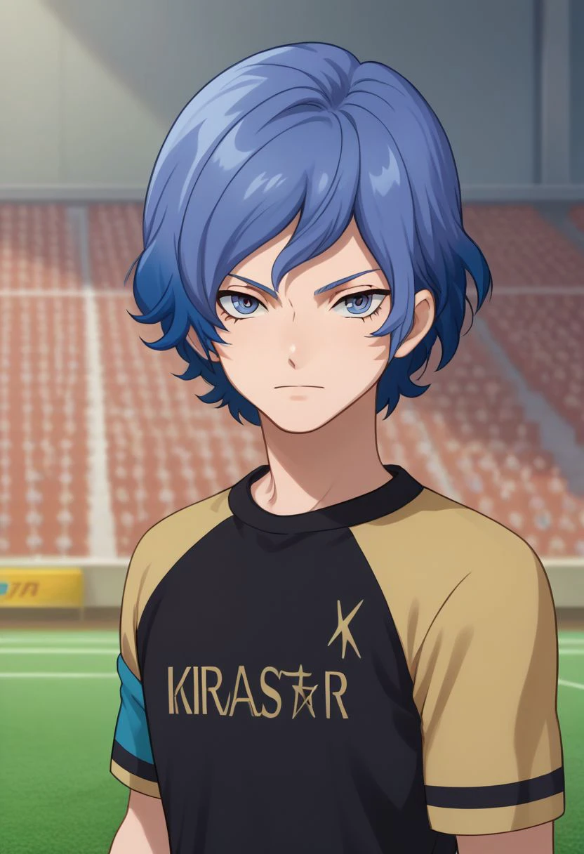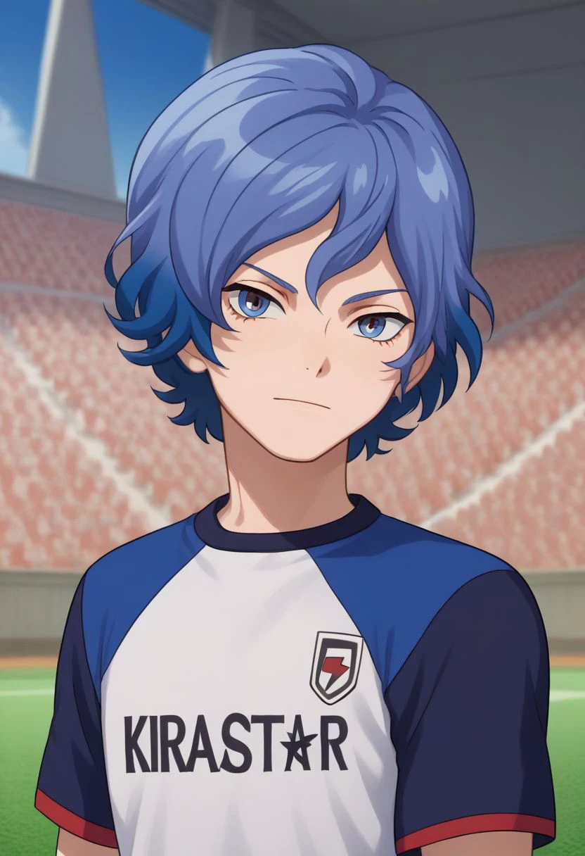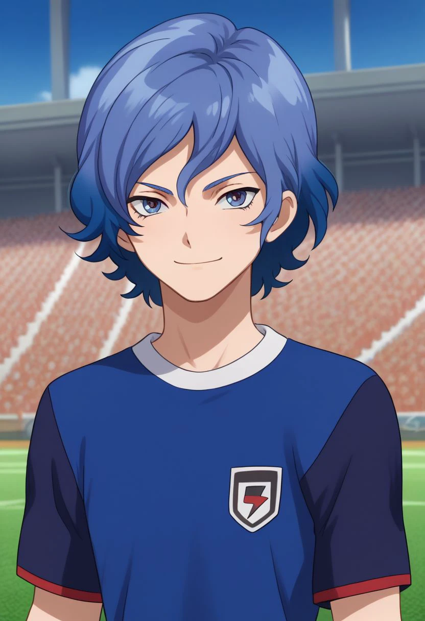 MizukamiyaSeiryuu, 1boy, male focus, solo, blue eyes, blue hair, orion soccer uniform, shirt, blue shirt, raglan sleeves, short sleeves, bracelet, shorts, blue shorts, socks, blue socks, shoes, sneakers,