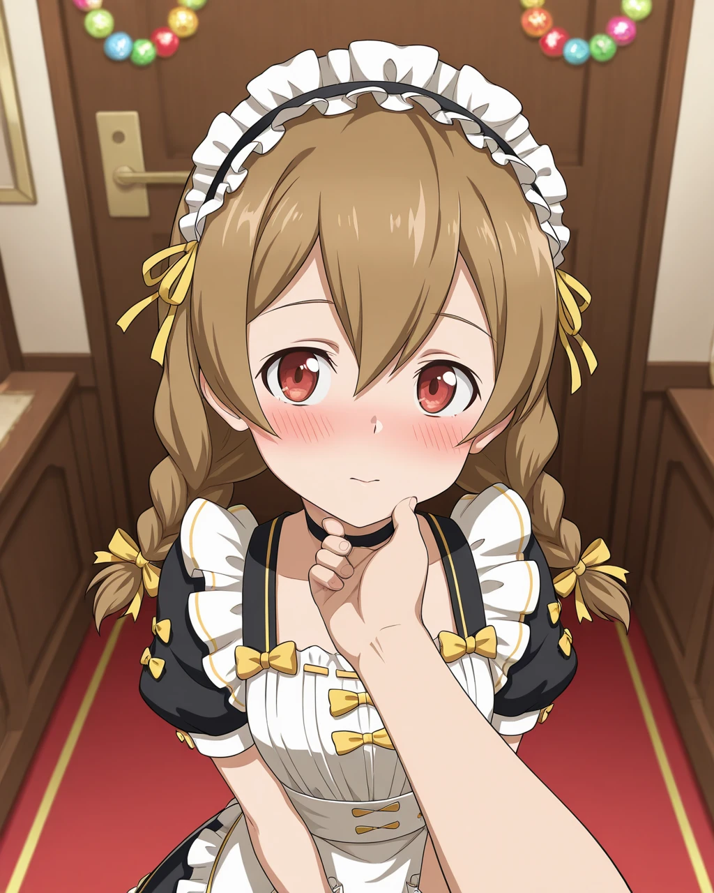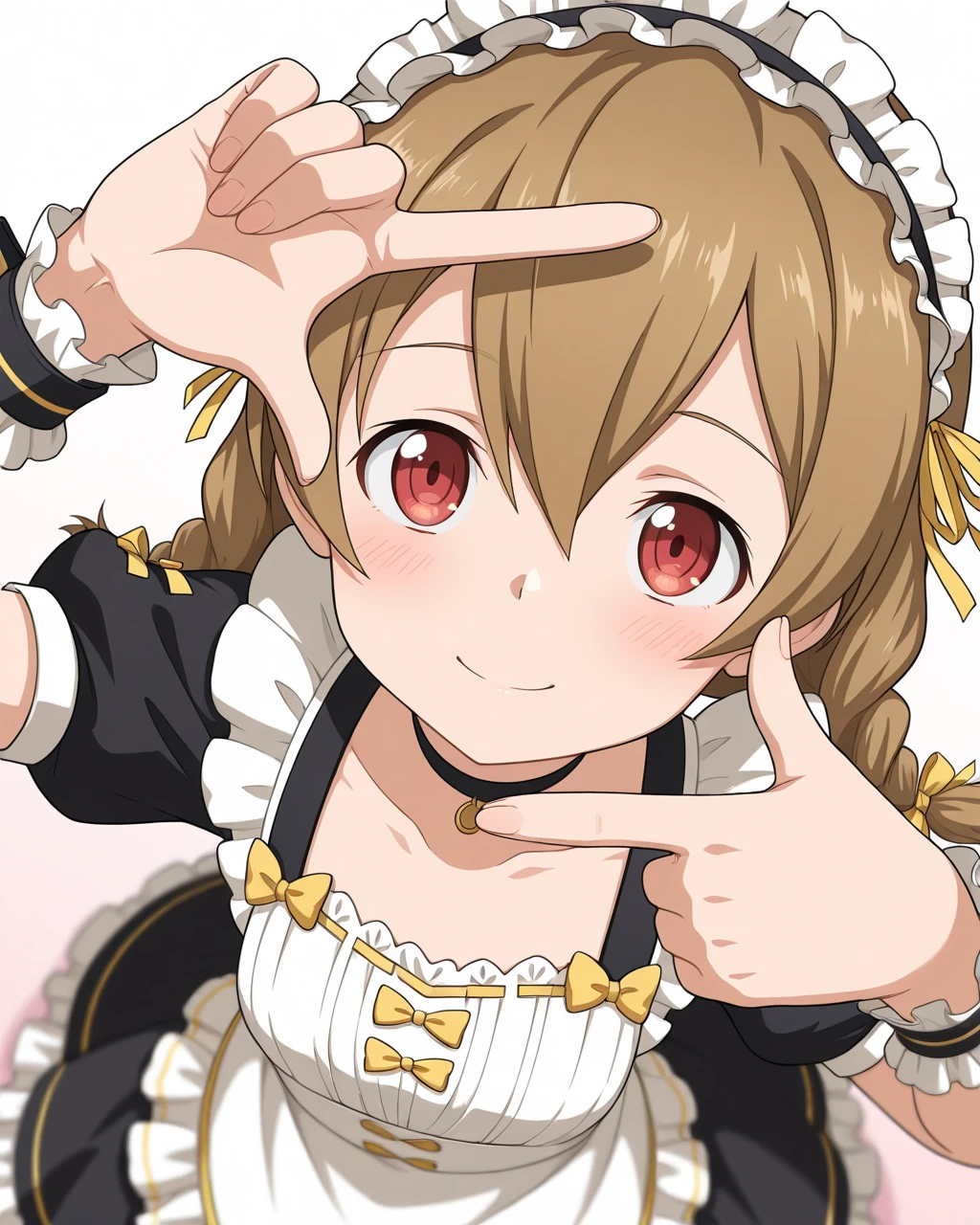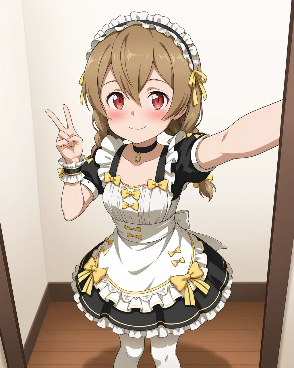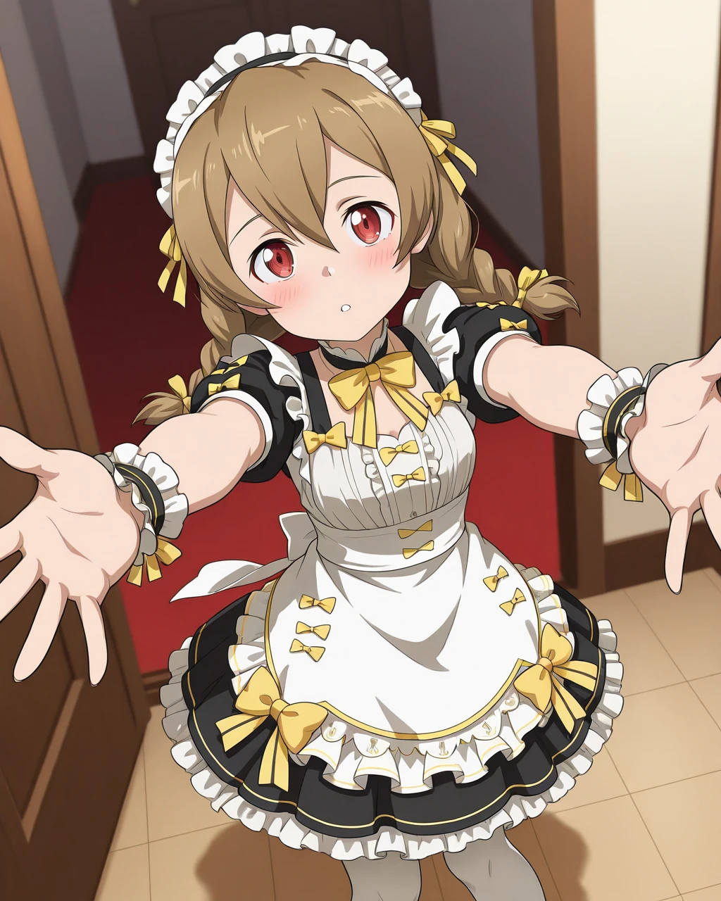 Silica_SAO, Silica_Maid, light brown hair, twin braids, red eyes, maid, maid headdress, 1girl, solo, white apron, black dress, yellow bow, ribbon, frills, puffy sleeves, short sleeves, wrist cuffs, choker, white pantyhose, black footwear, mary janes,
