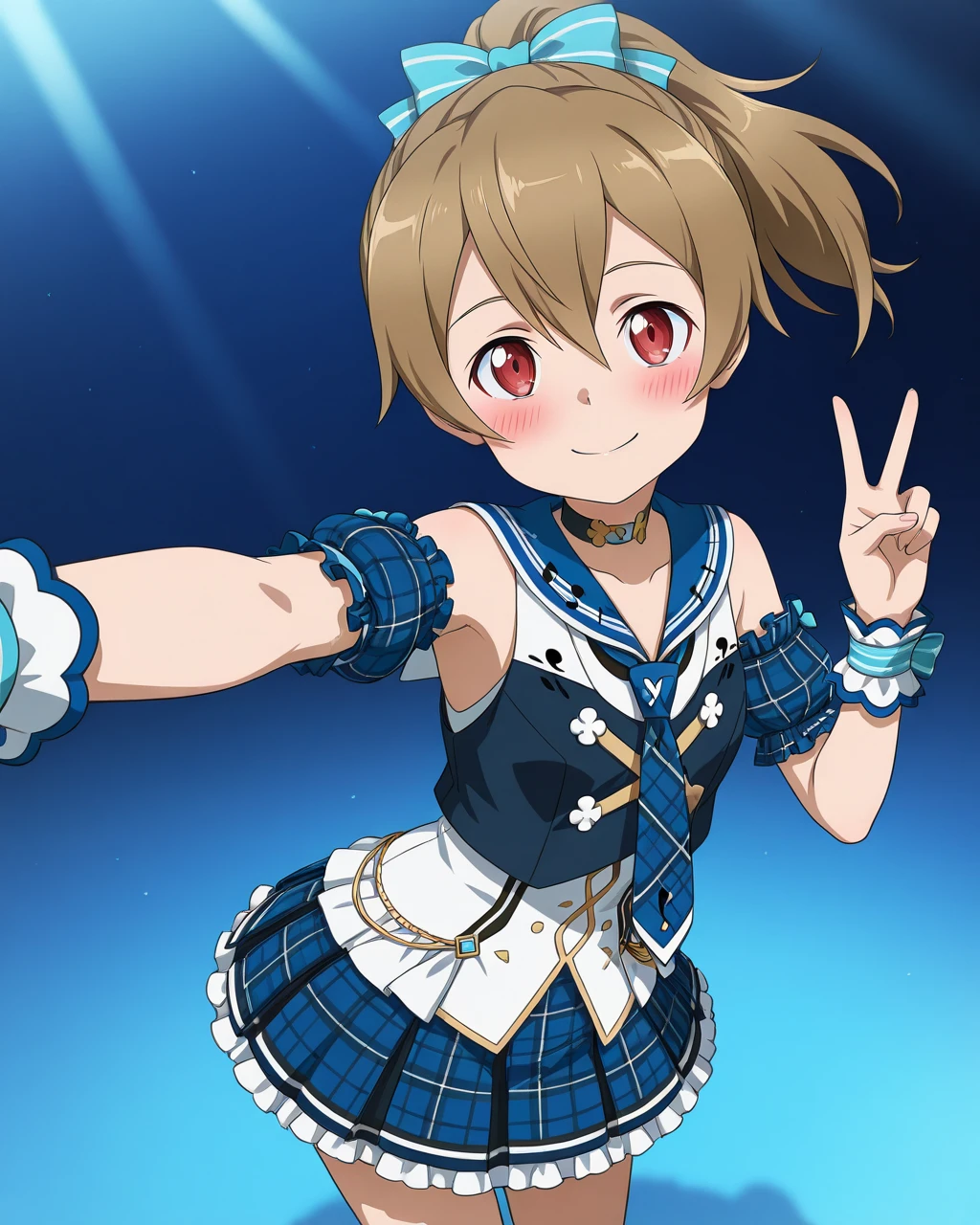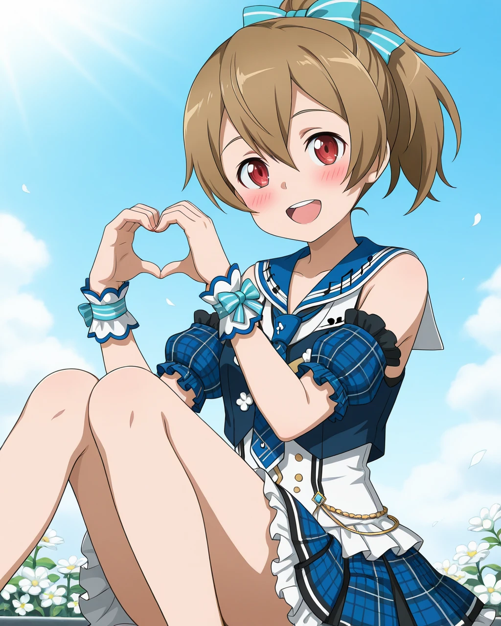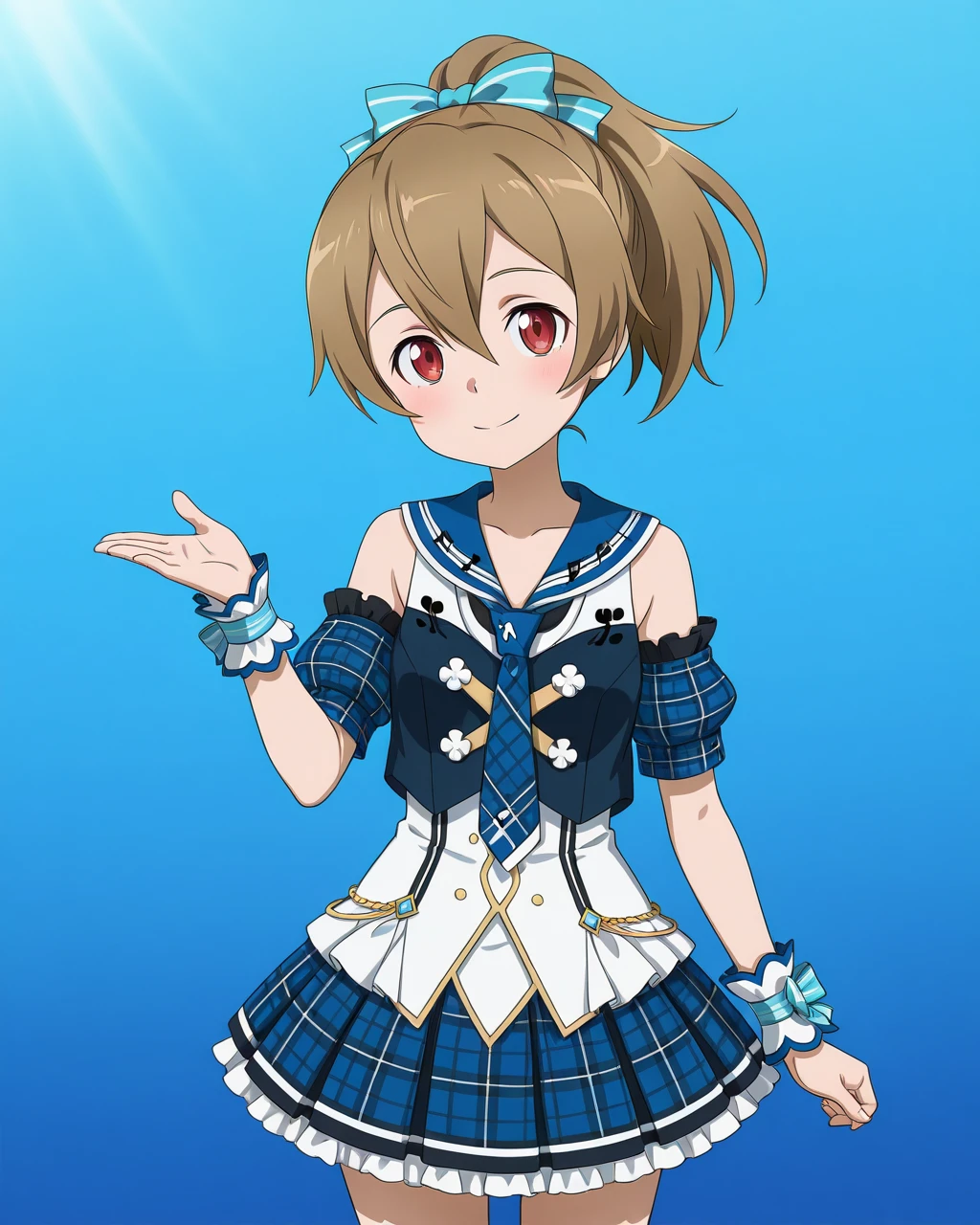 Silica_SAO, Silica_pop, light brown hair, ponytail, red eyes, hair bow, blue bow, striped bow, musical note, musical note print, 1girl, solo, idol clothes, choker, necklace, sailor collar, necktie, blue necktie, plaid, tartan, blue theme, detached sleeves, bare shoulders, puffy sleeves, wrist cuffs, flower, skirt, pleated skirt, plaid skirt, frilled skirt, boots, white boots,
