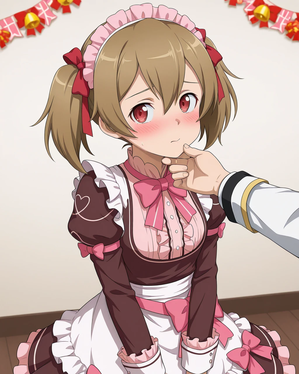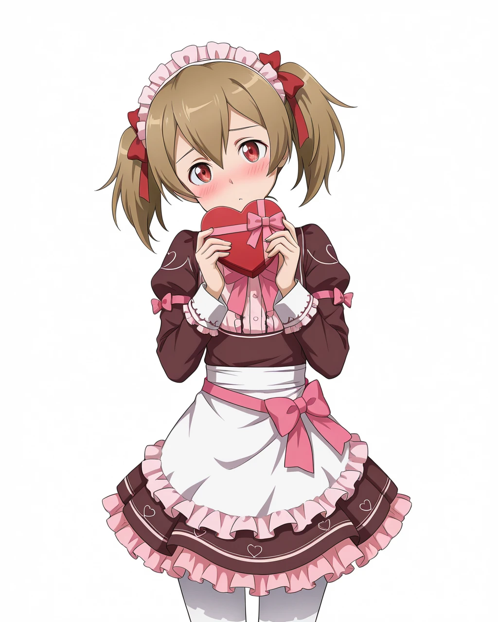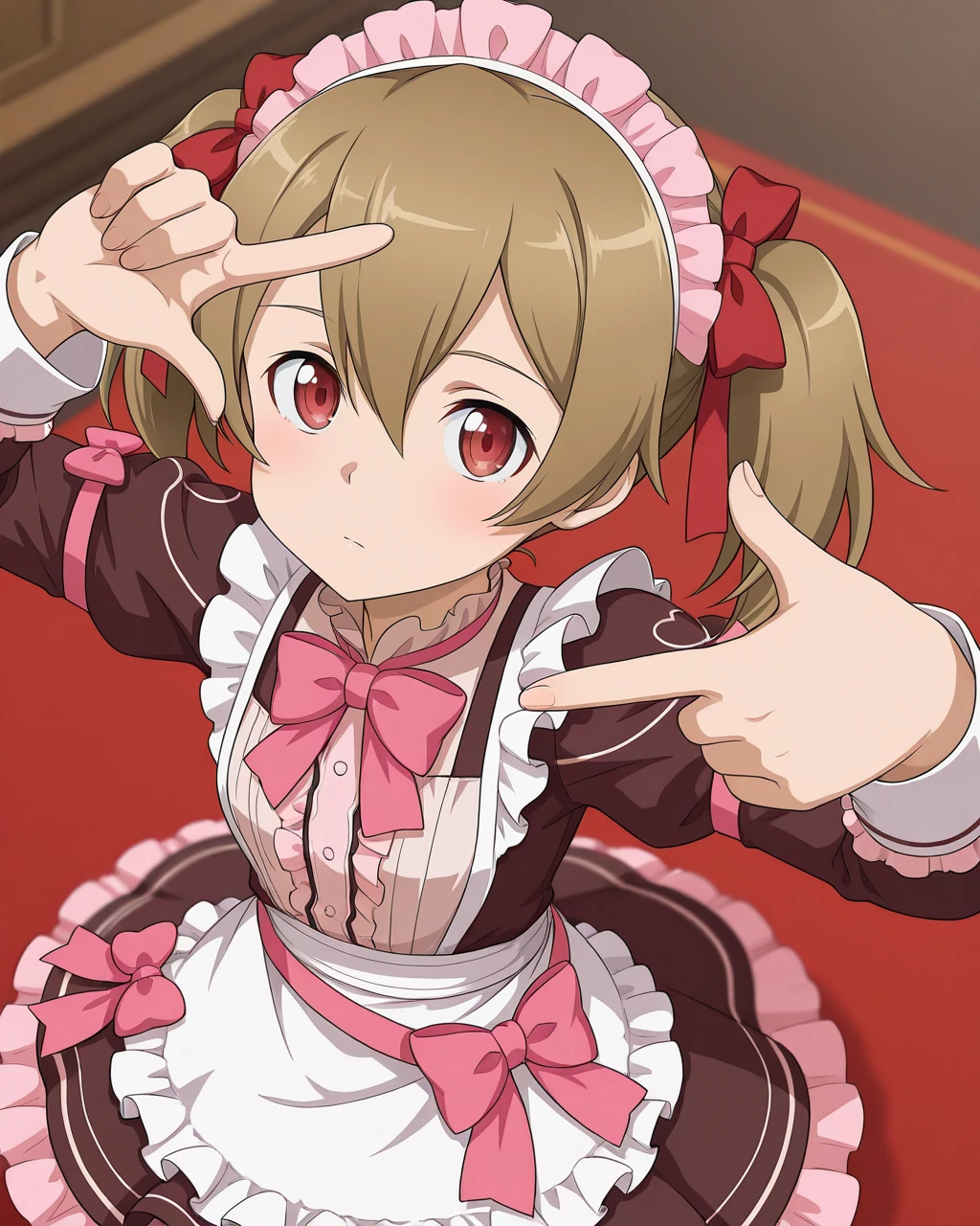 Silica_SAO, Silica_val, light brown hair, short twintails, red eyes, maid headdress, hair ribbon, red ribbon, 1girl, solo, brown dress, long sleeves, white apron, pink bowtie, waist bow, pink bow, frills, layered skirt, white pantyhose, ankle boots, brown footwear,