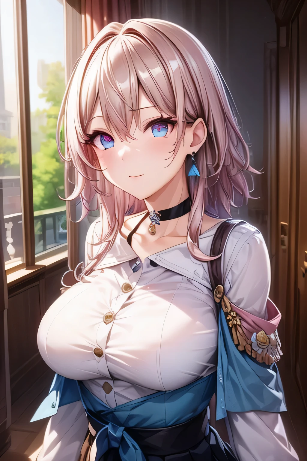 march_a, pink hair, short hair, bangs, multicolored eyes, blue eyes, pink eyes, large breasts,