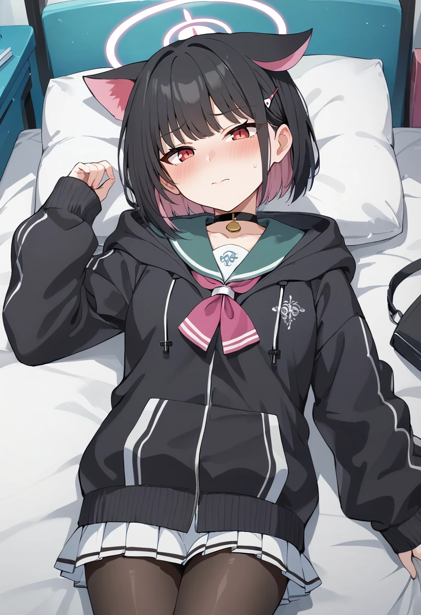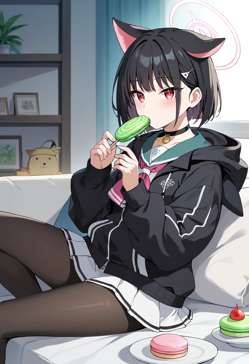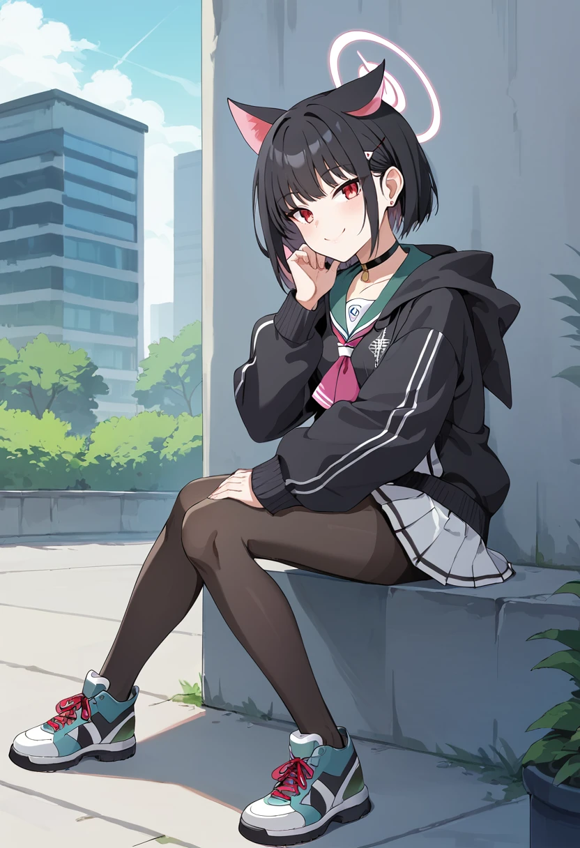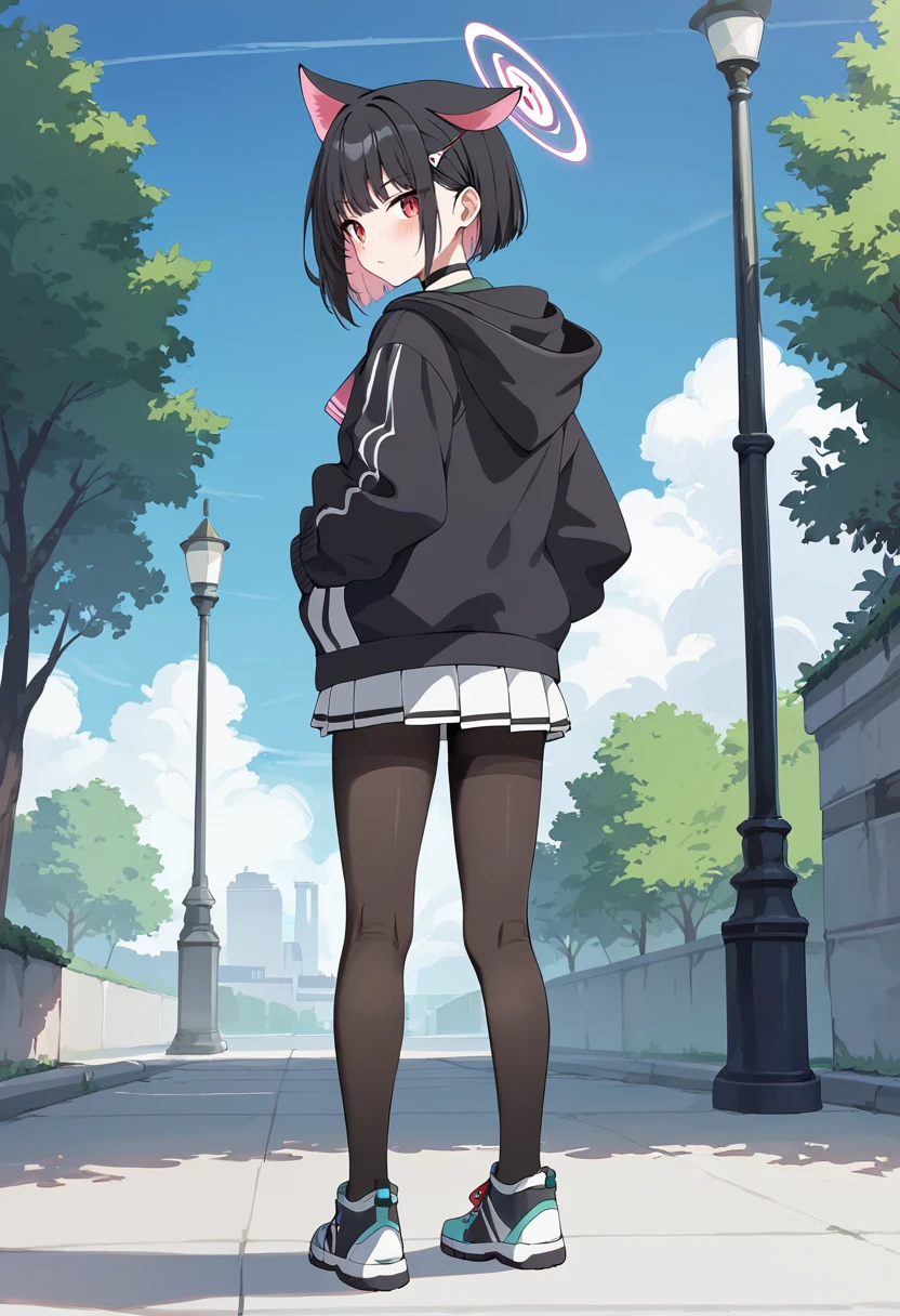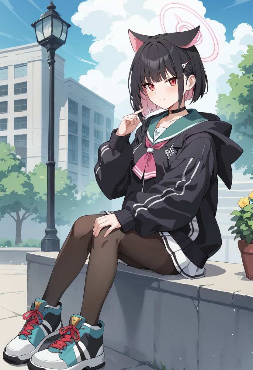 kazusa-default,kazusa \(blue archive\),red eyes,black hair, animal ears,halo,choker,(hooded jacket:1.1),black jacket,skirt,pantyhose, sneakers