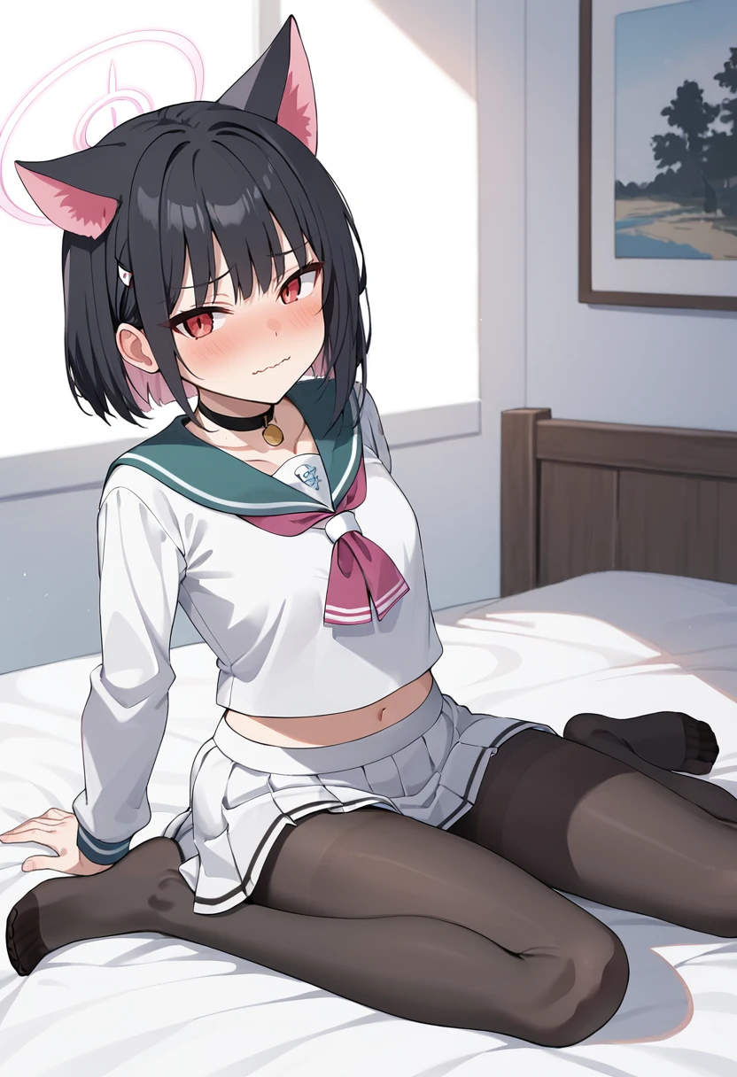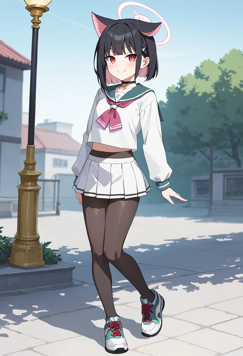 kazusa-shirt,kazusa \(blue archive\),flat chest,red eyes,black hair, animal ears,halo,choker,sailor collar,(white shirt:1.1),long sleeves,white skirt,pantyhose,sneakers