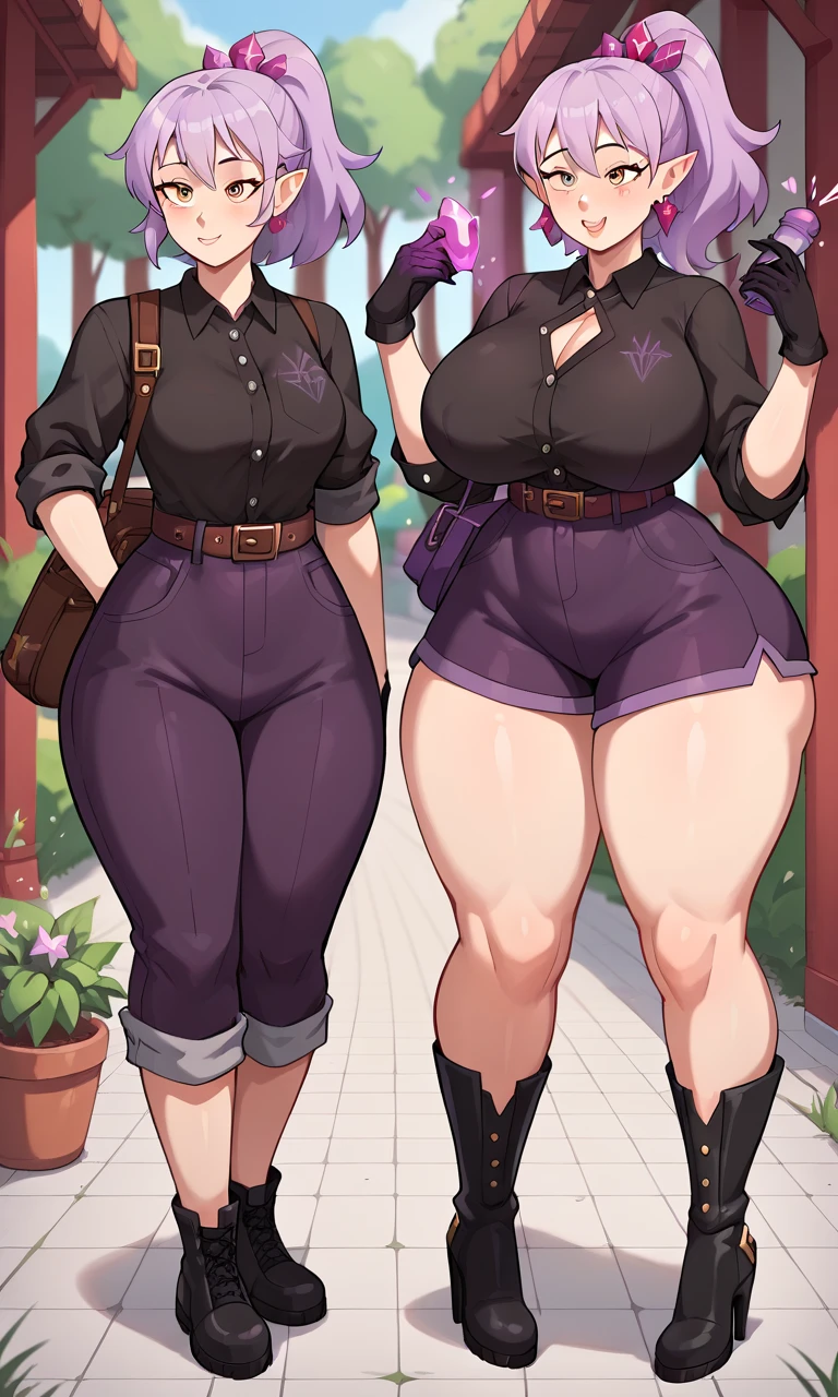 Amity blight, lavender hair, ponytail, black-collared dark gray button-up shirt, brown gardening gloves, lavender cross-body belt, three pointed magenta crystals, dark purple abomination-style pants, black high-heeled boots, tattoo, purple flask, earrings,