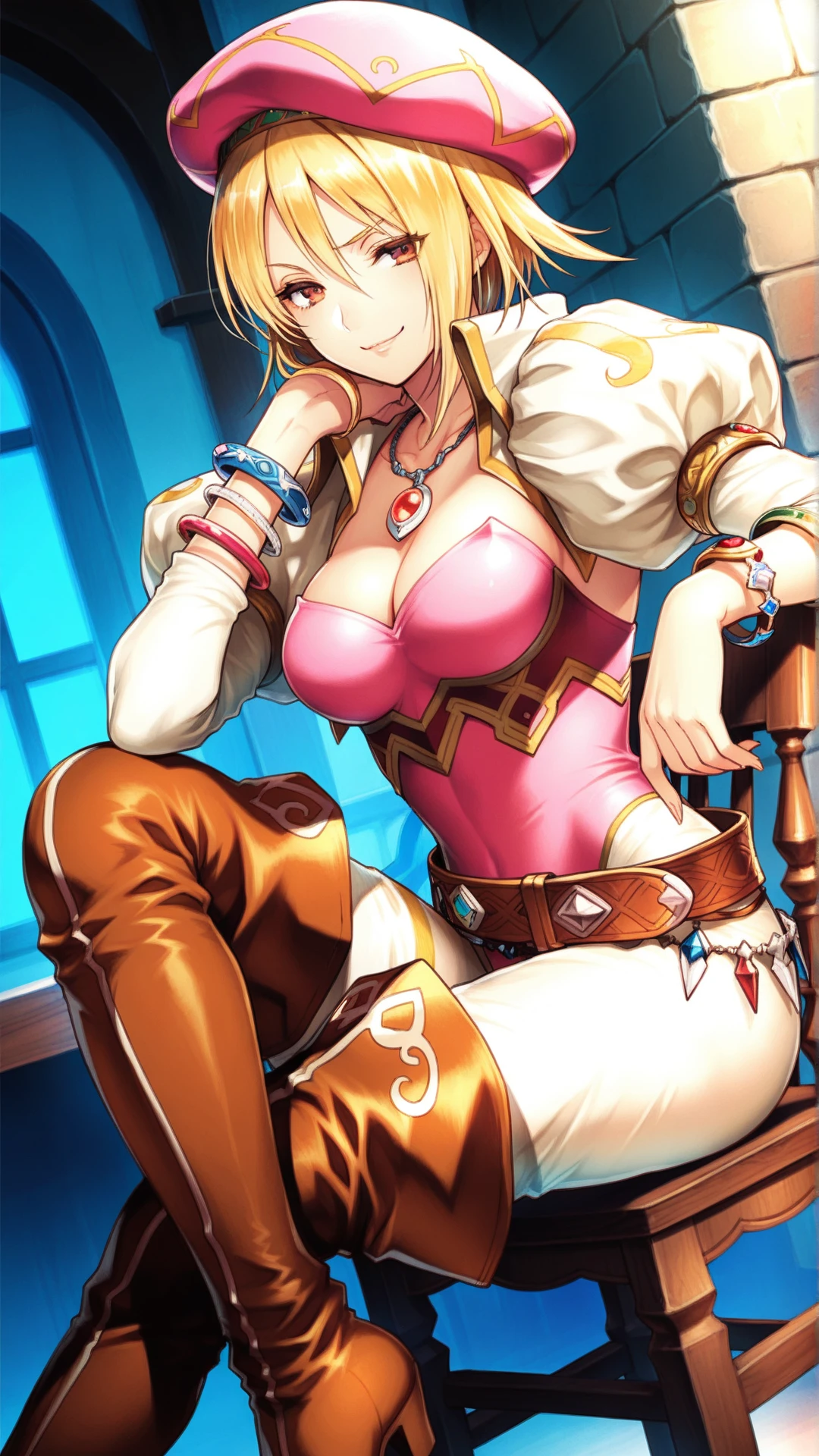 cleavage, thigh boots, puffy sleeves, leotard, jewelry, necklace, bracelet,