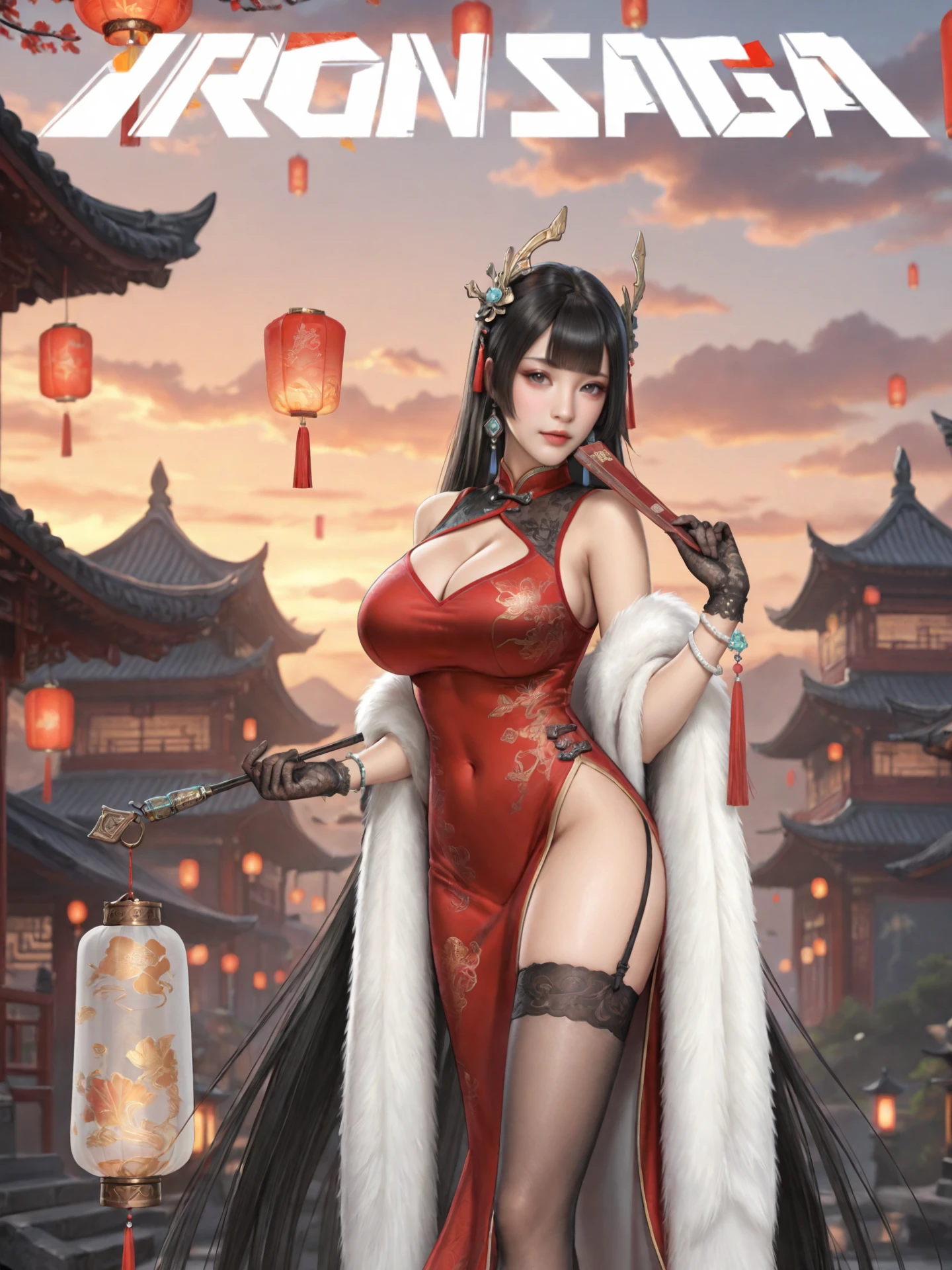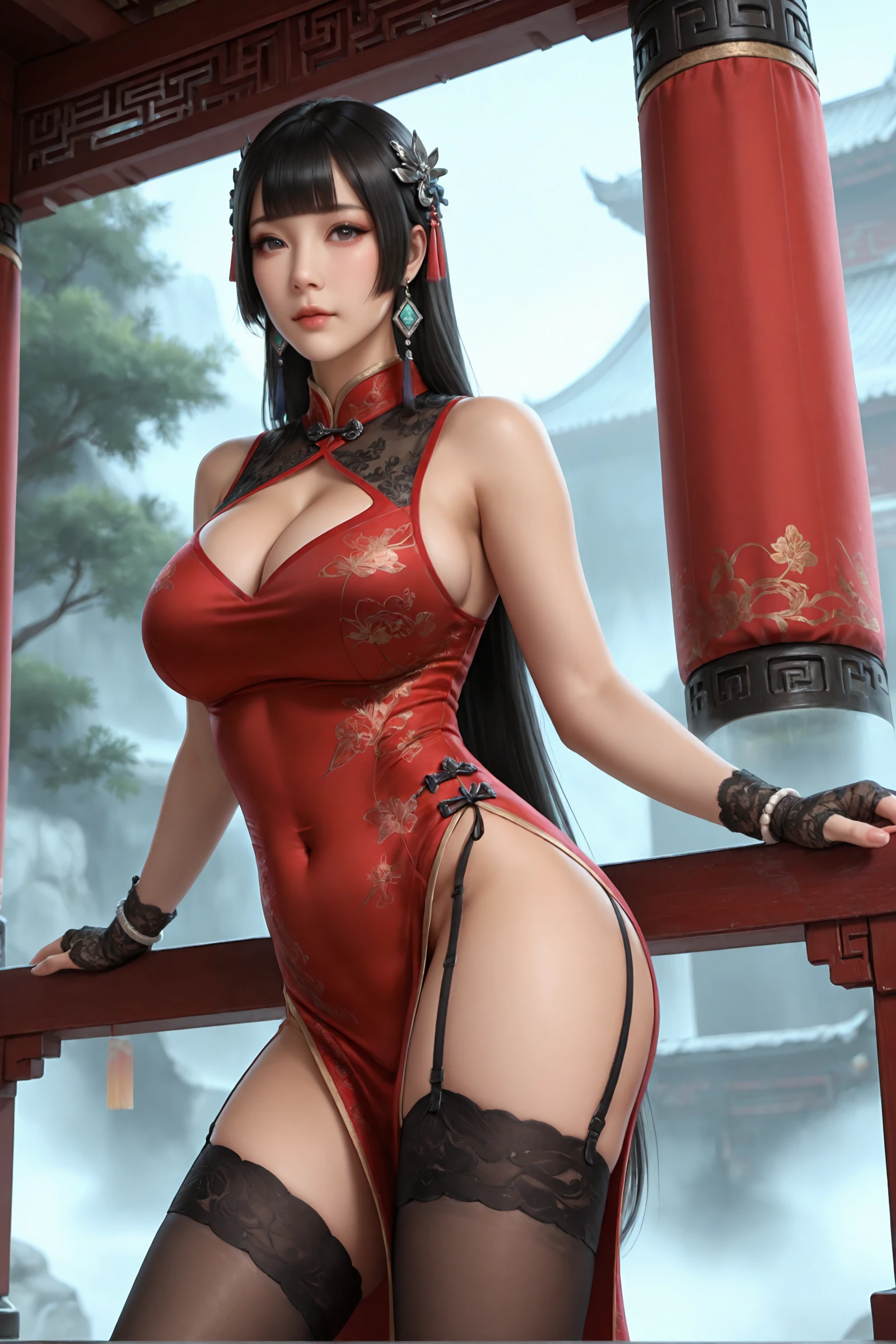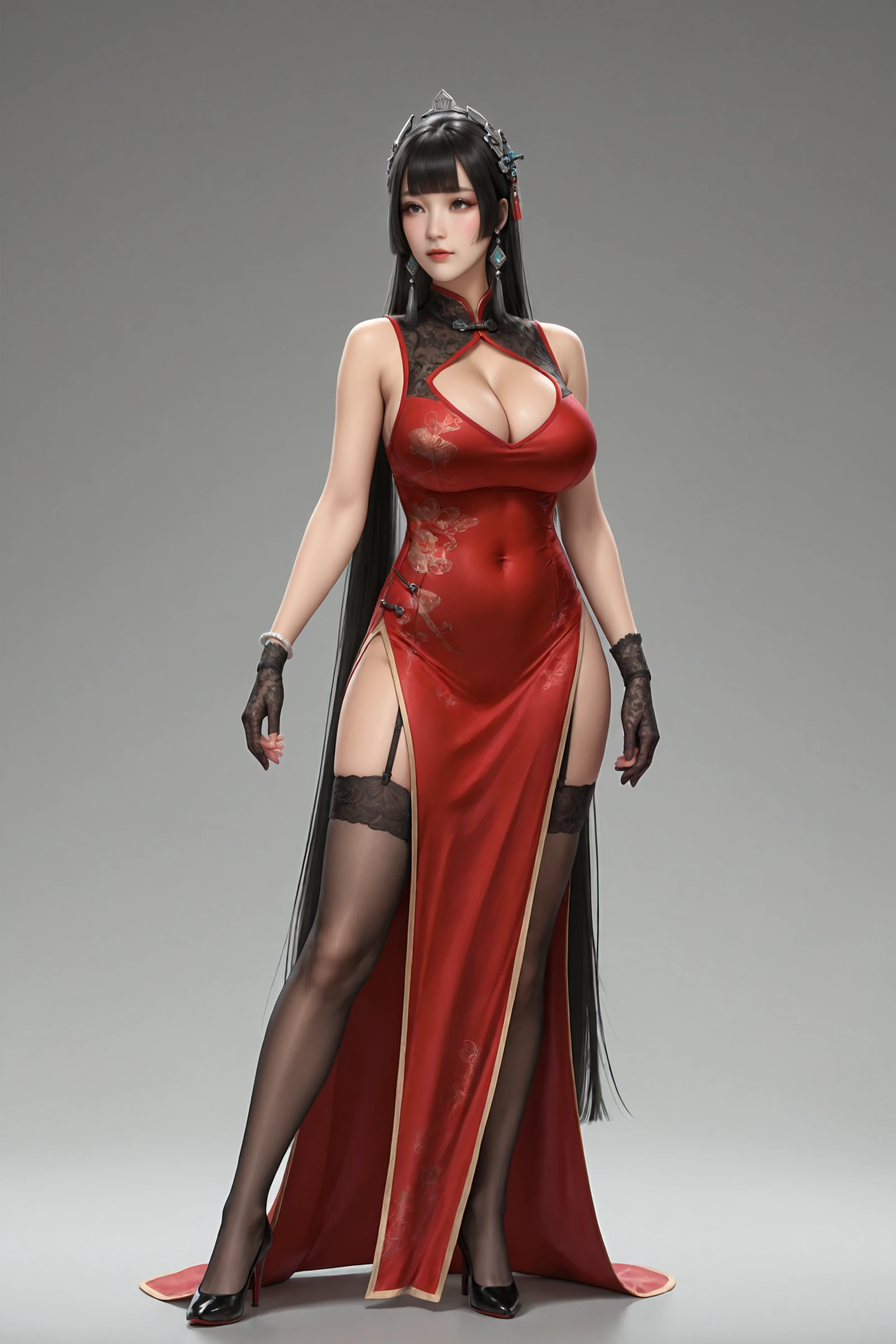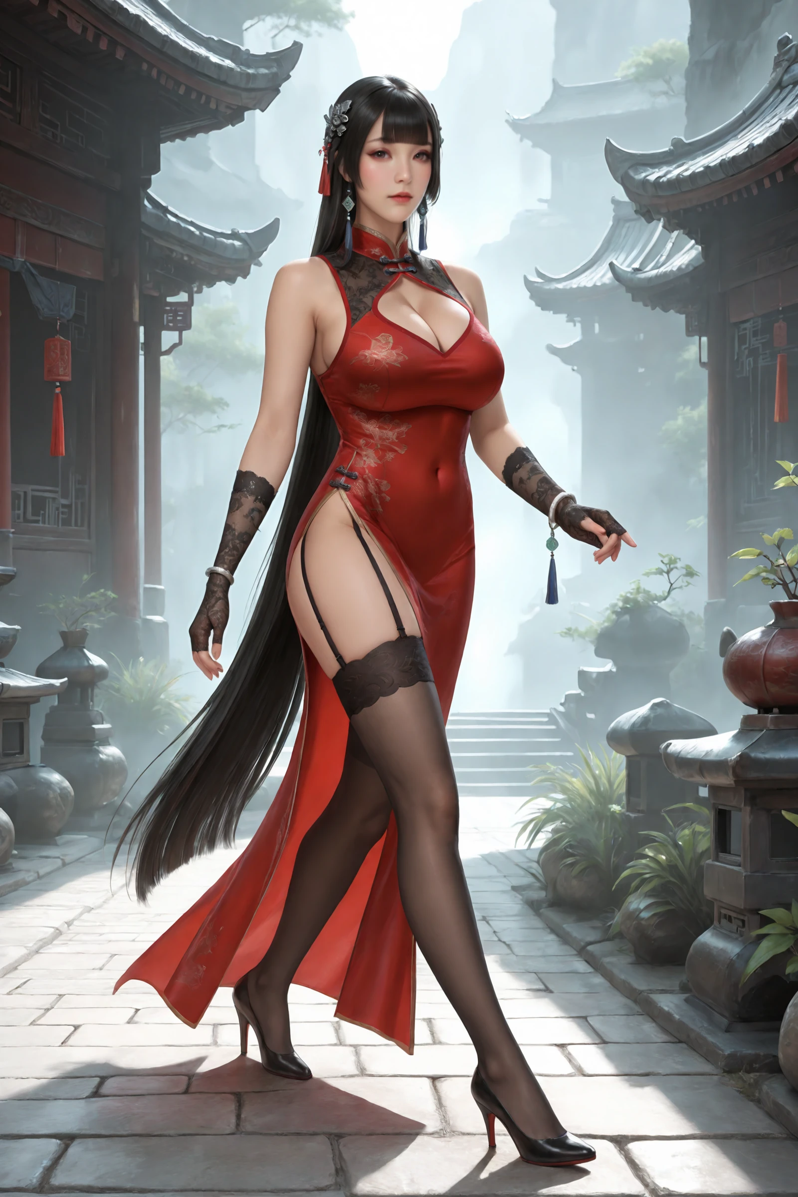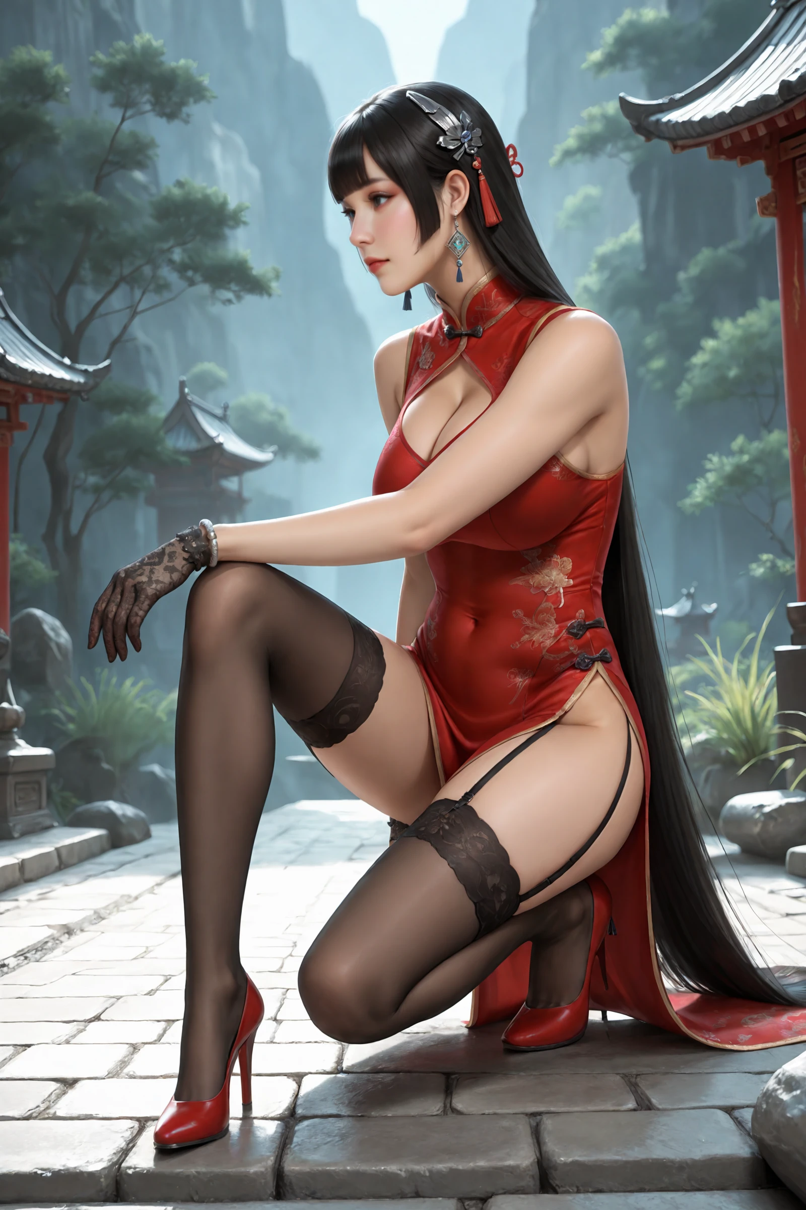 very_long_hair,black_hair,blunt_bangs,jewelry,hair_ornament,earrings,headwear, large_breasts,cleavage_cutout,covered_navel,side_slit,bare_shoulders,lace_trim, red china_dress,lace_gloves,sleeveless,bracelet,garter_straps,thighhighs, high_heels,