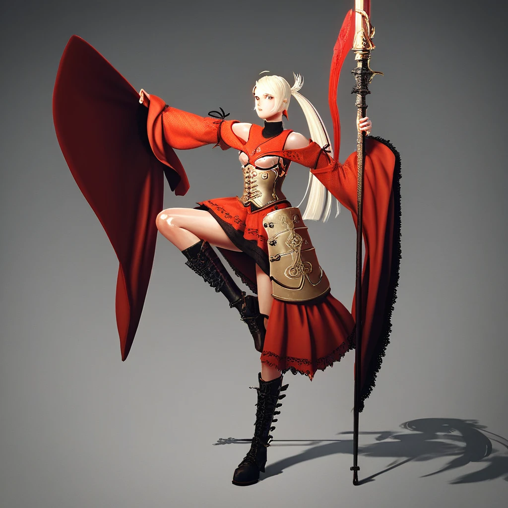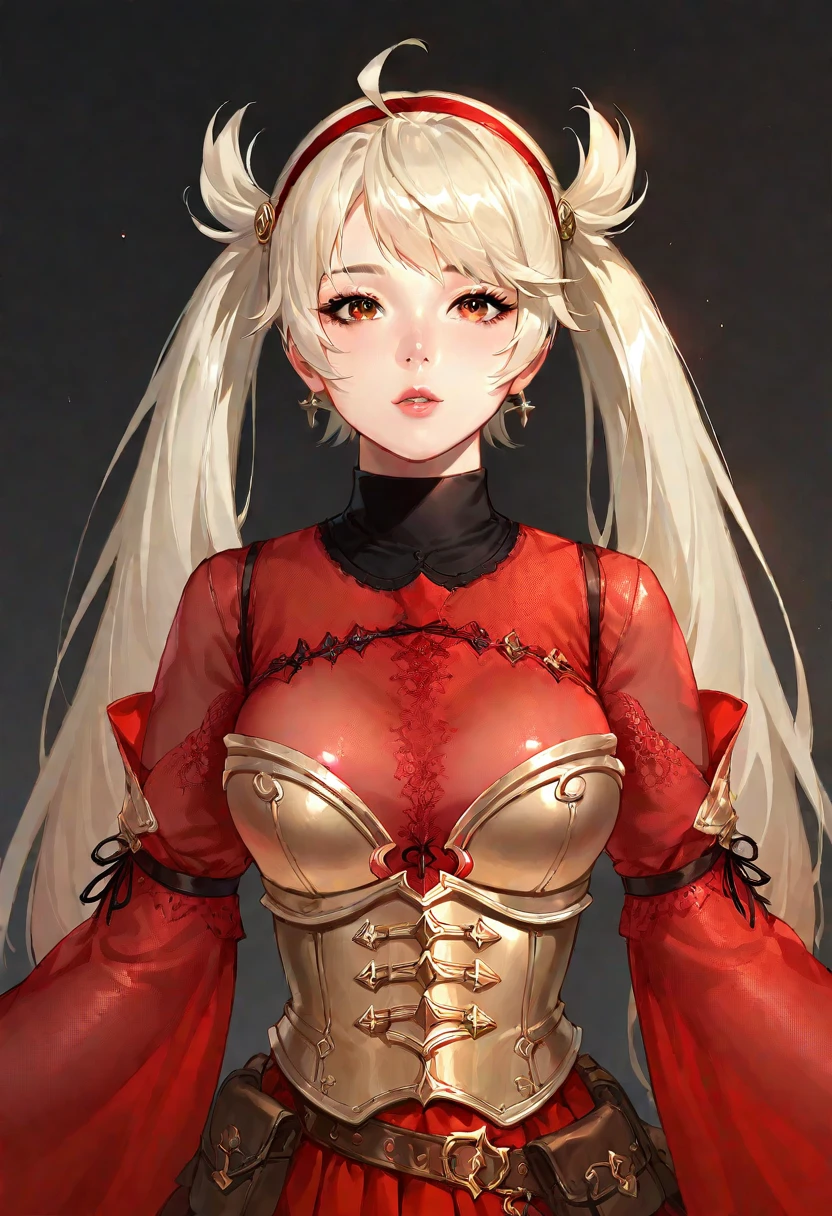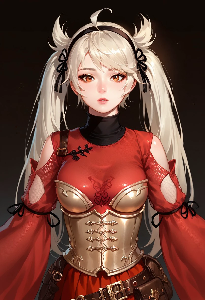 lynn_(mabinogi), lynn_outfits_1, 1girl, solo, long hair, twintails, lips, red eyes, brown eyes, ahoge, clothing cutout, hairband, boots, thighhighs, breasts, corset, red dress, wide sleeves, see-through, gloves, high heels, platform footwear, fishnets, skirt, garter straps, hairband, armor,Red Pirate = lynn_outfits_2