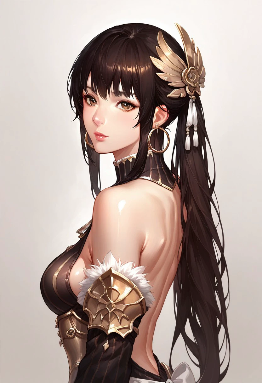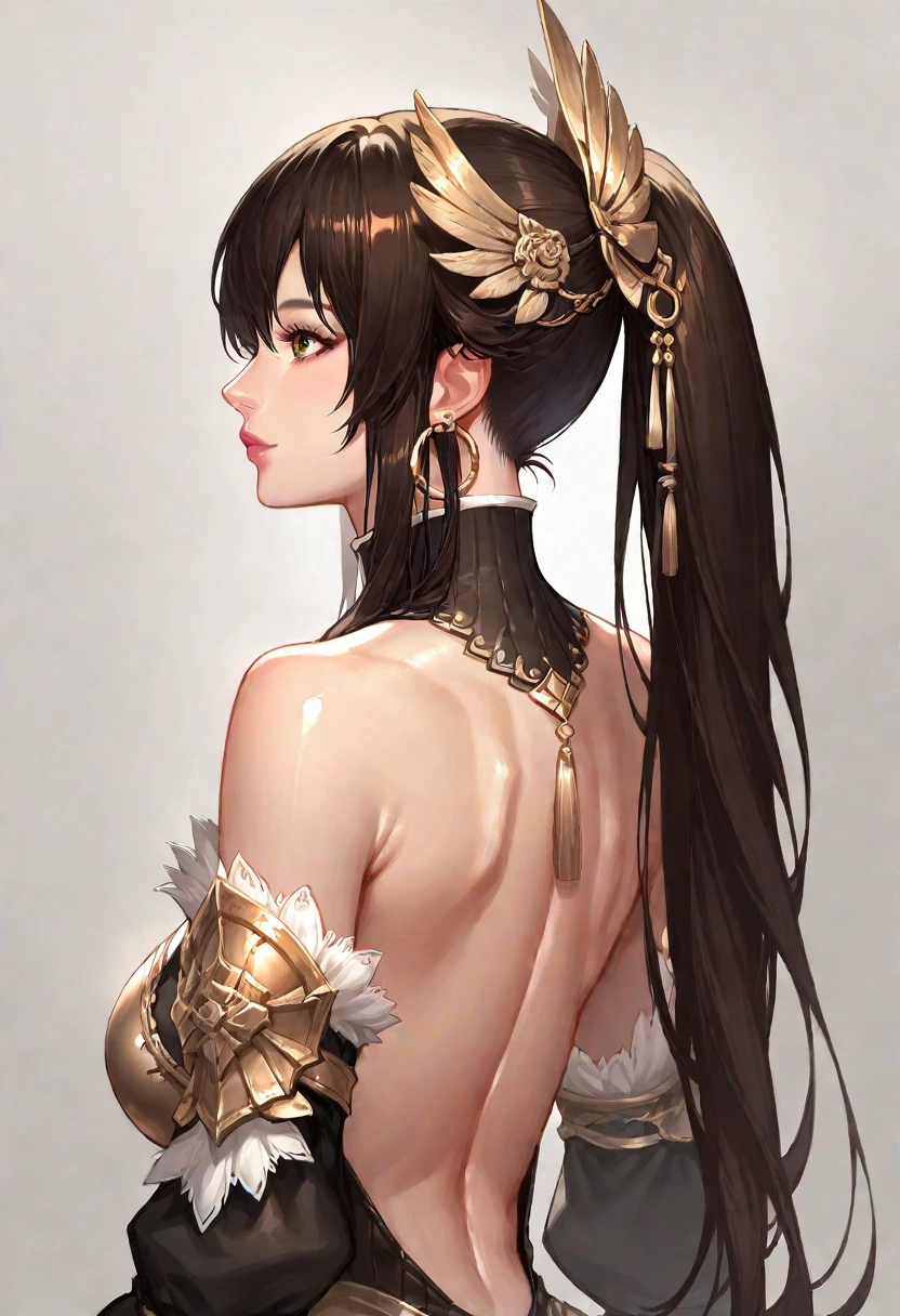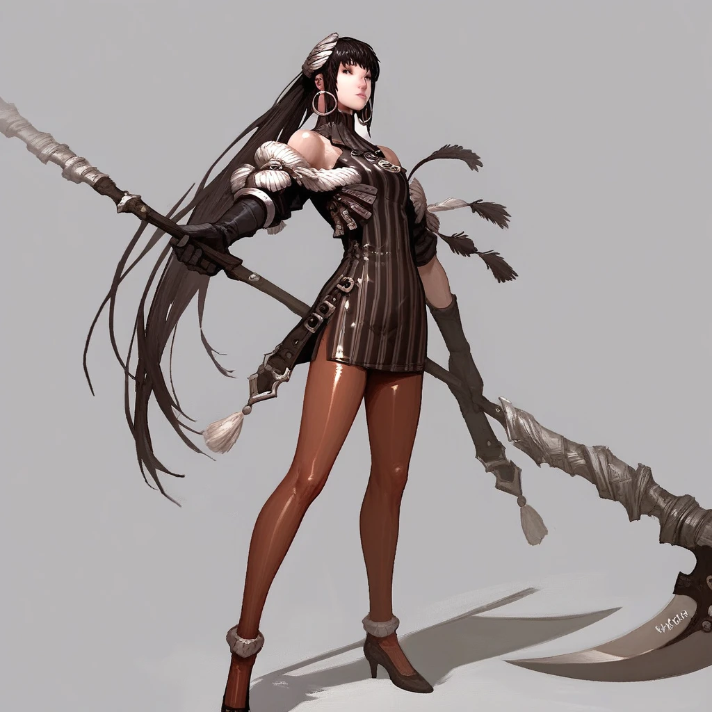 evy_(mabinogi), evy_outfits_1, 1girl, solo, long hair, brown hair, black hair, ponytail, lips, brown eyes , pantyhose, jewelry, earrings, hoop earrings, high heels, dress, armor, bare shoulders, detached sleeves,Green Pirate = evy_outfits_2