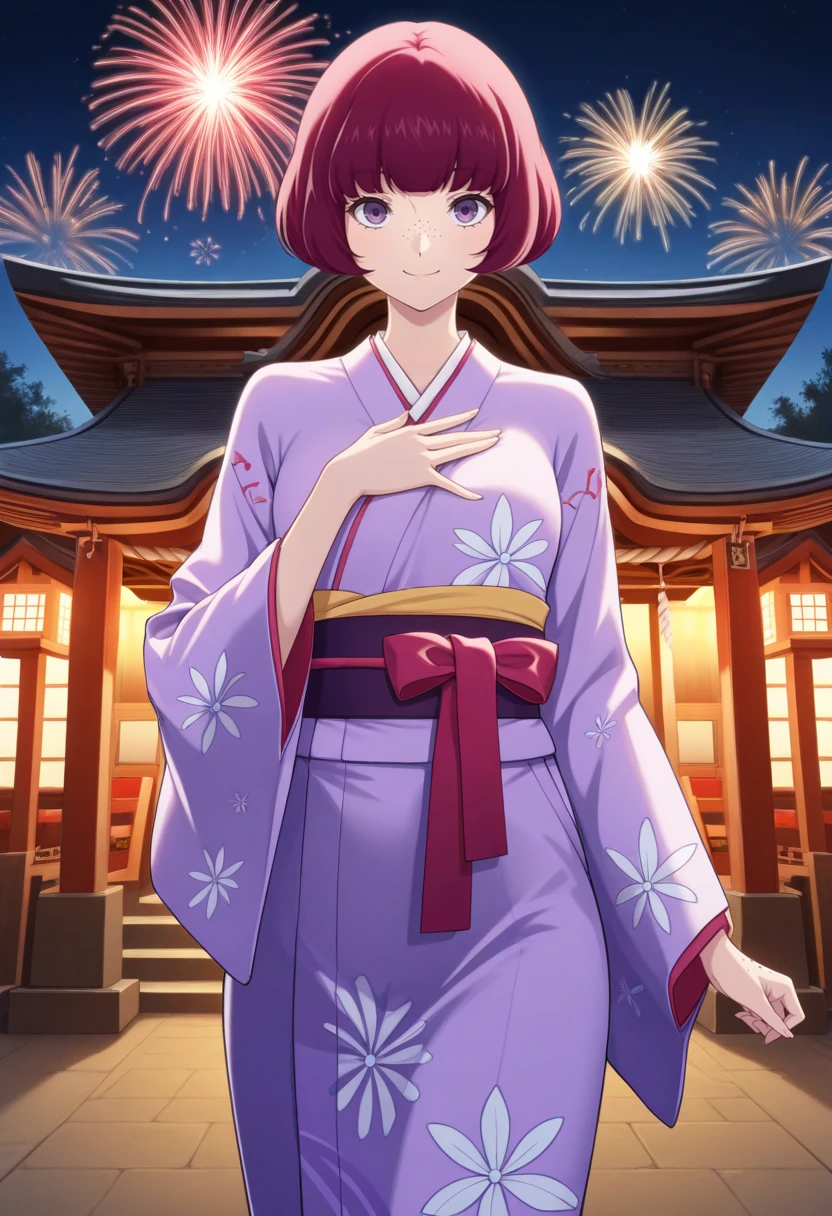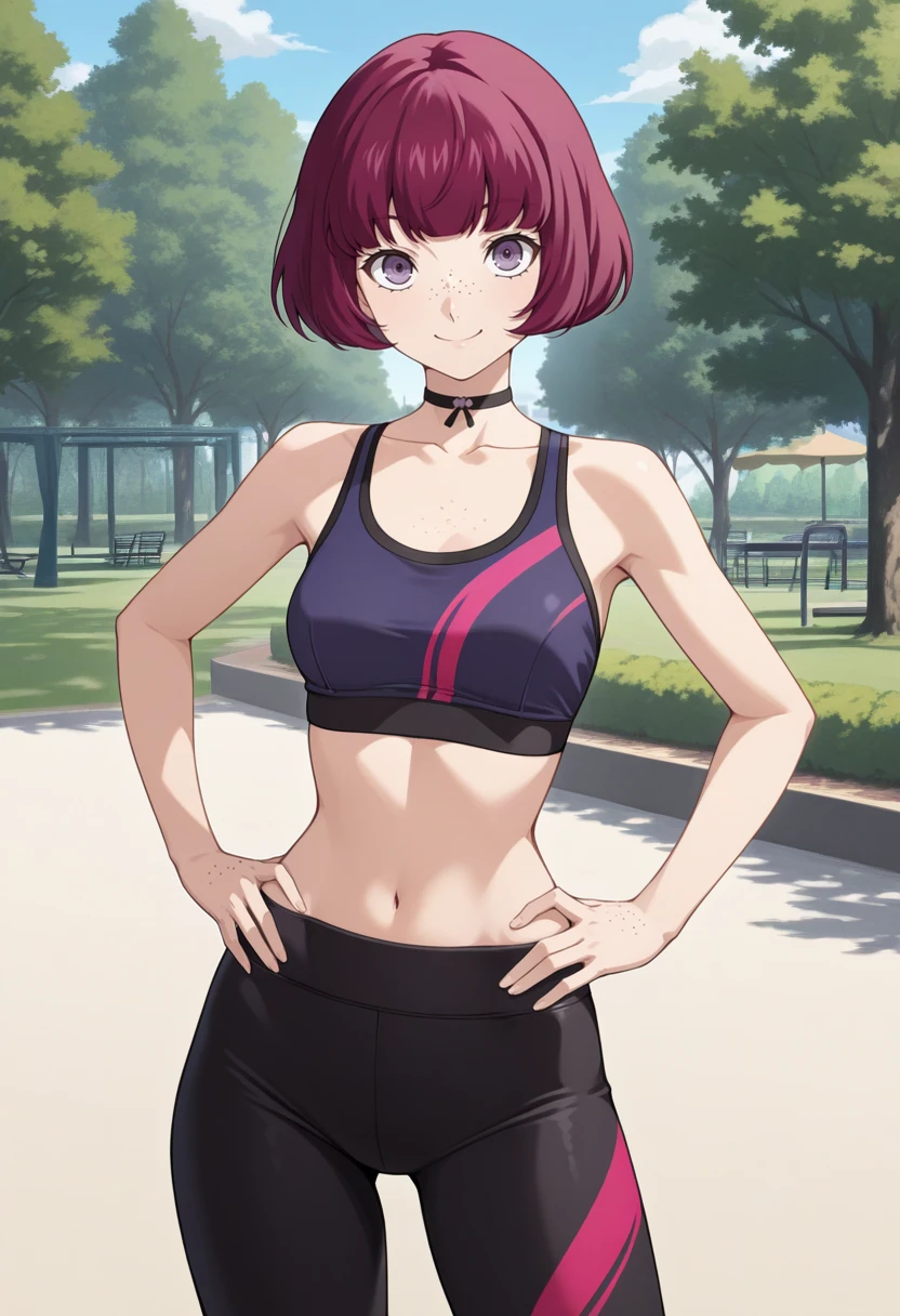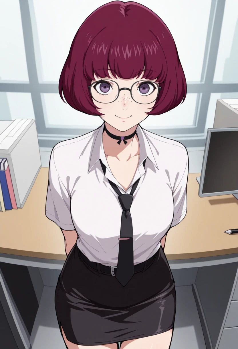 h1ran0p5x, magenta hair, bob cut, purple eyes, freckles, choker, purple jacket, grey shirt, grey skirt, black kneesocks,